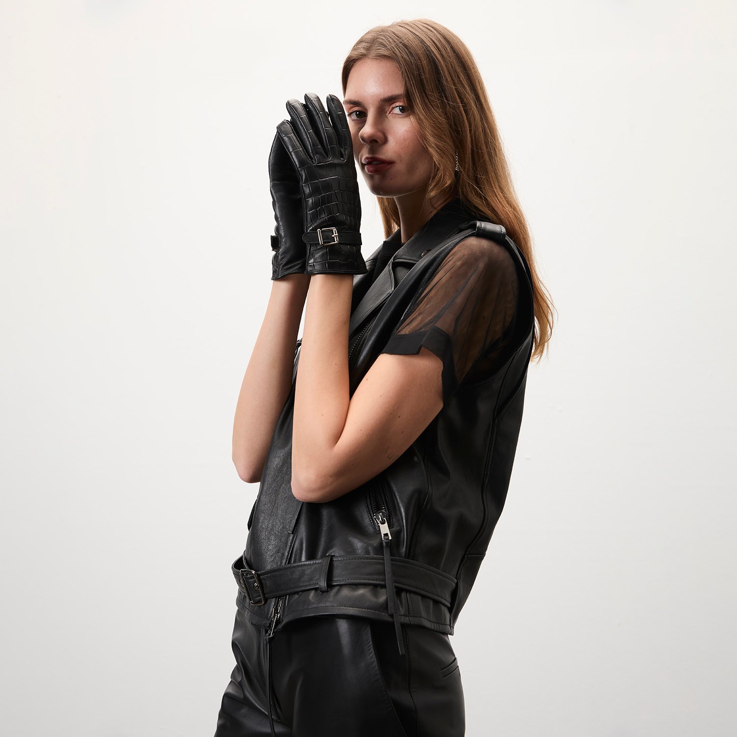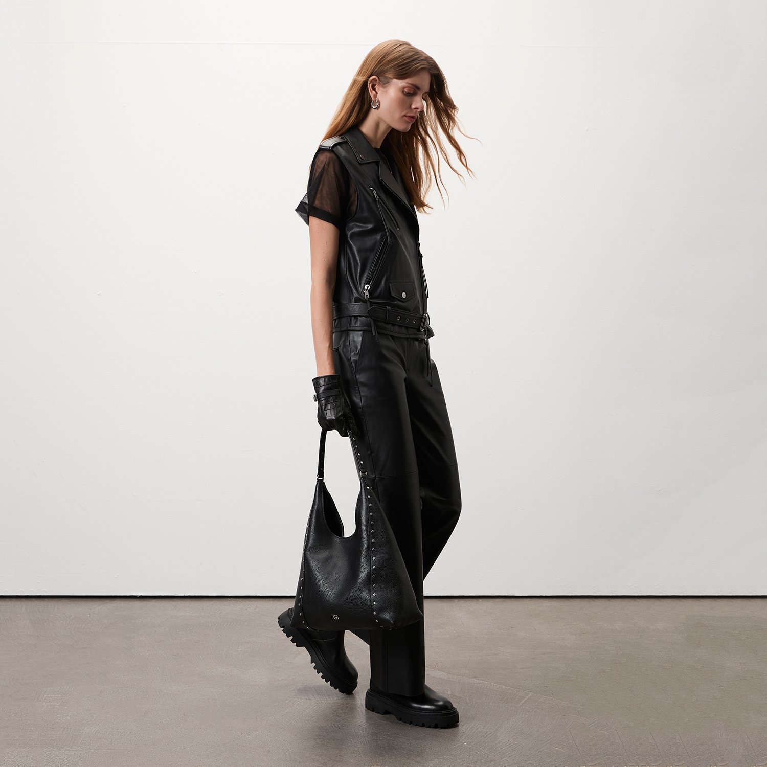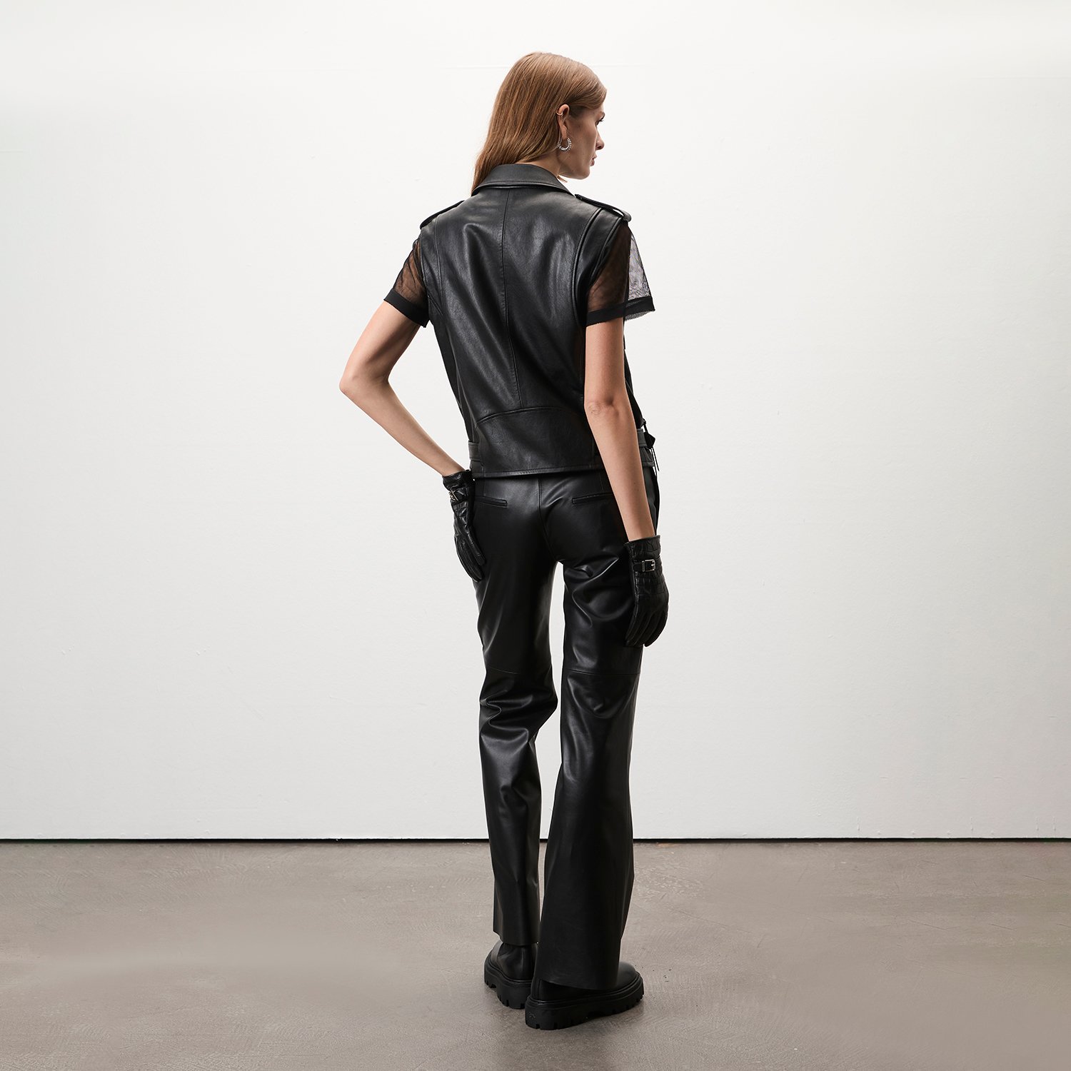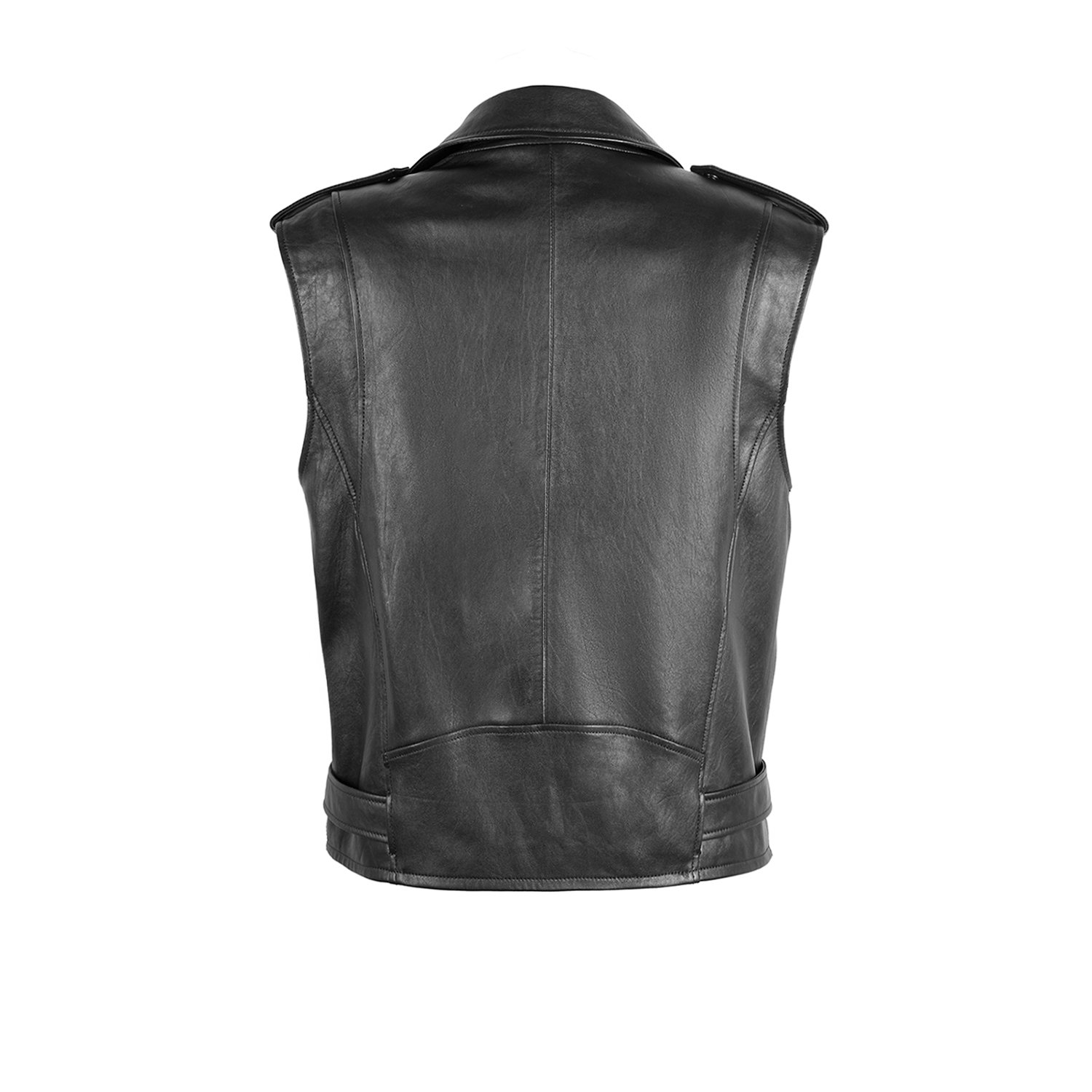 Kadın yakalı, kendinden kemerli deri biker yelek.