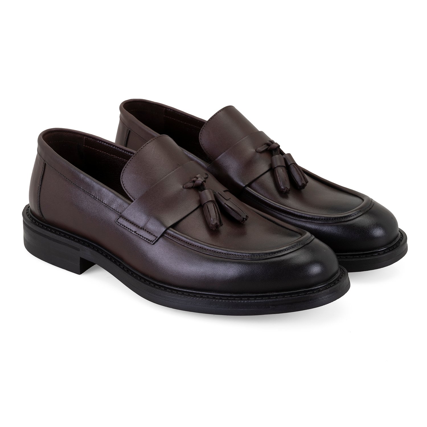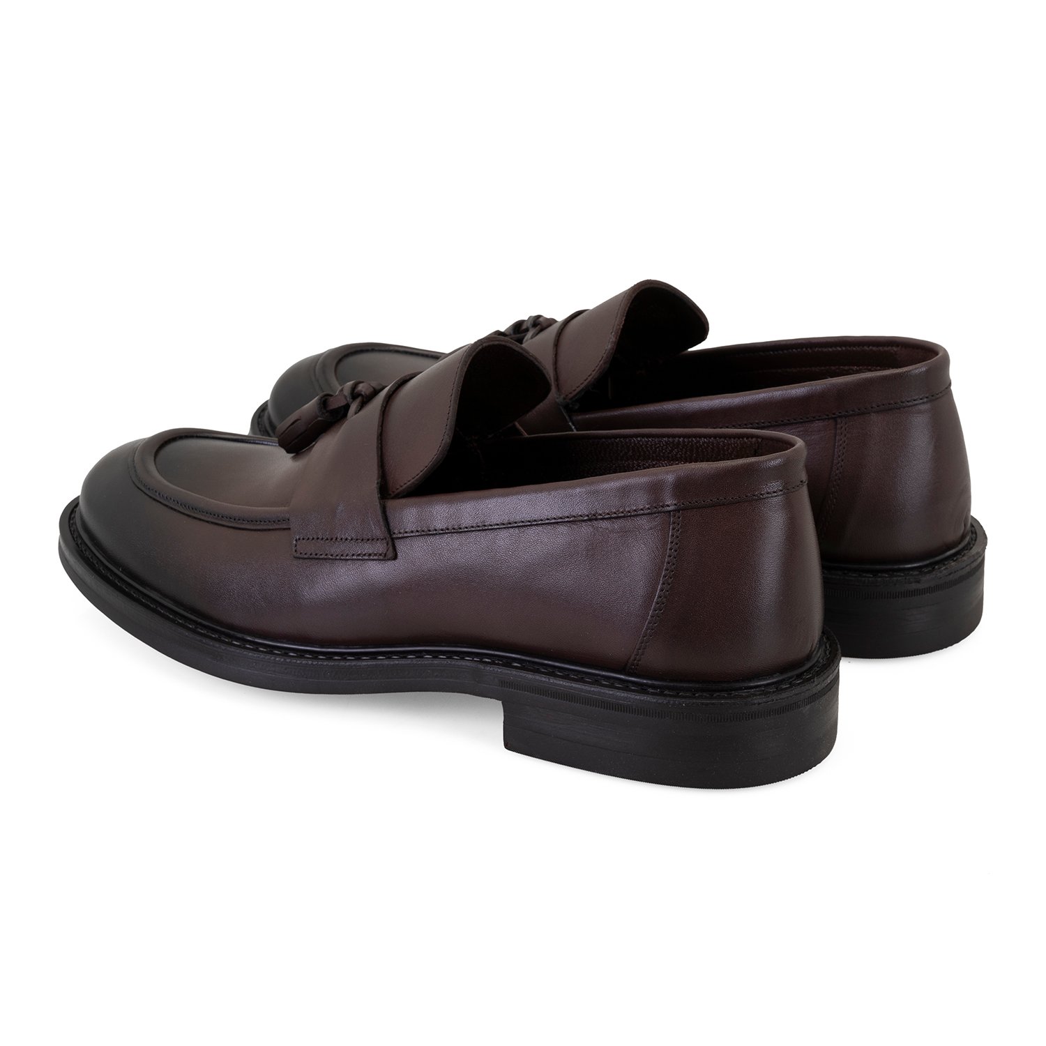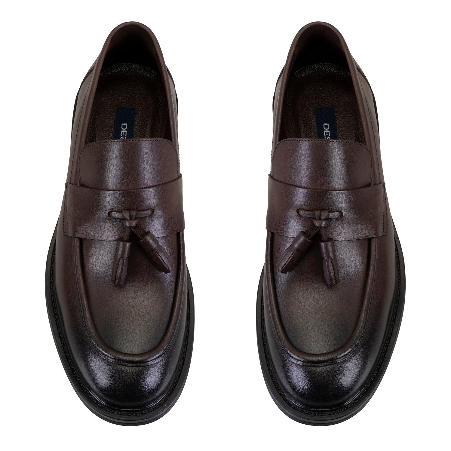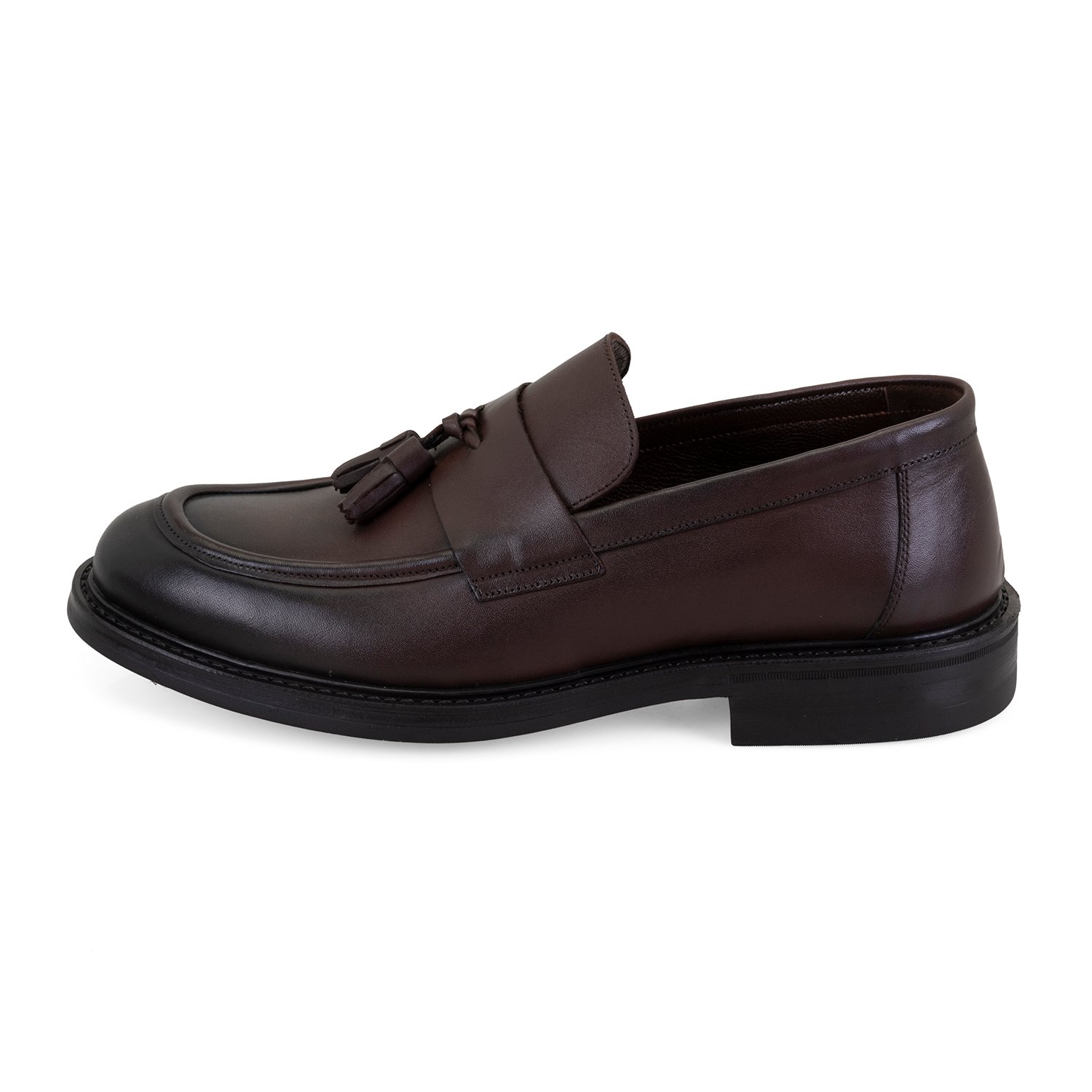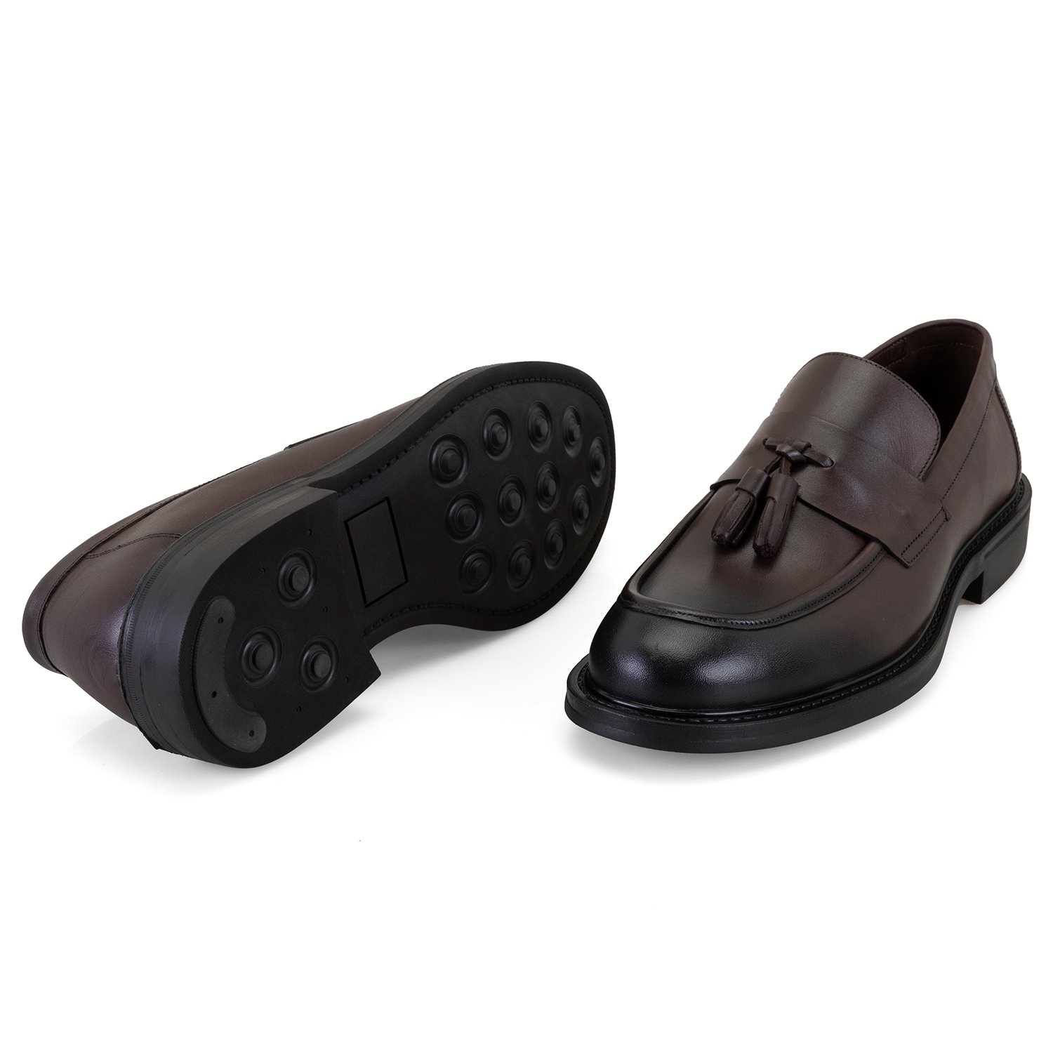 %100 deri, deri iç tabanlı, deri astarlı, kauçuk tabanlı, püsküllü erkek loafer.