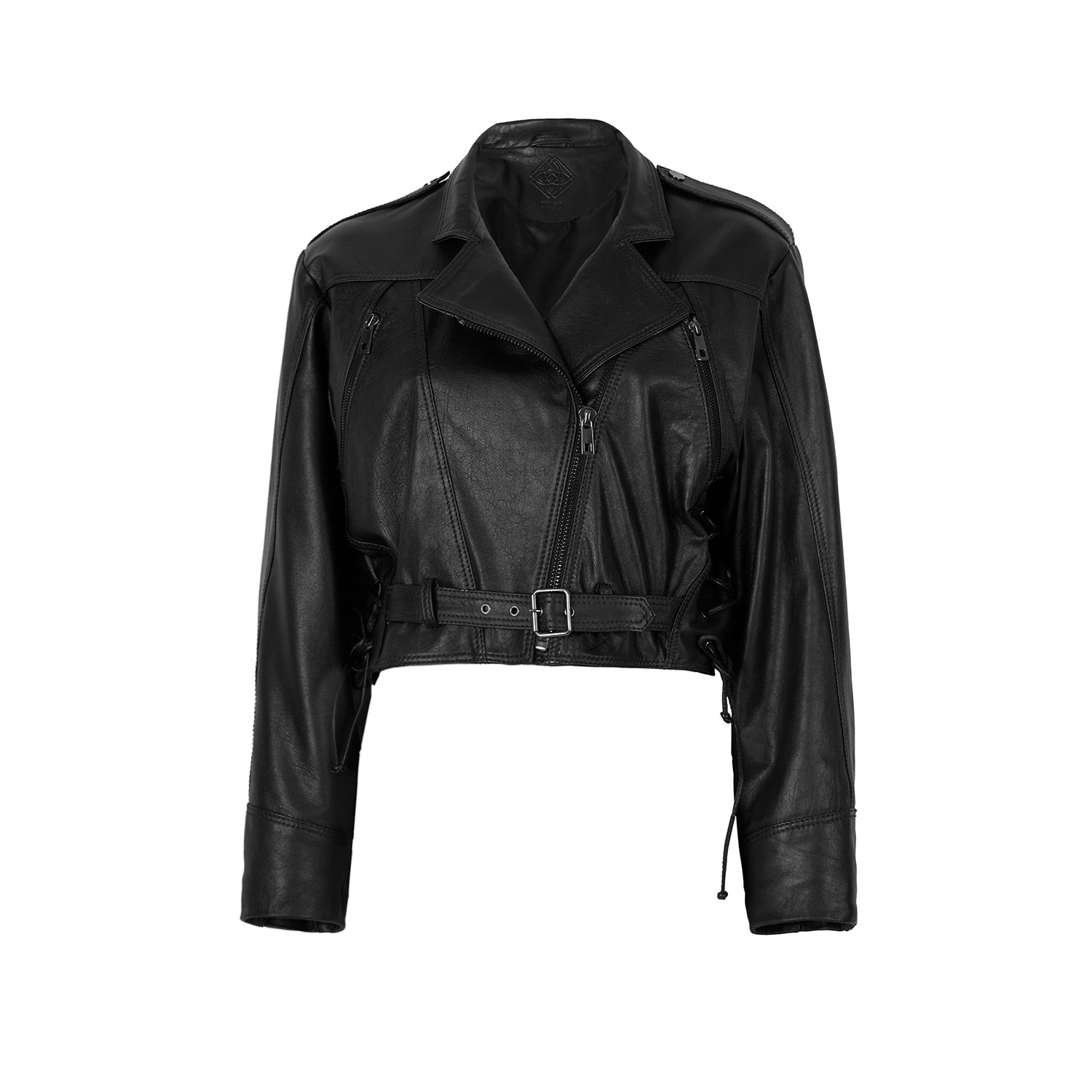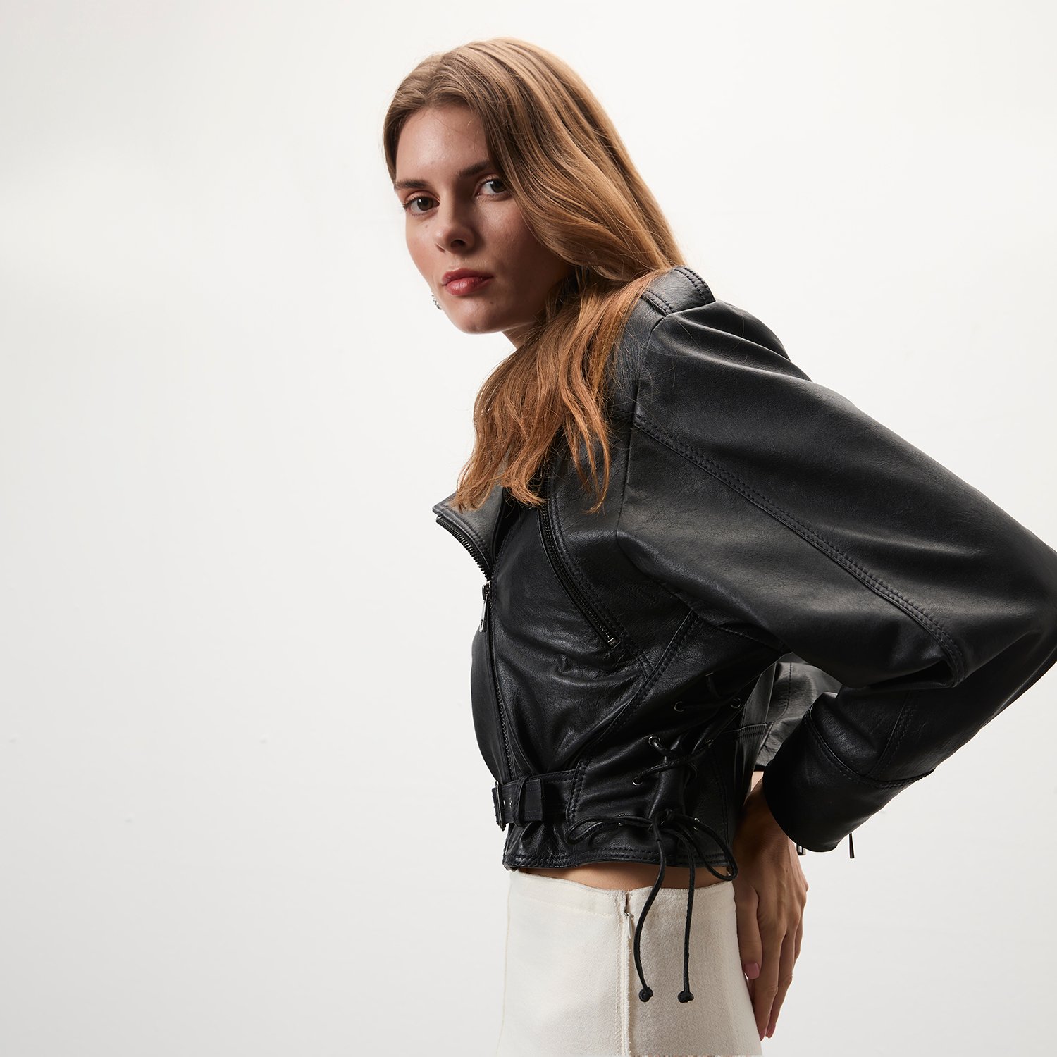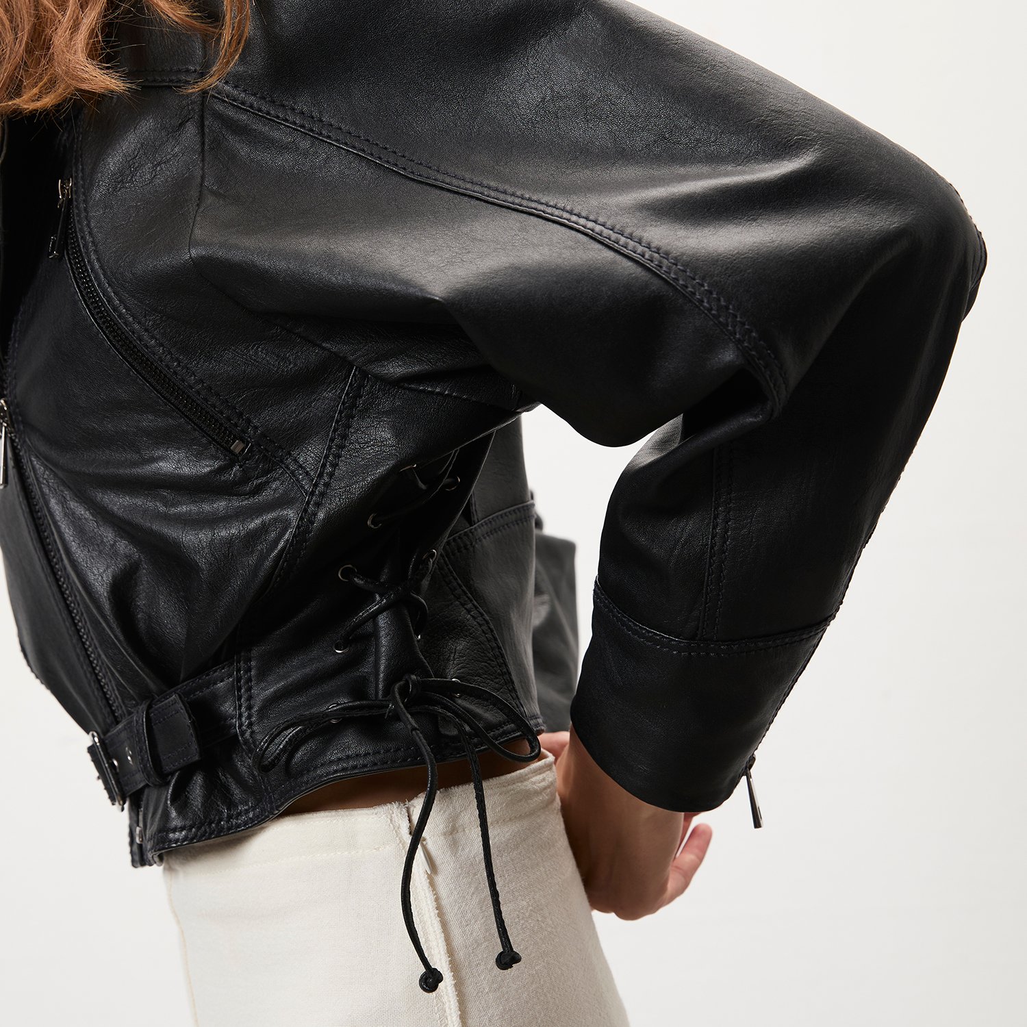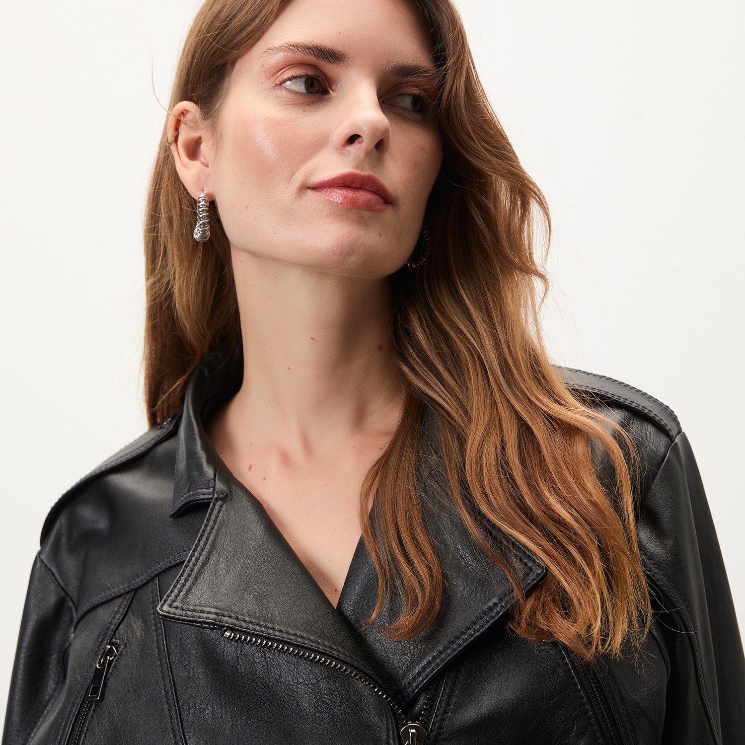 Kadın yakalı, kendinden kemerli oversize biker deri ceket.