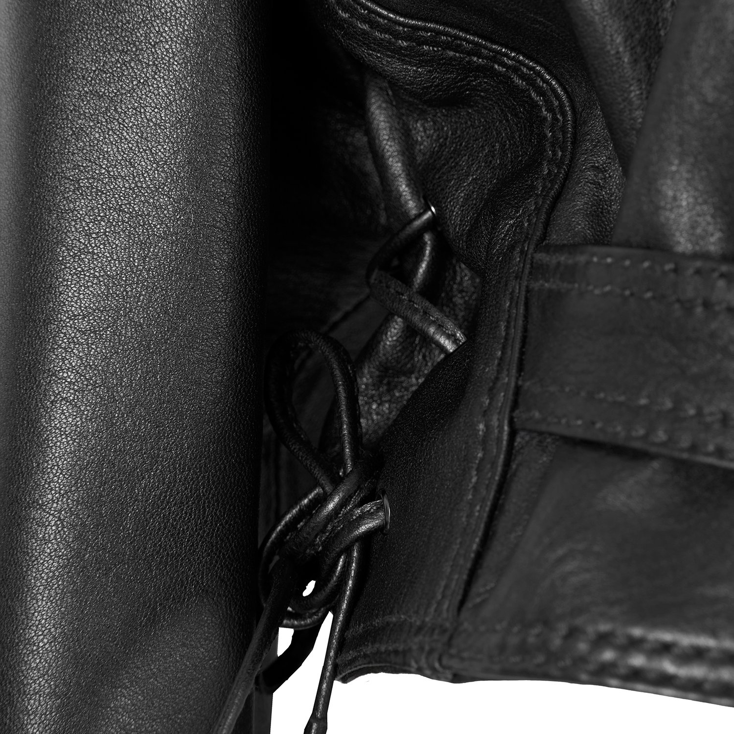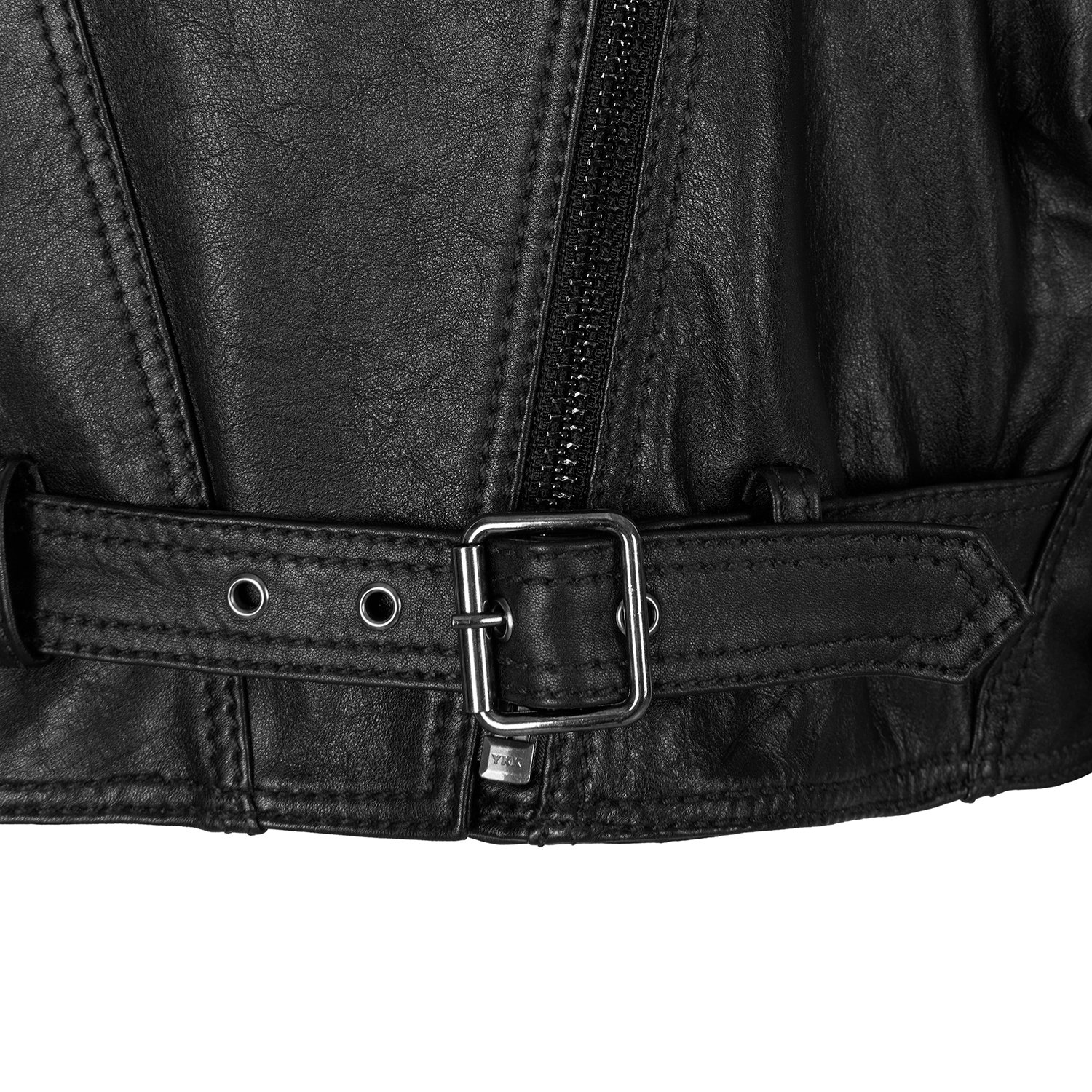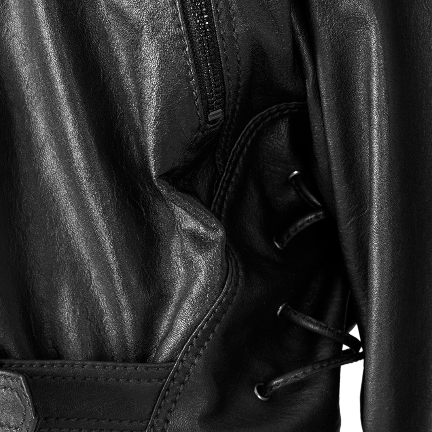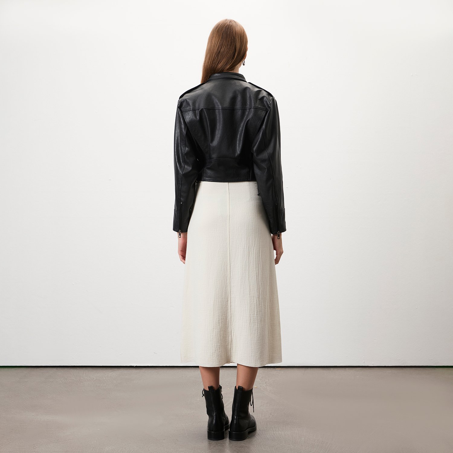Kadın yakalı, kendinden kemerli oversize biker deri ceket.