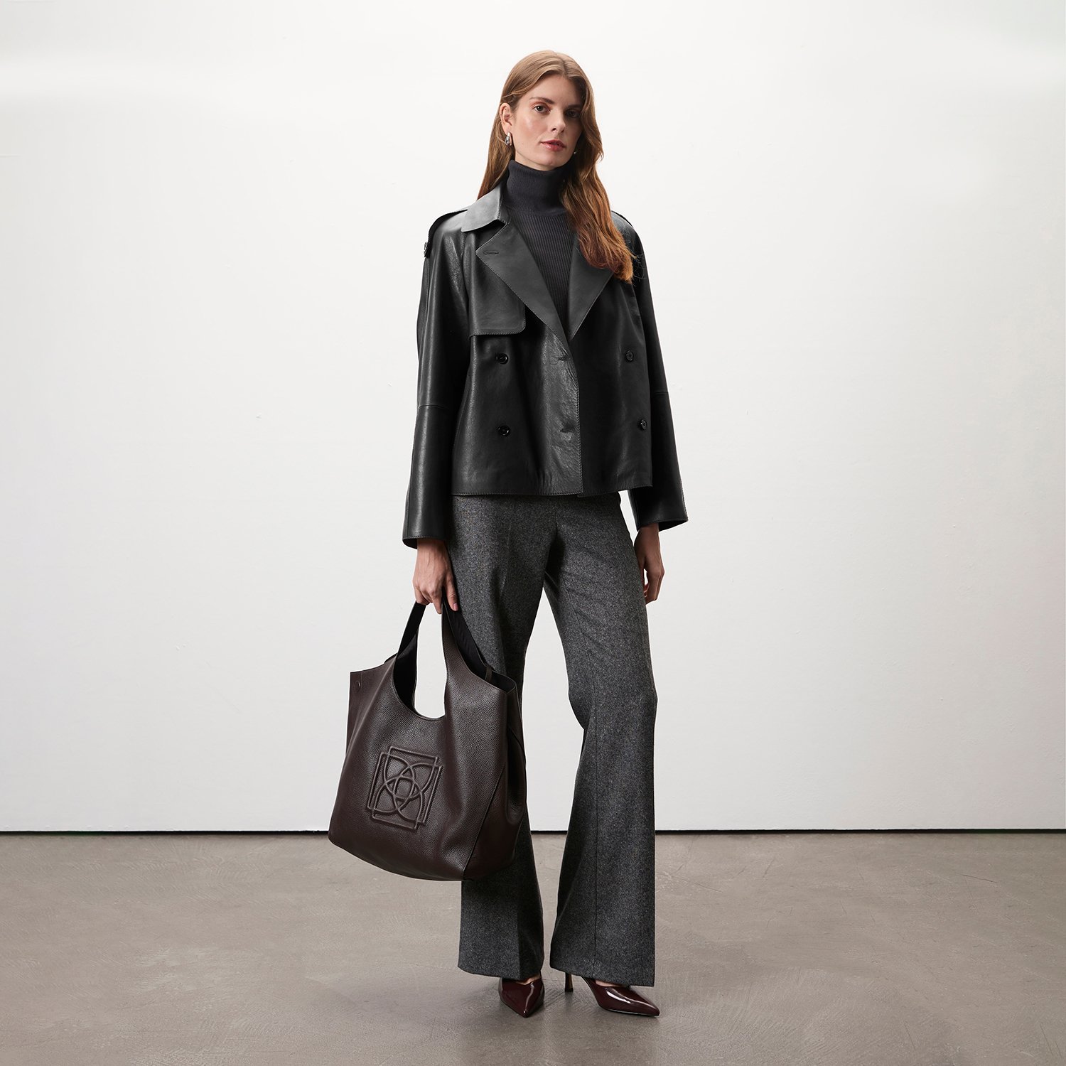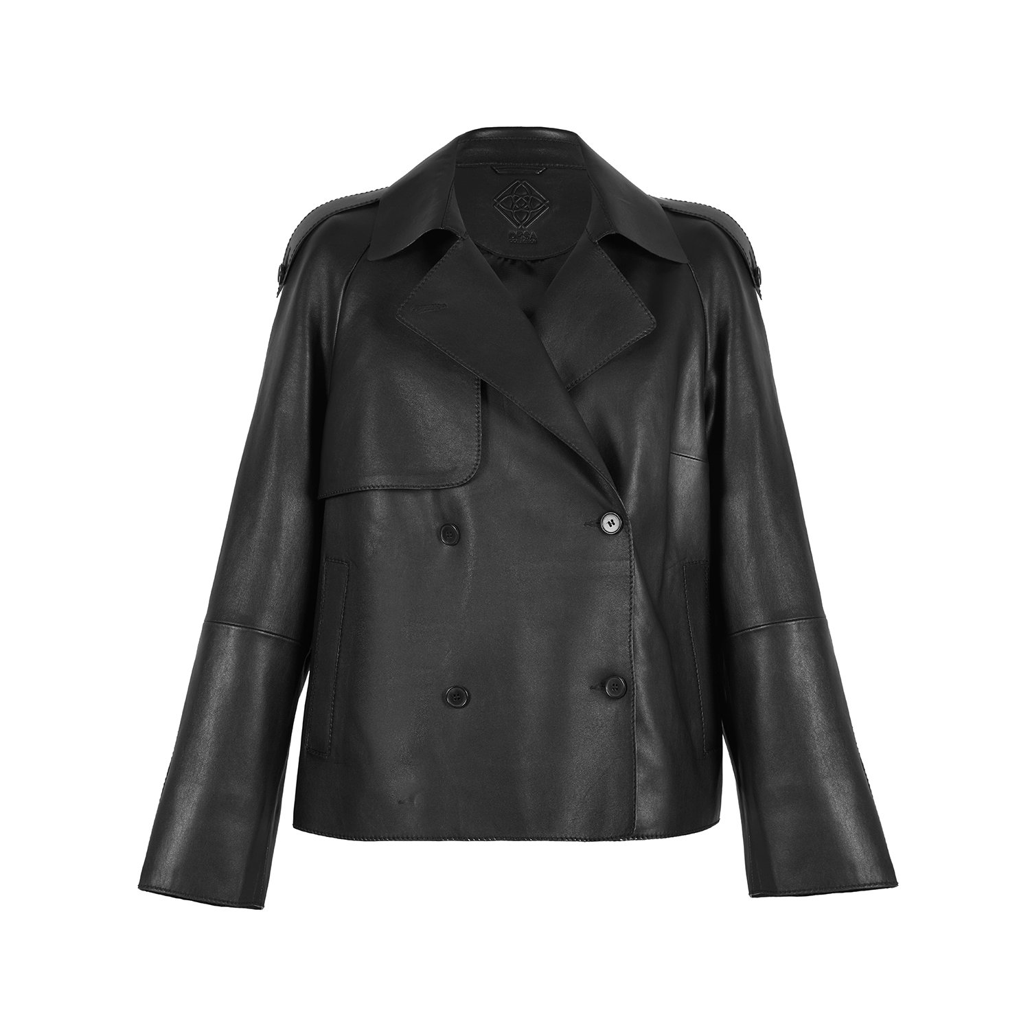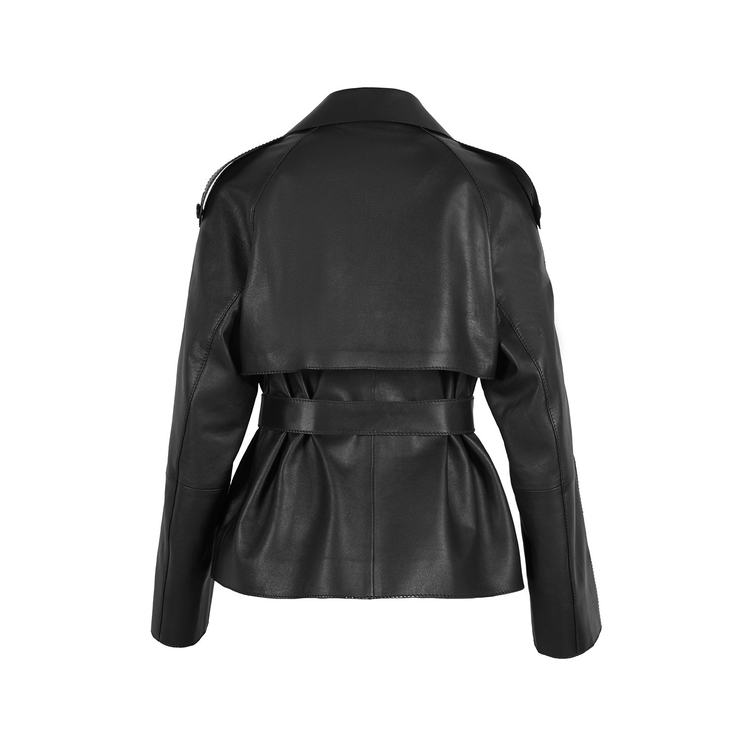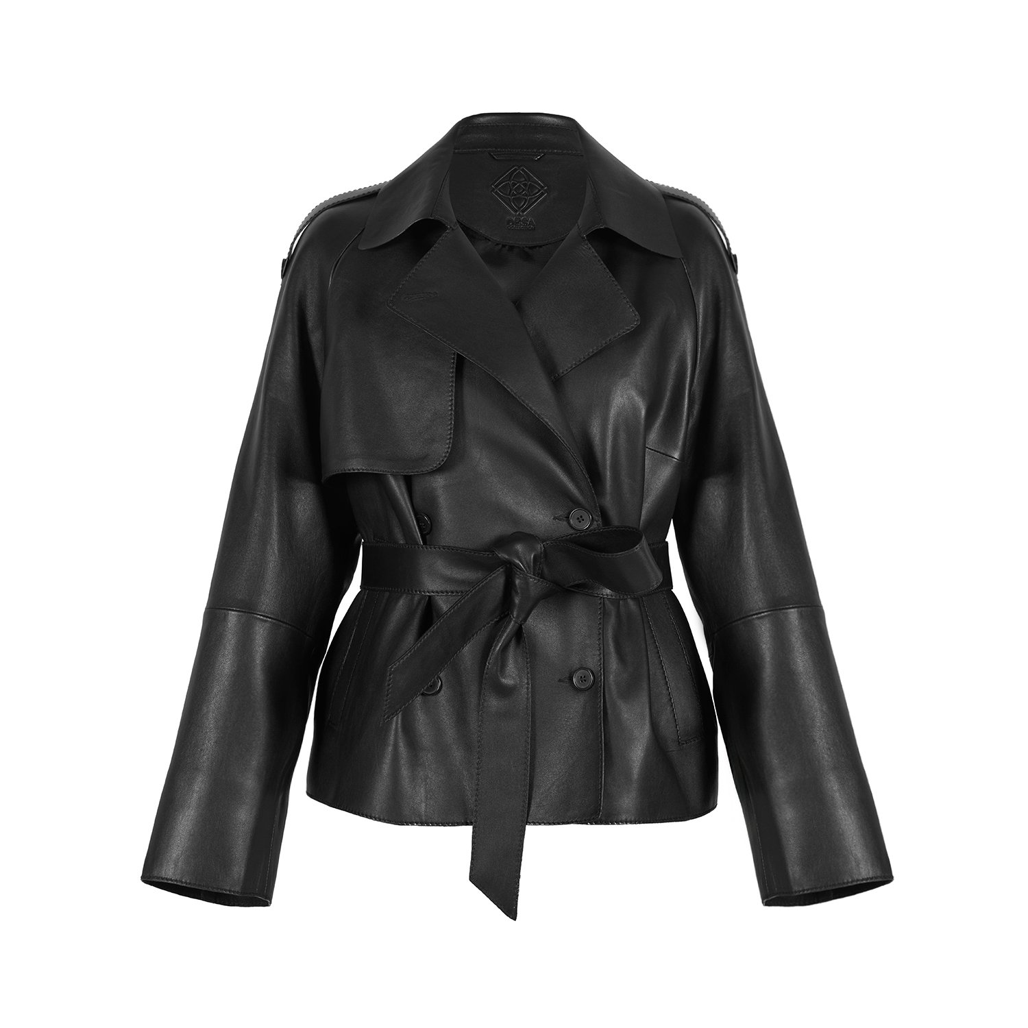 Kadın yakalı kısa deri trençkot.