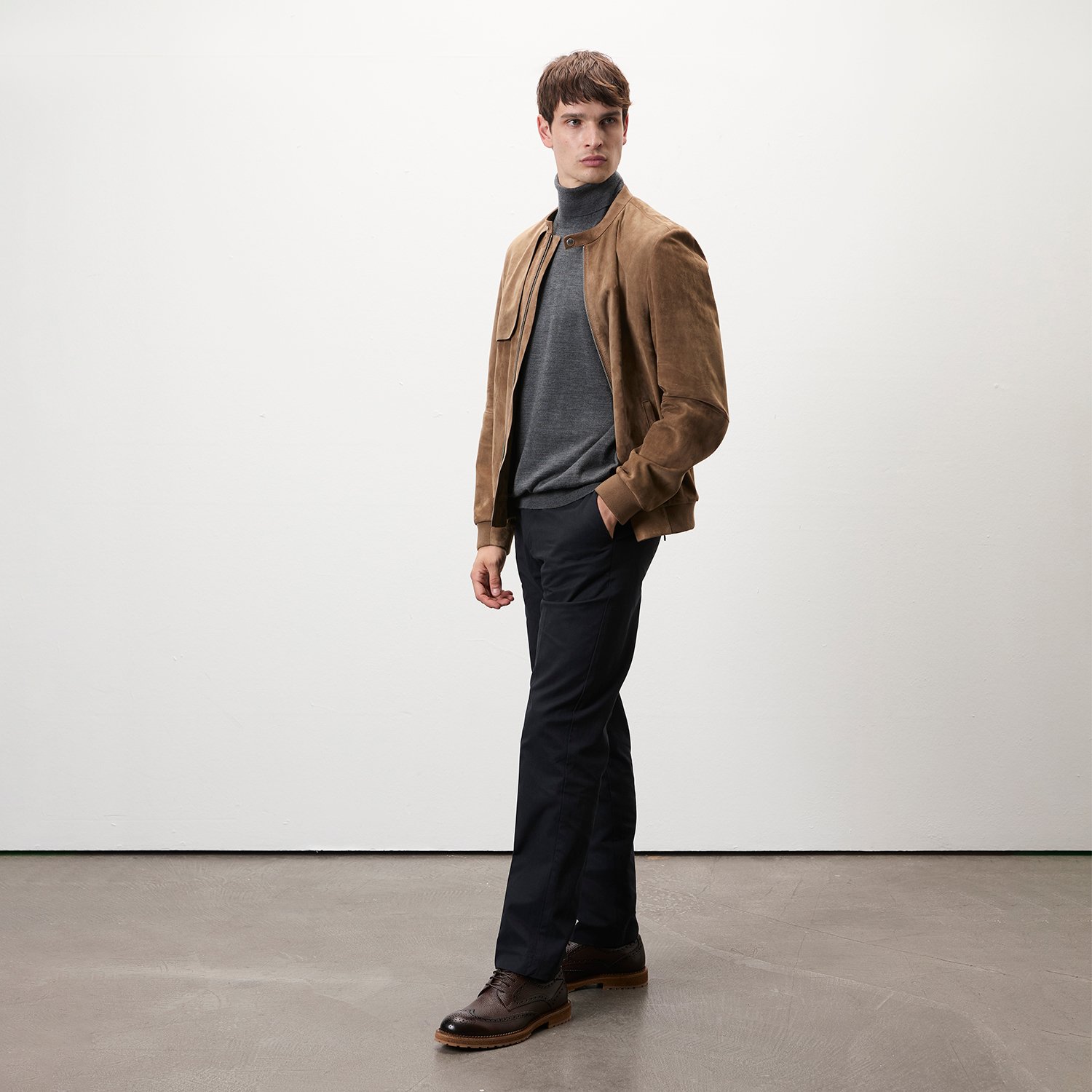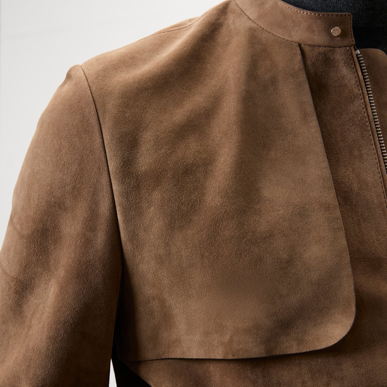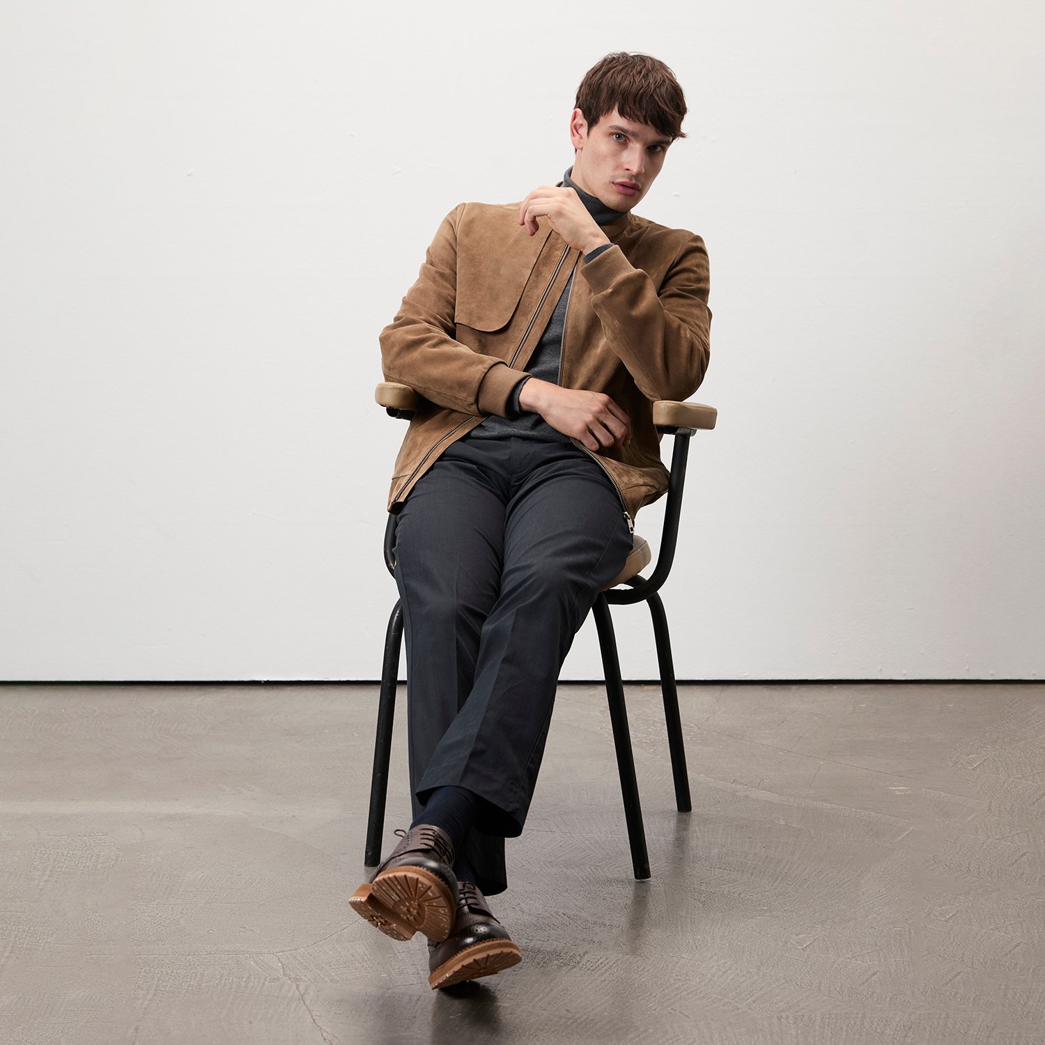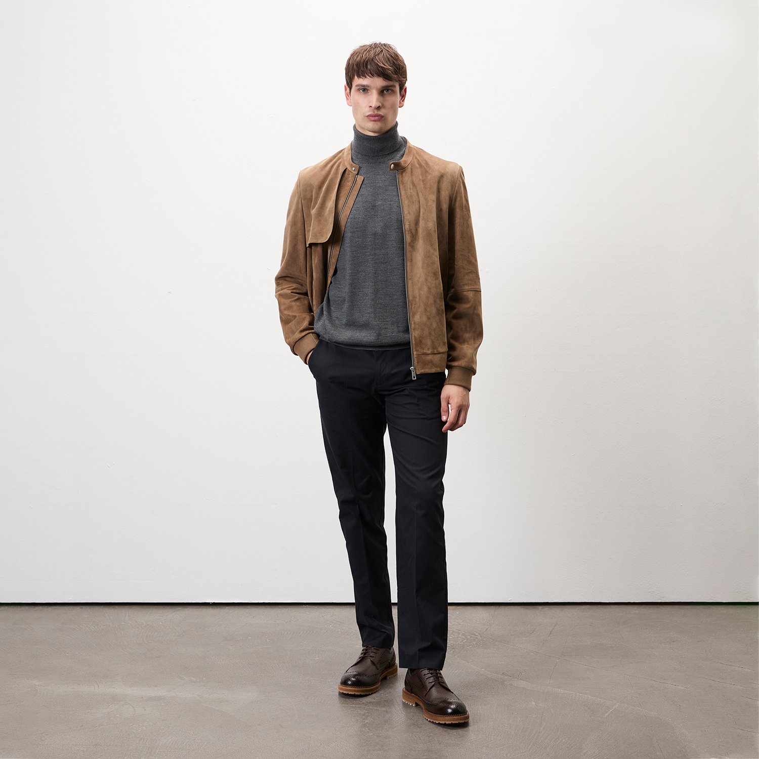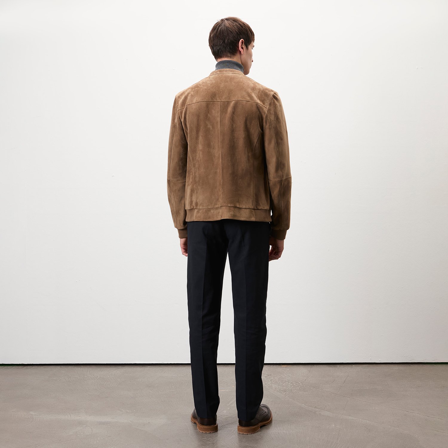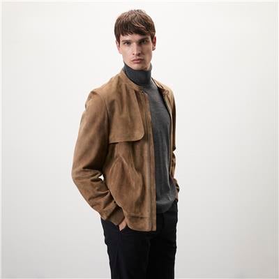 Erkek hakim yakalı, rüzgarlık detaylı, bomber süet deri ceket.