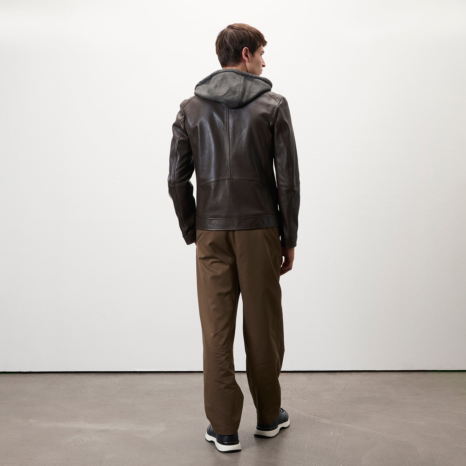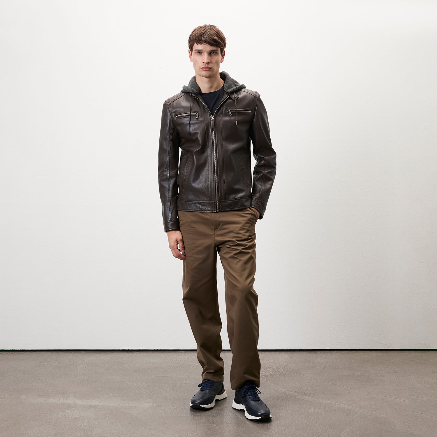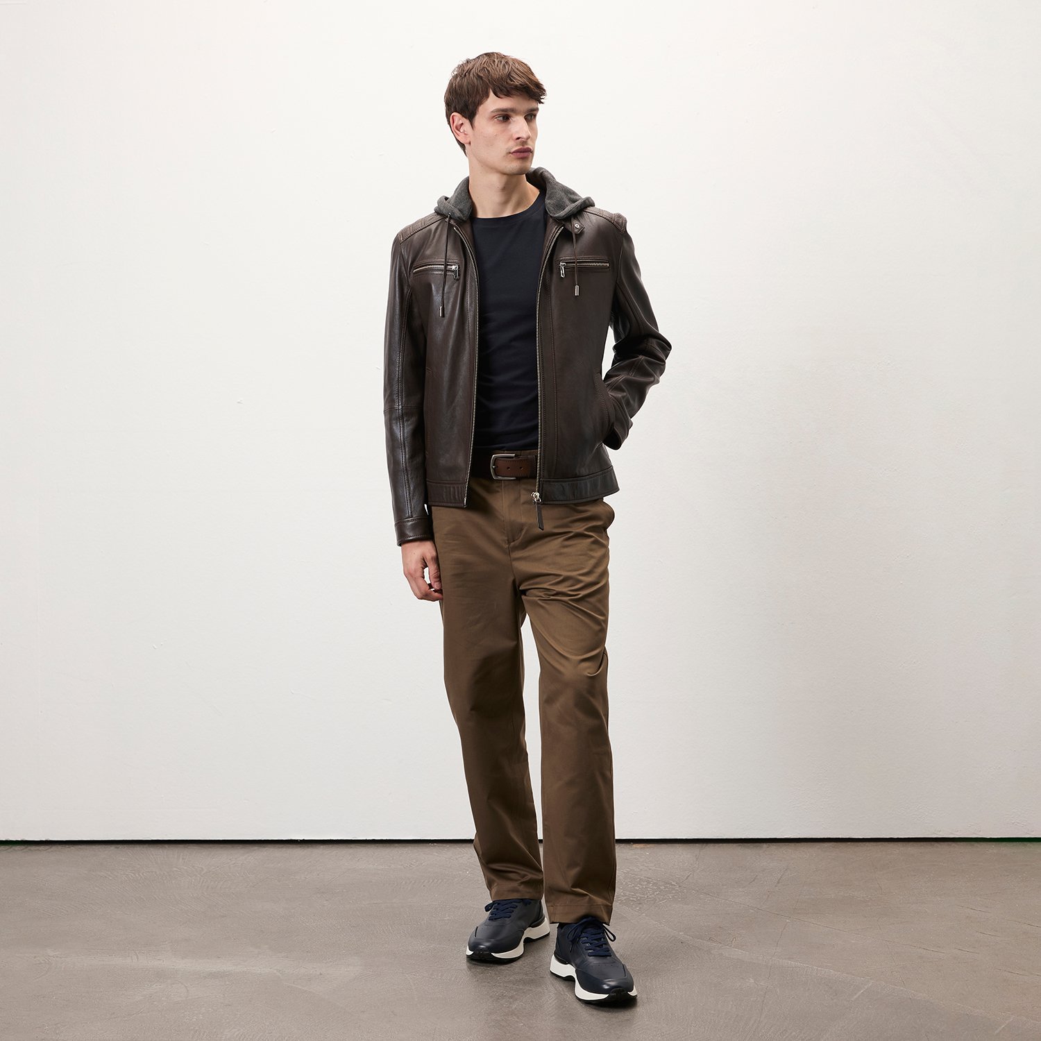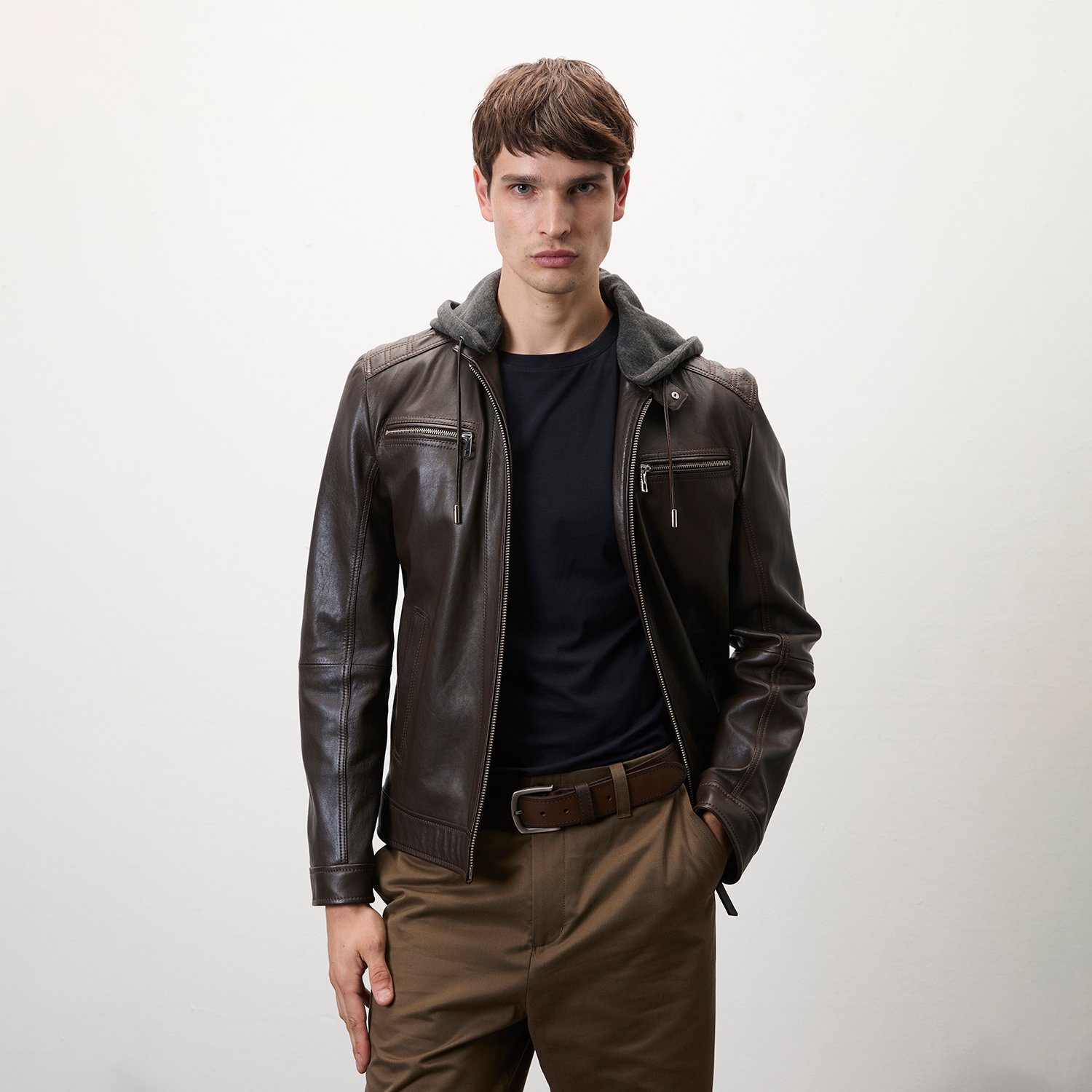 Erkek hafif hakim yakalı, çıkma kapüşon detaylı deri mont.
