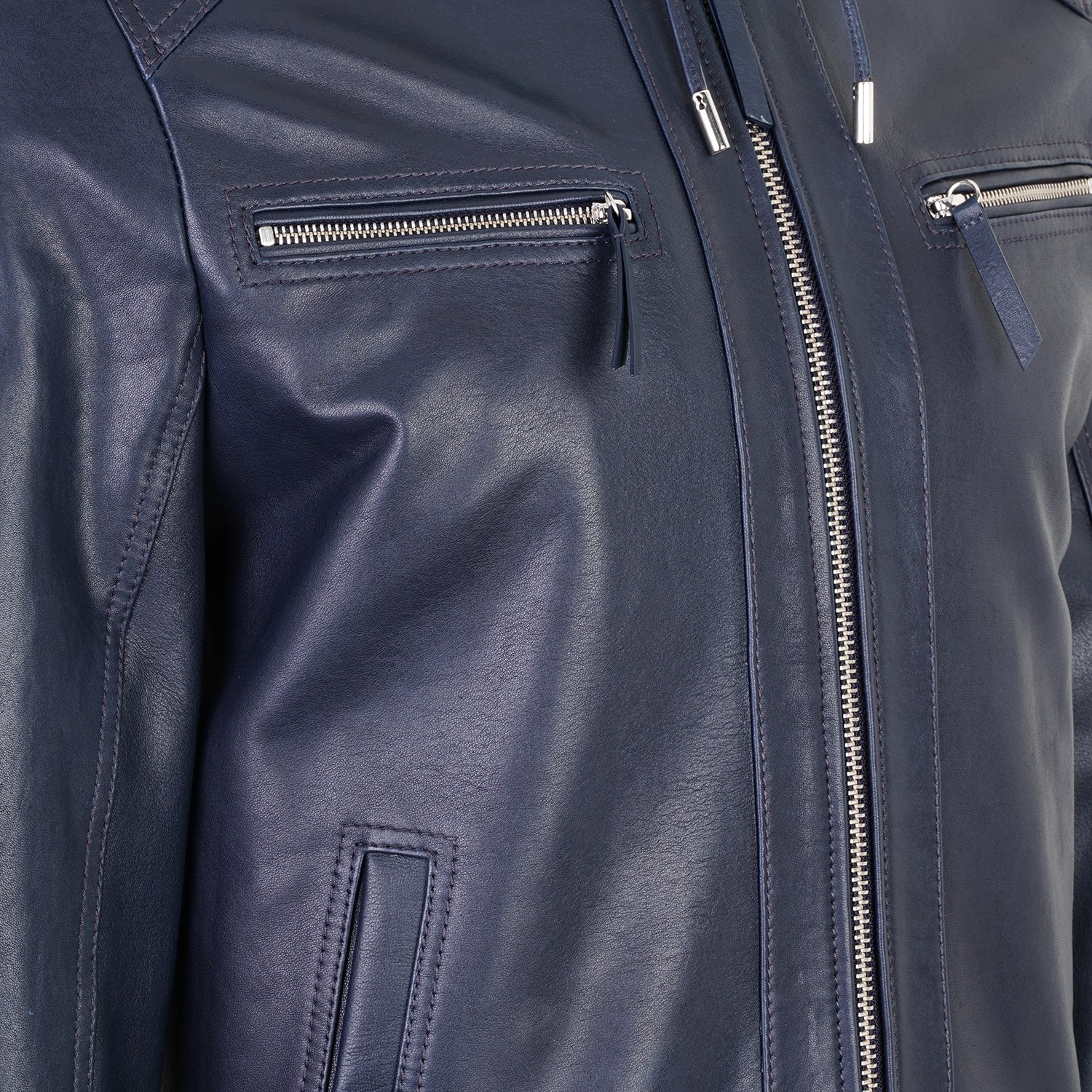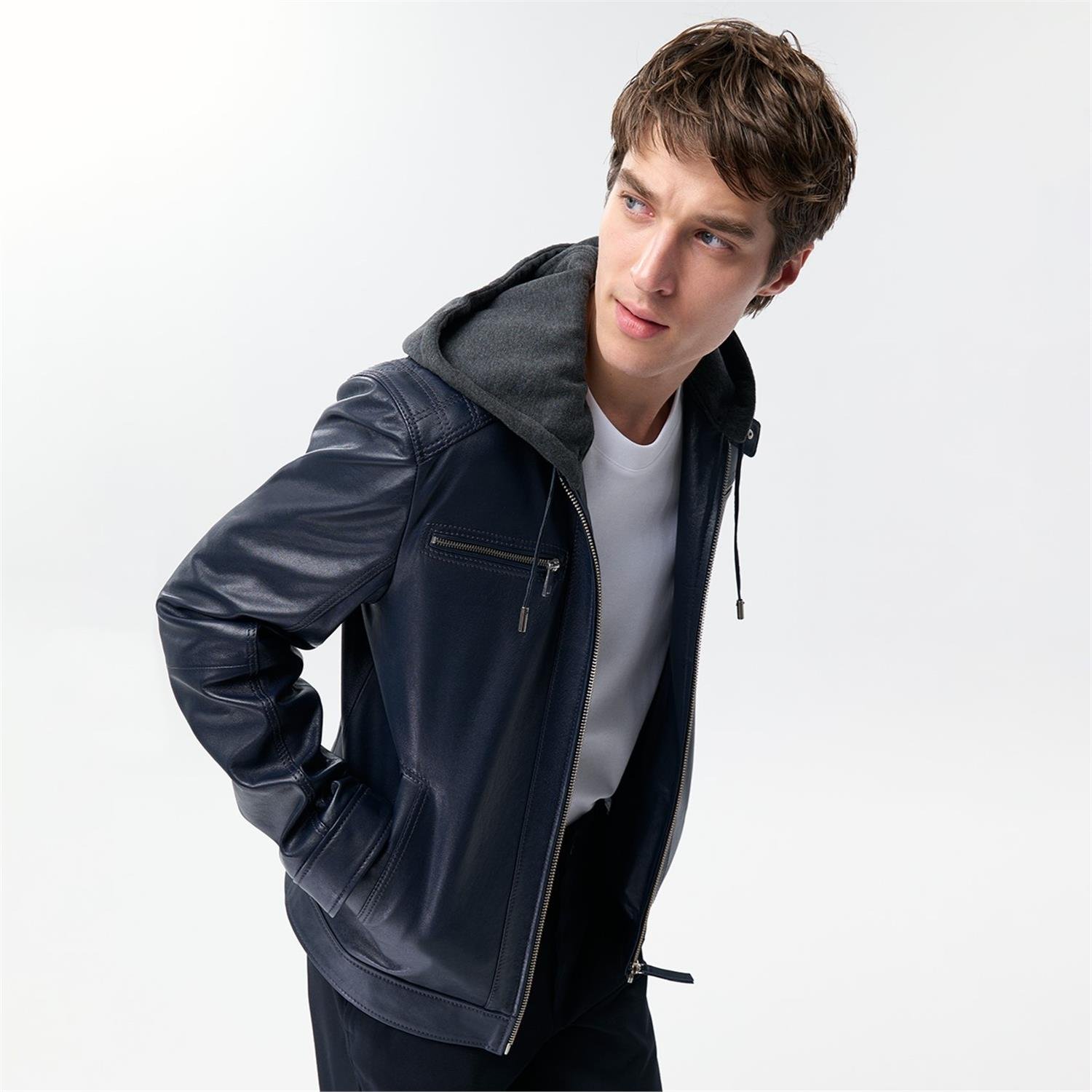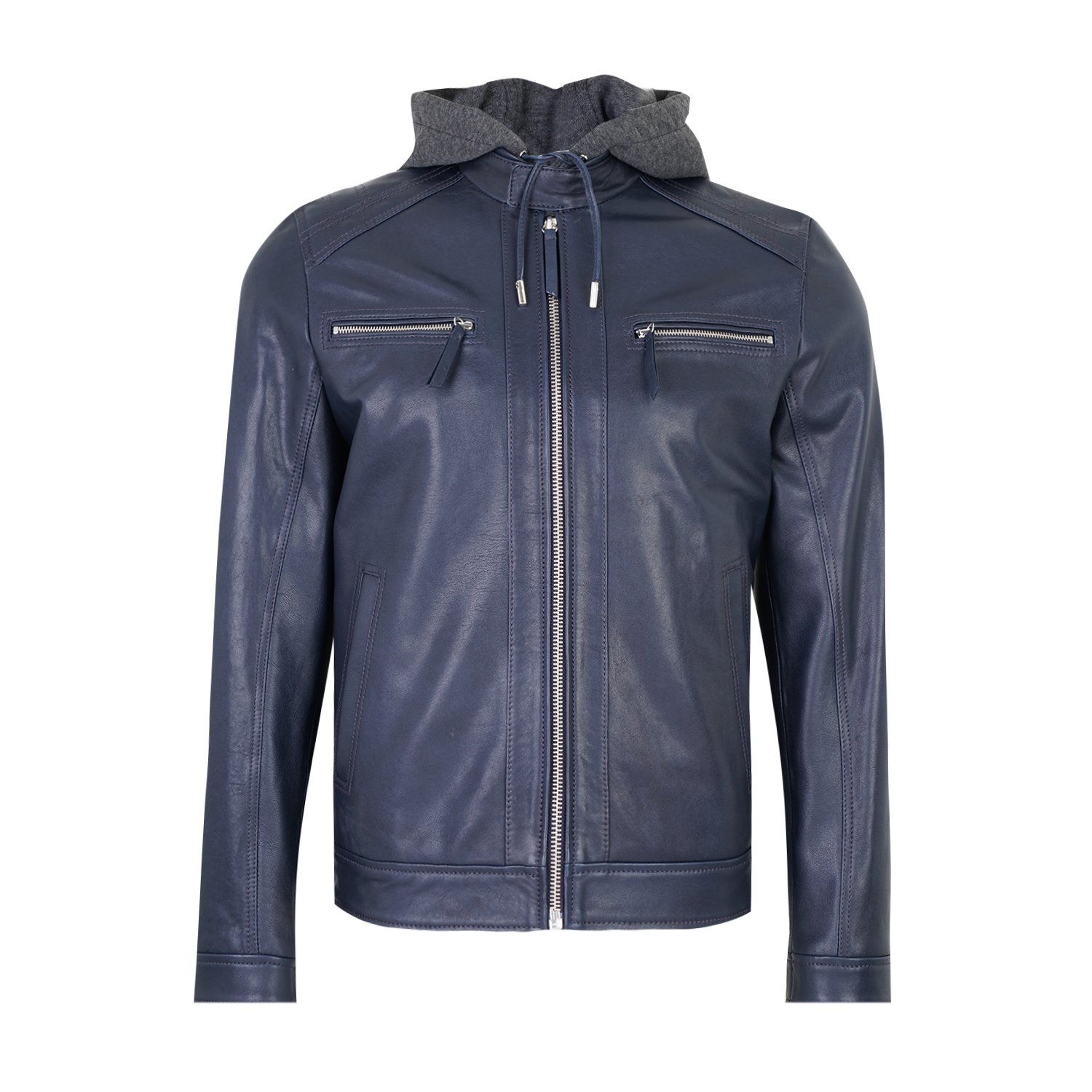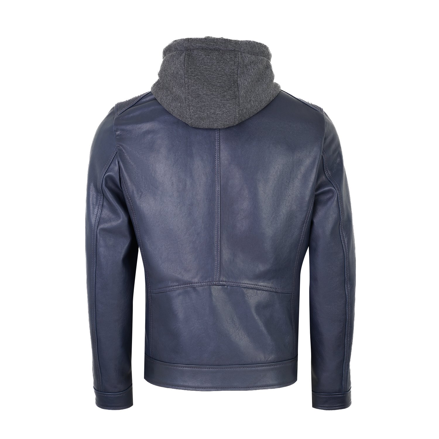 Analu Mavi Erkek Kapüşonlu Deri Mont