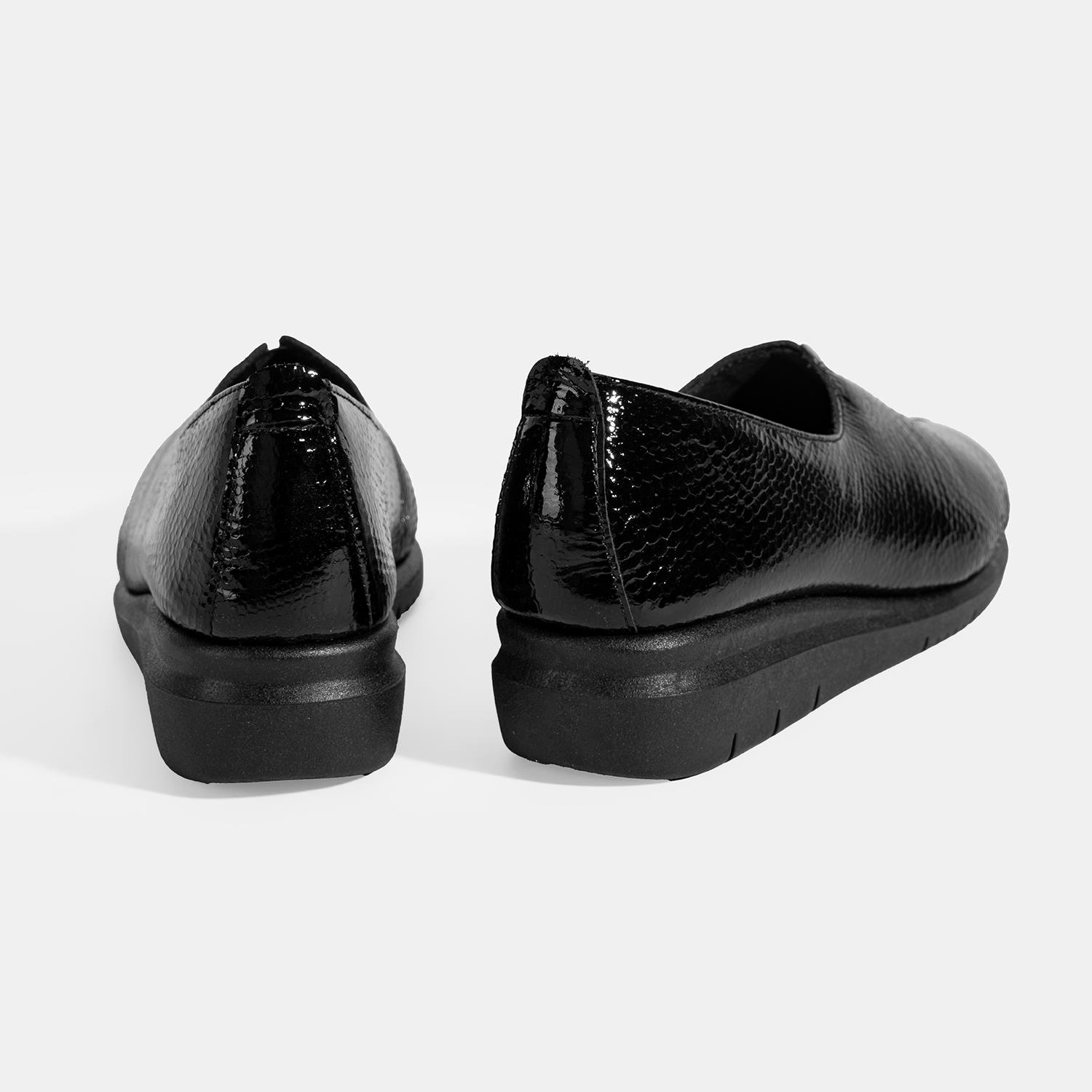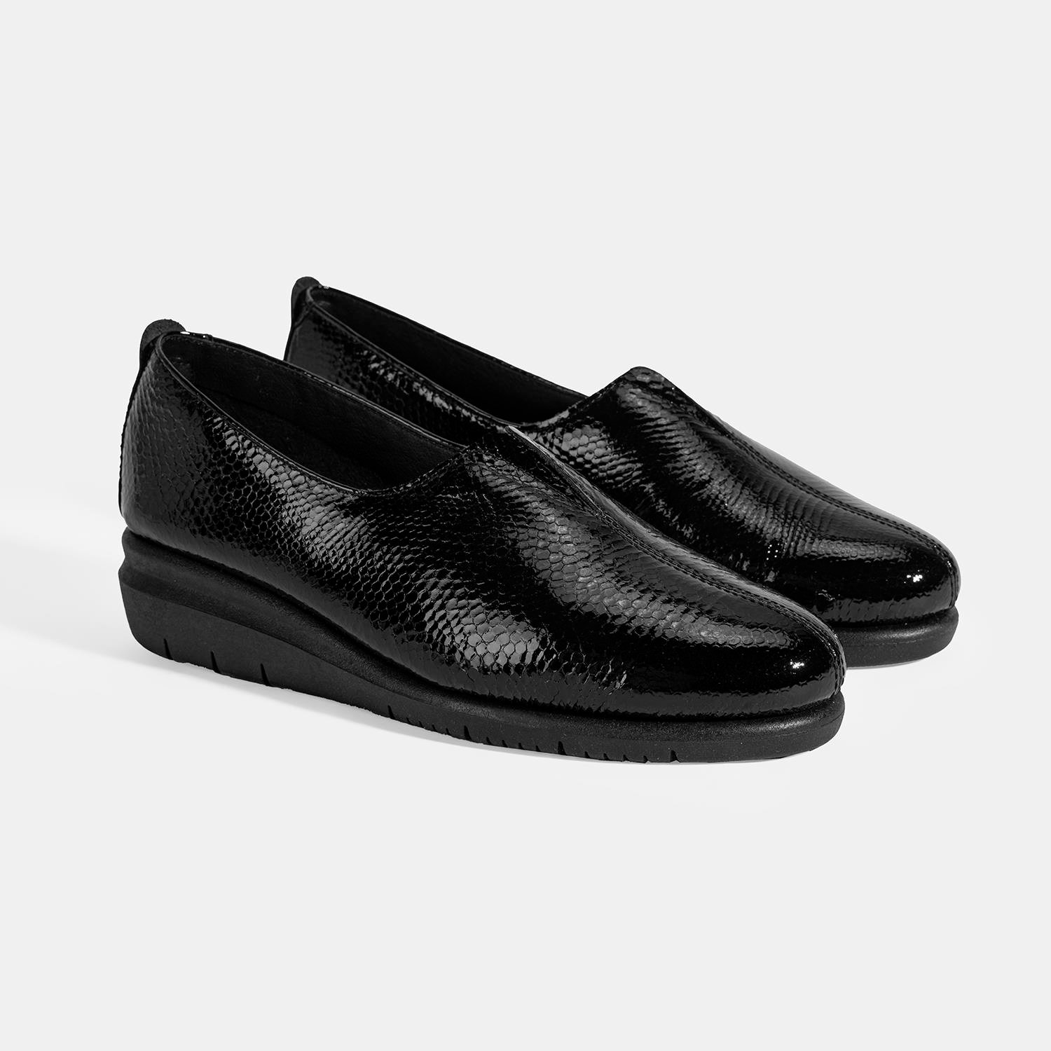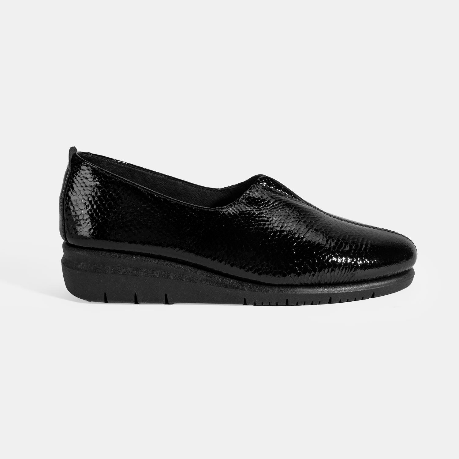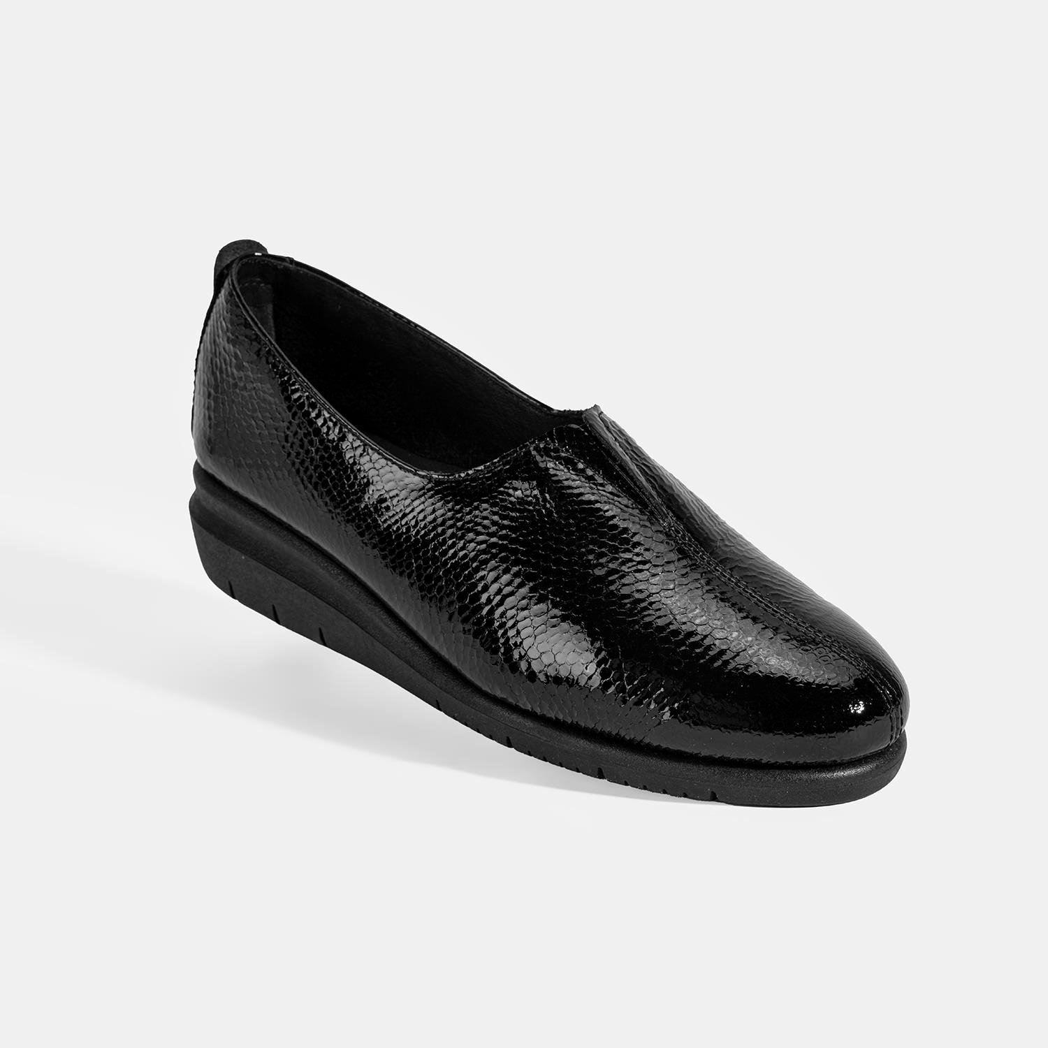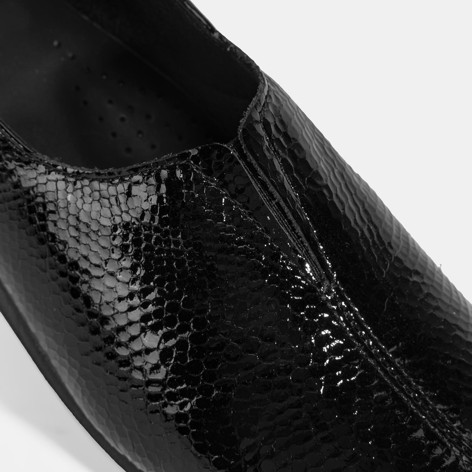 %100 yılan baskılı deri, deri iç tabanlı, tekstil astarlı, lastik detaylı, kauçuk tabanlı kadın comfort ayakkabı. Topuk yüksekliği: 3,5 cm.