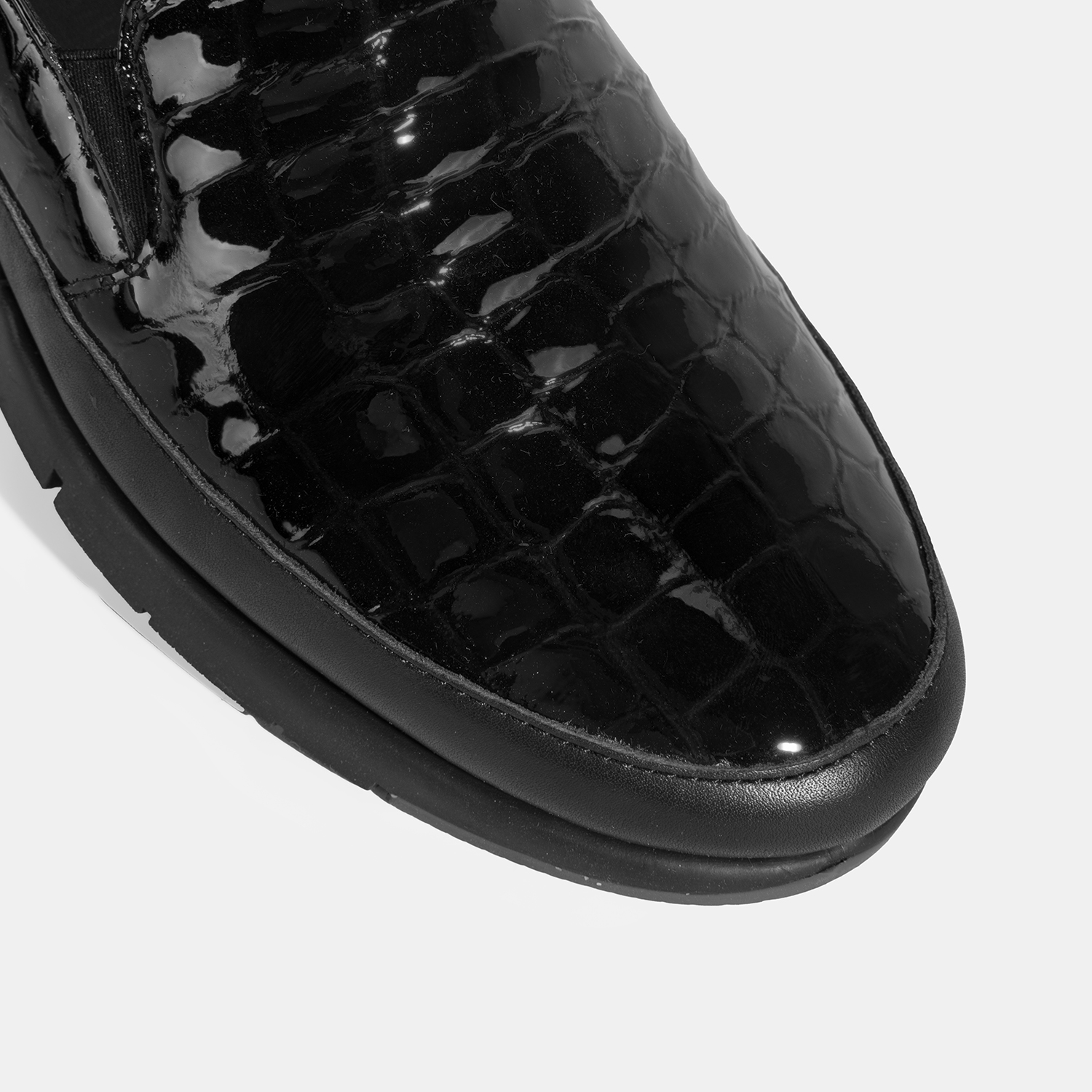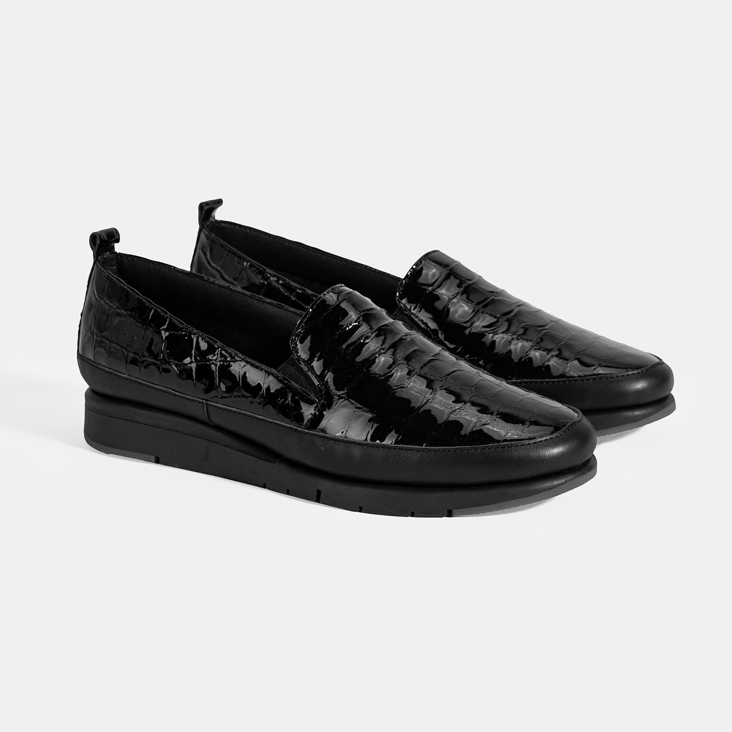 %100 kroko baskılı deri, deri iç tabanlı, tekstil astarlı, kauçuk tabanlı, lastik detaylı kadın günlük comfort ayakkabı. Topuk yüksekliği: 2,5 cm.