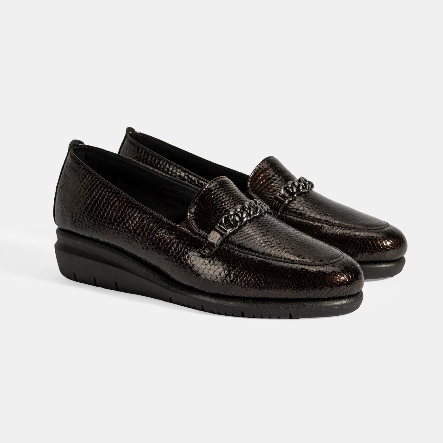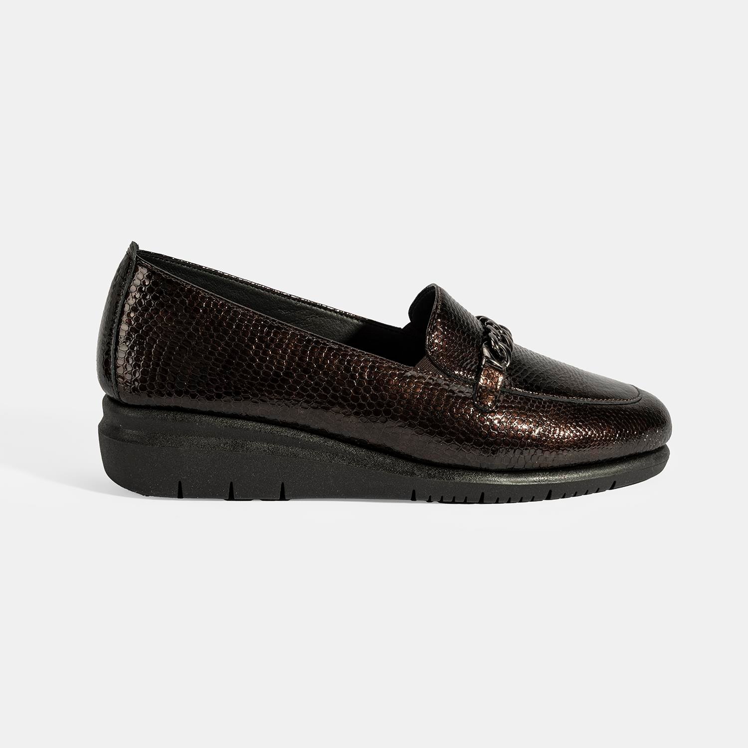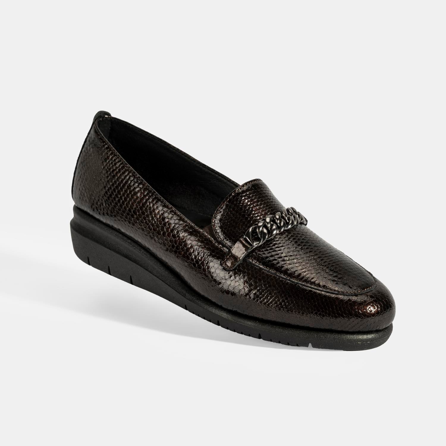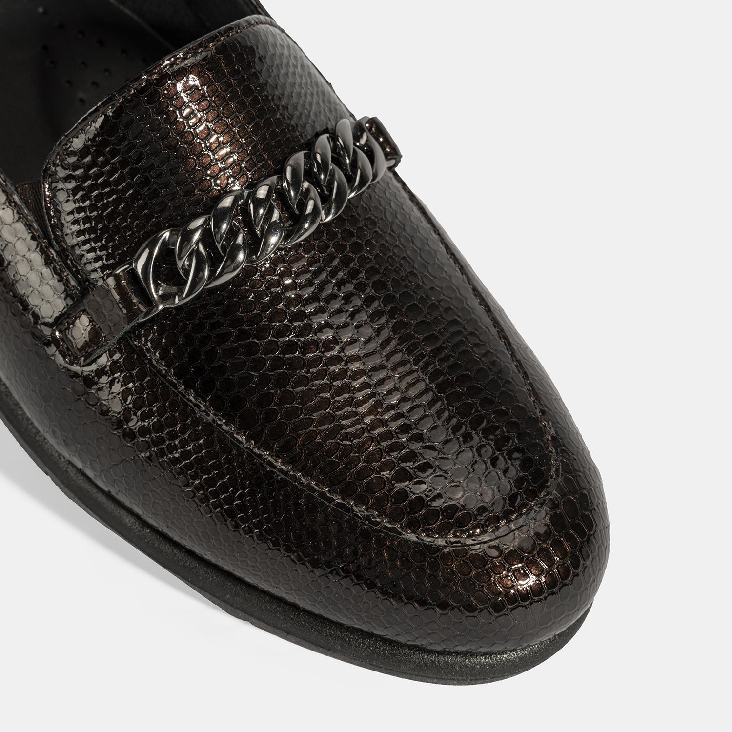 %100 kroko baskılı deri, deri iç tabanlı, tekstil astarlı, zincir aksesuar detaylı, kauçuk tabanlı kadın comfort ayakkabı. Topuk yüksekliği: 3,5 cm.