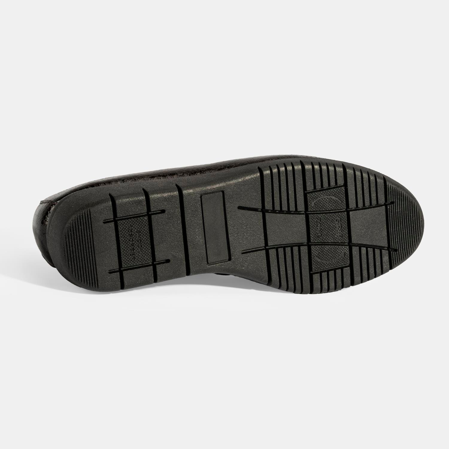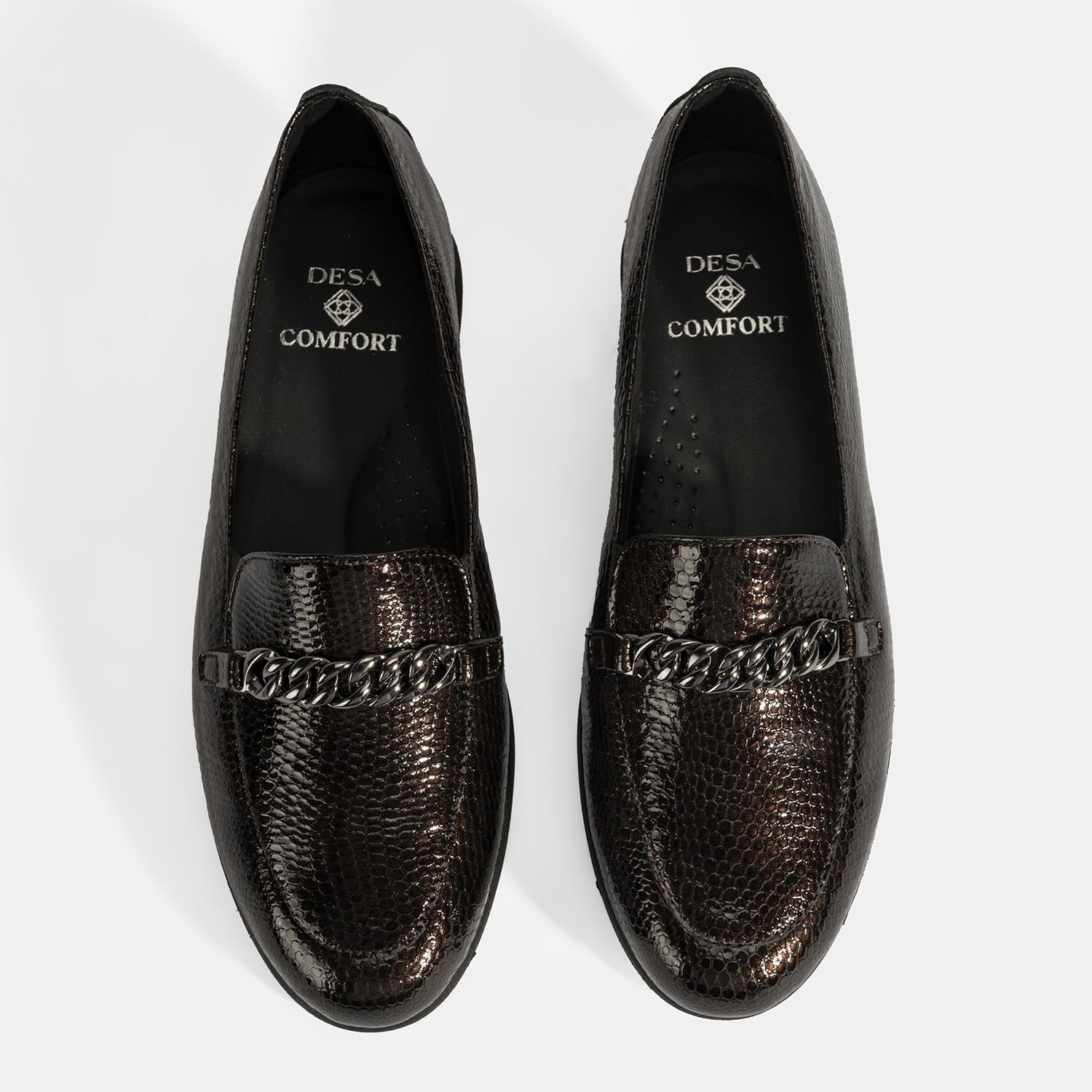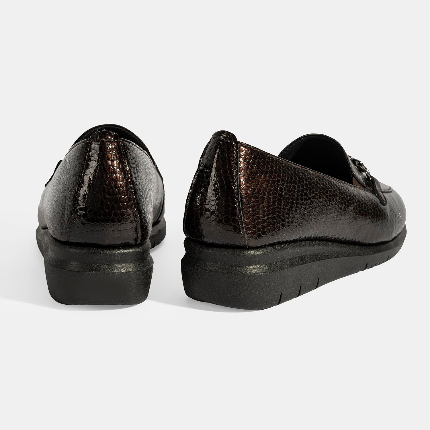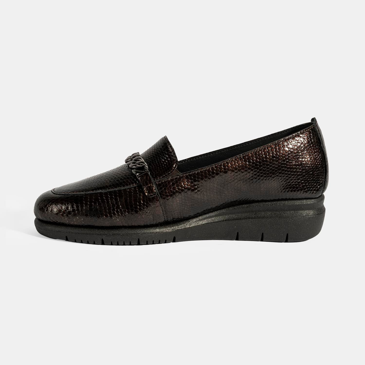 %100 kroko baskılı deri, deri iç tabanlı, tekstil astarlı, zincir aksesuar detaylı, kauçuk tabanlı kadın comfort ayakkabı. Topuk yüksekliği: 3,5 cm.
