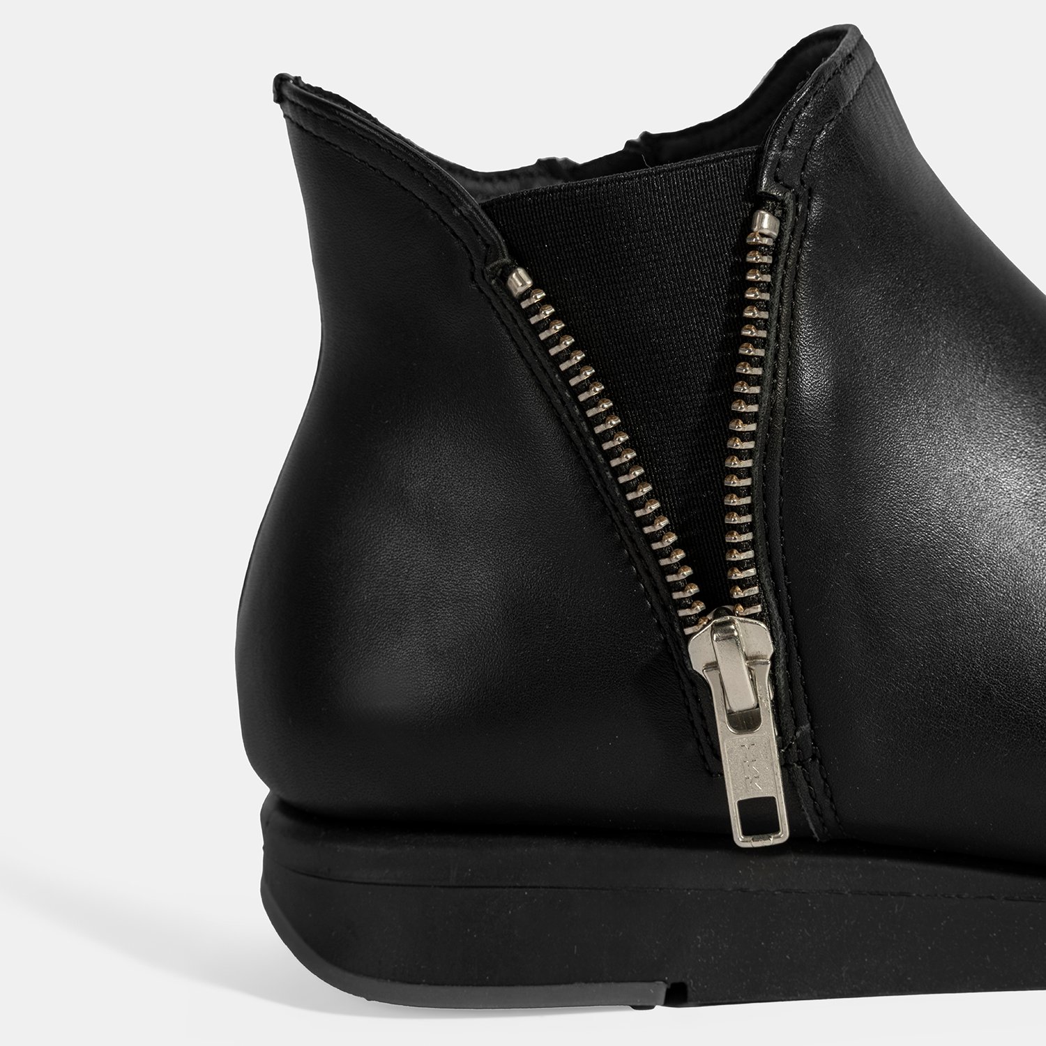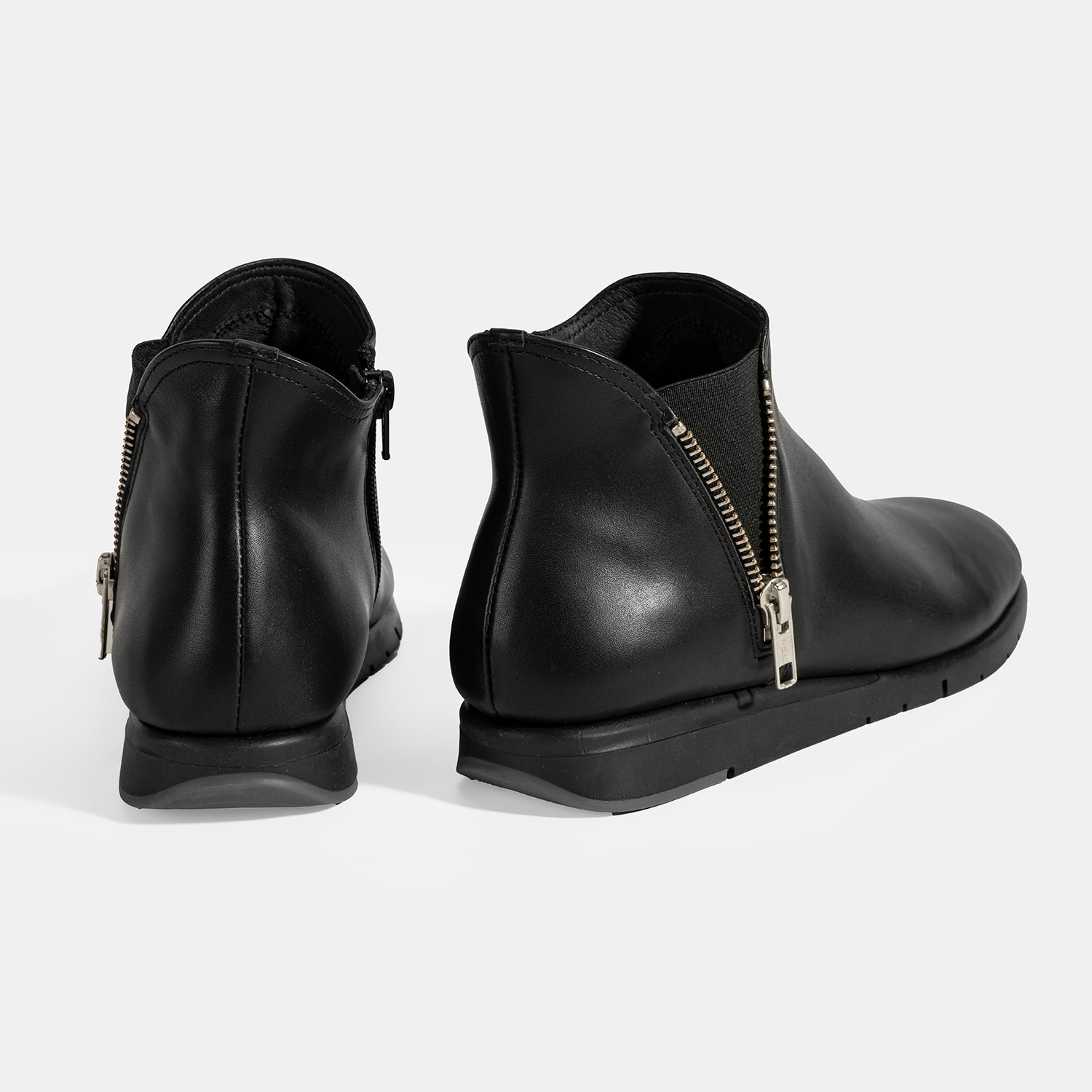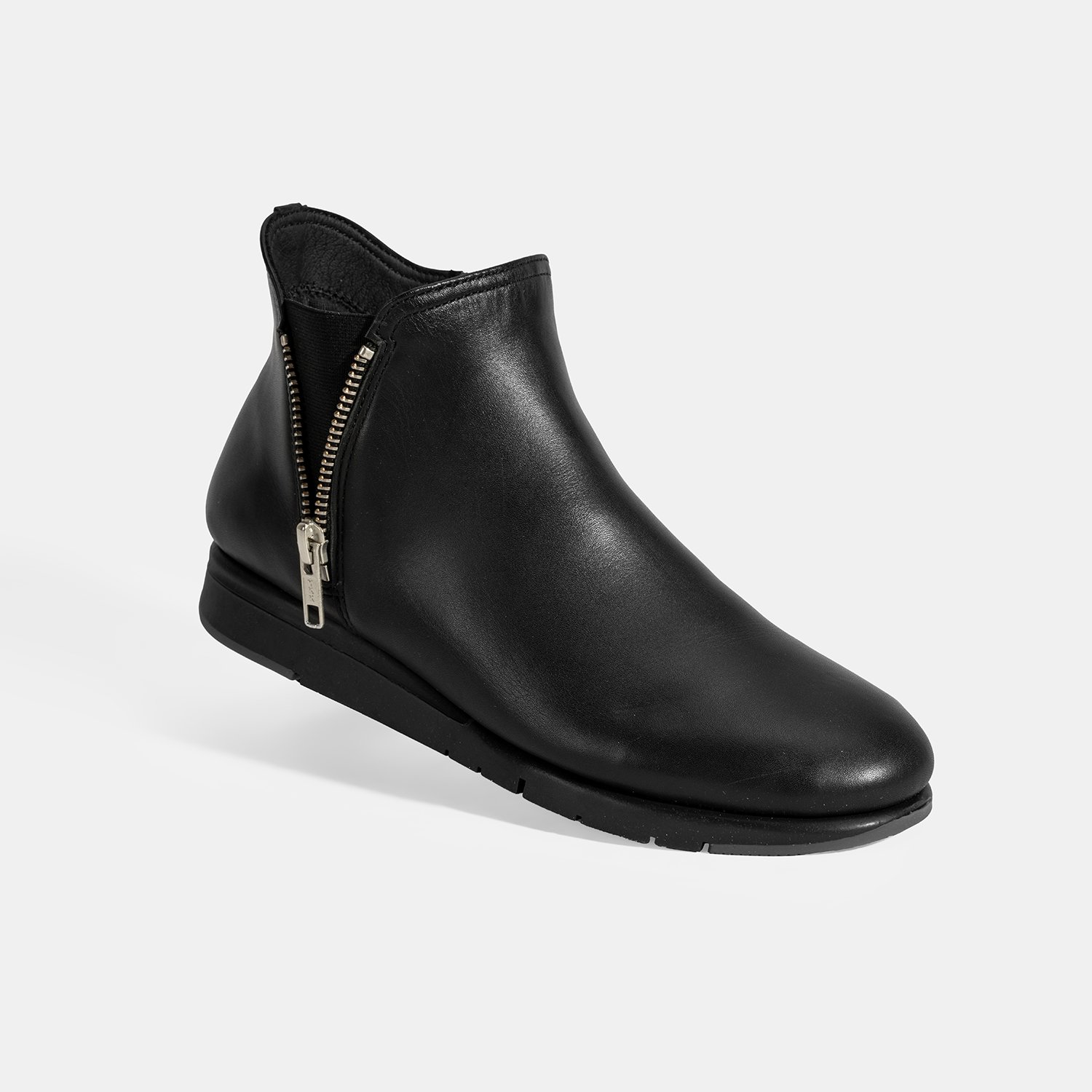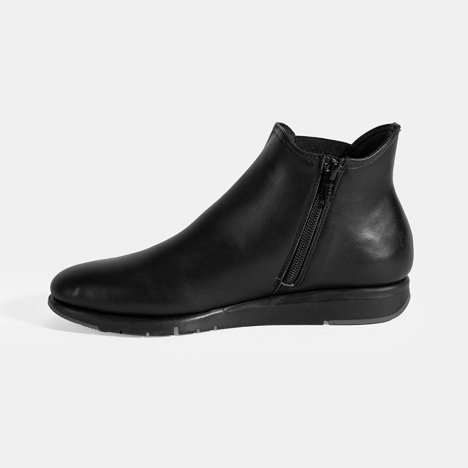 %100 deri, deri iç tabanlı, tekstil astarlı, fermuar aksesuar detaylı, kauçuk tabanlı, lastikli kadın comfort bot. Topuk yüksekliği: 2,5 cm.