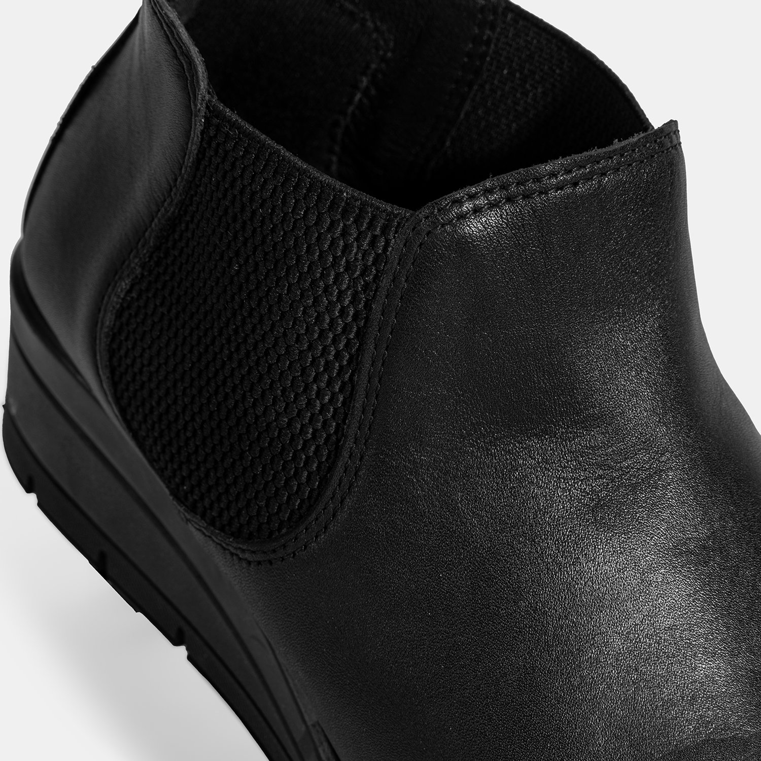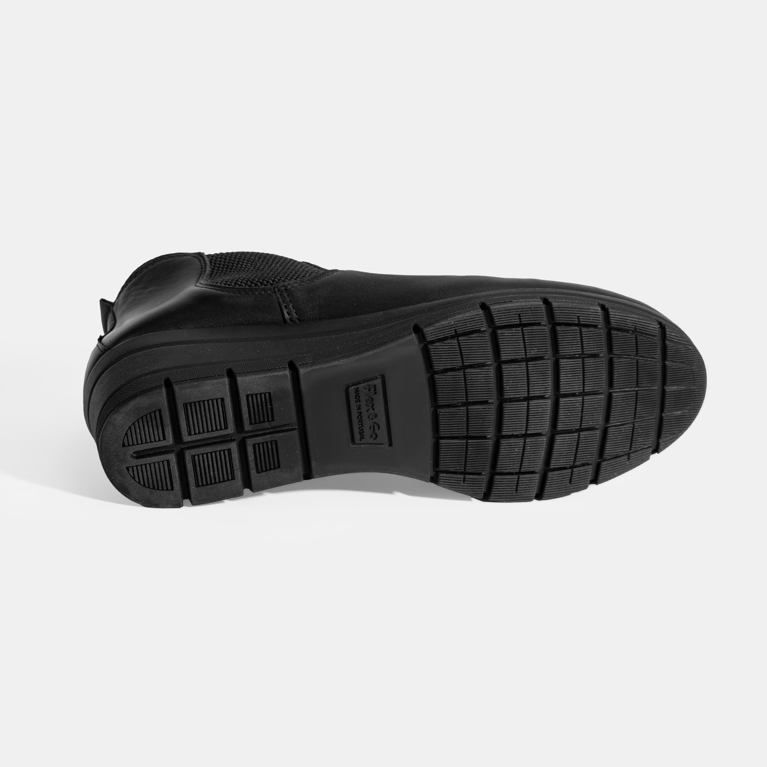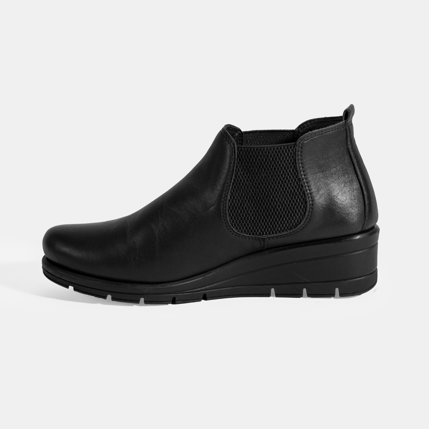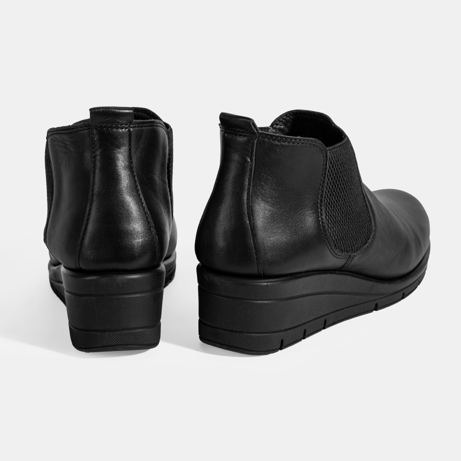 %100 deri, deri iç tabanlı, tekstil astarlı, lastik detaylı, kauçuk tabanlı kadın bilek boy comfort bot. Topuk yüksekliği: 4,5 cm.