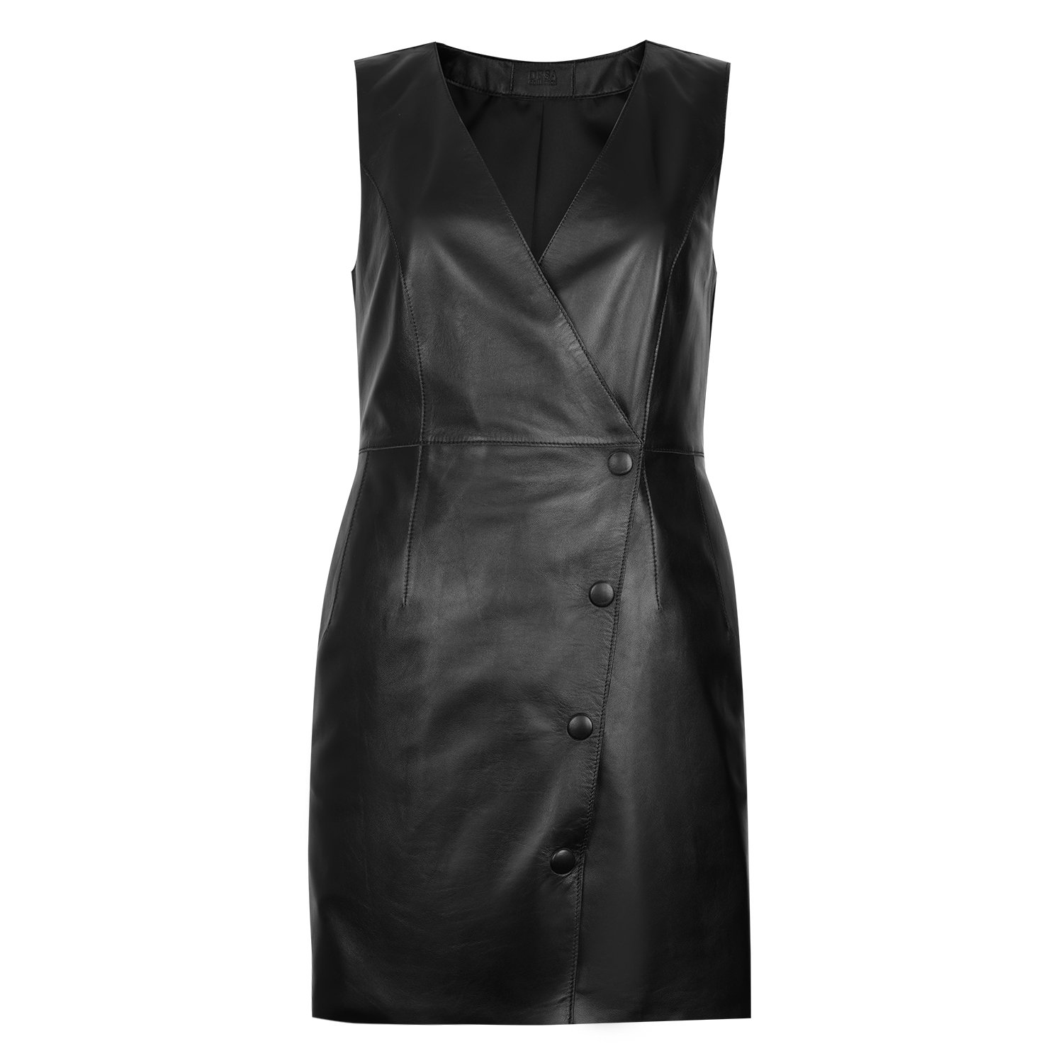 Kadın kruvaze kapamalı V yakalı deri elbise.