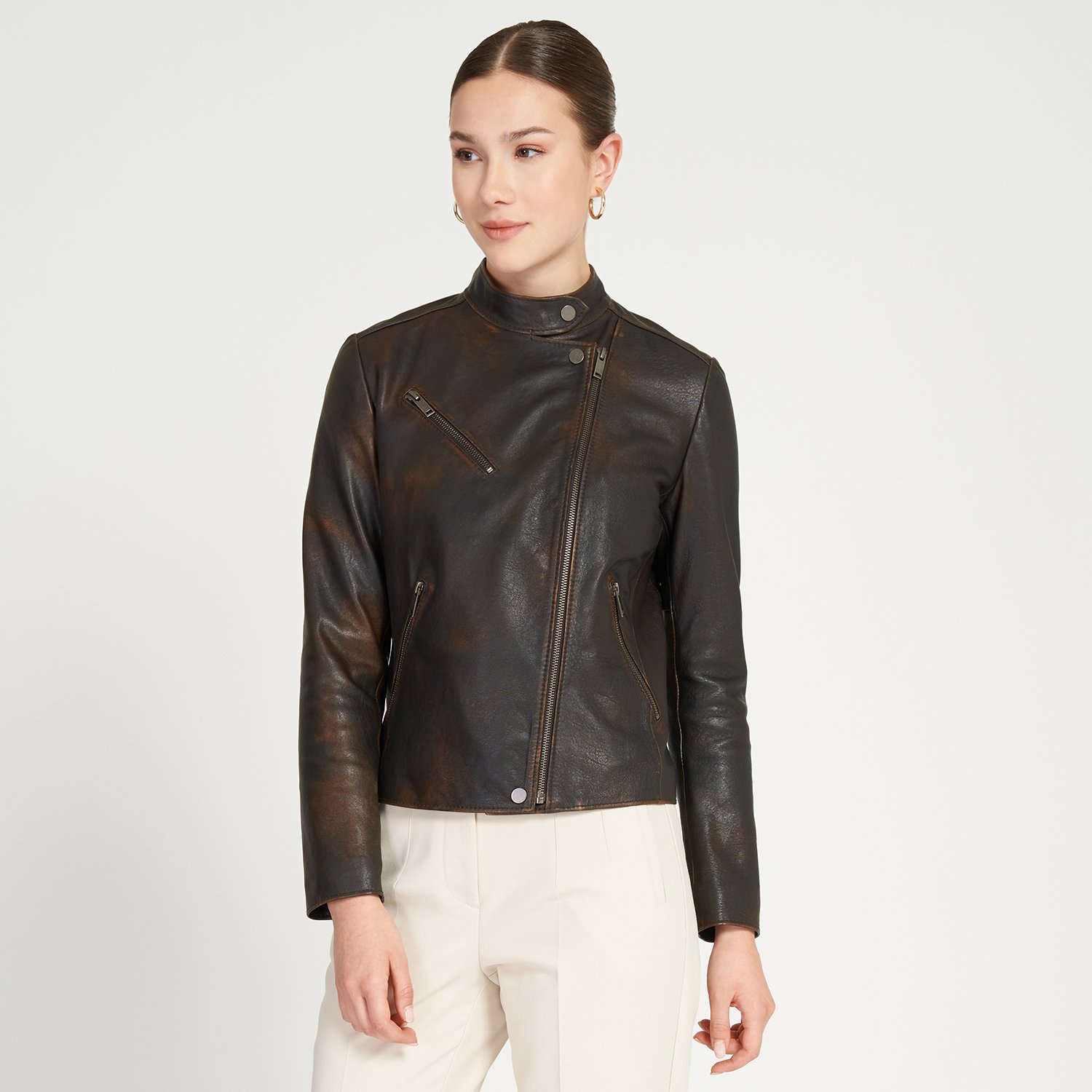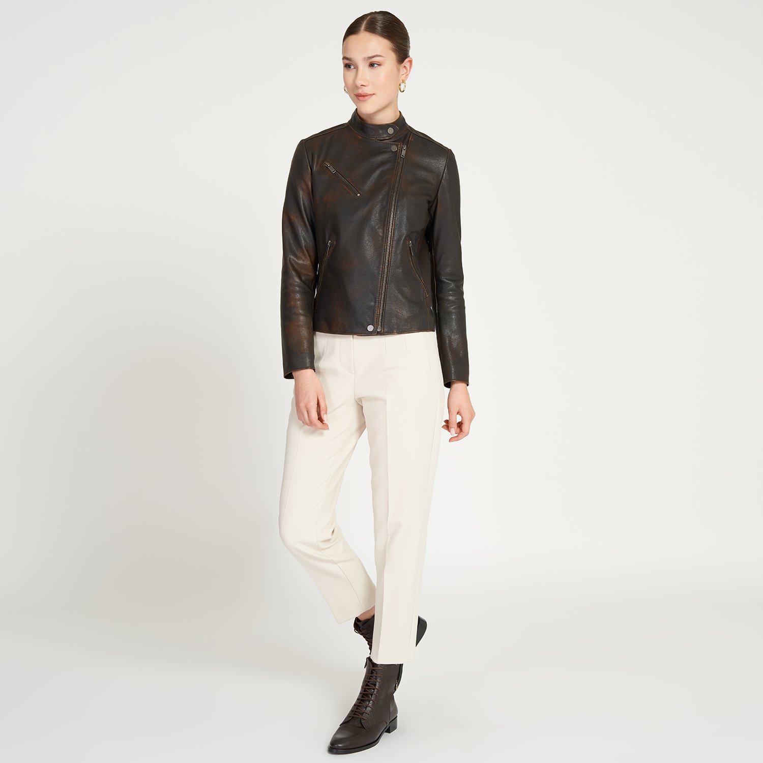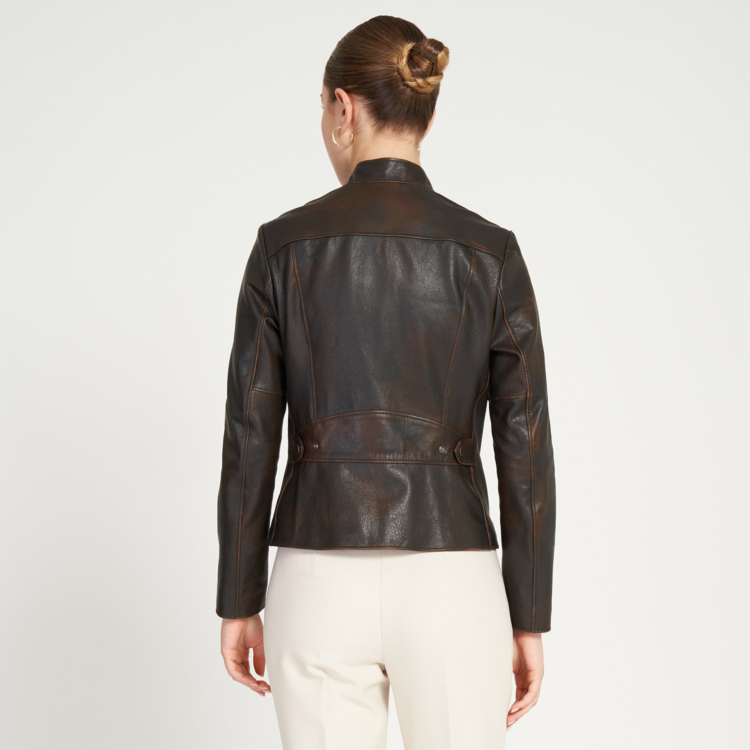 Yuvarlak yakalı, önden metal fermuar kapamalı, yakada metal çıtçıt detayı kullanılmıştır.