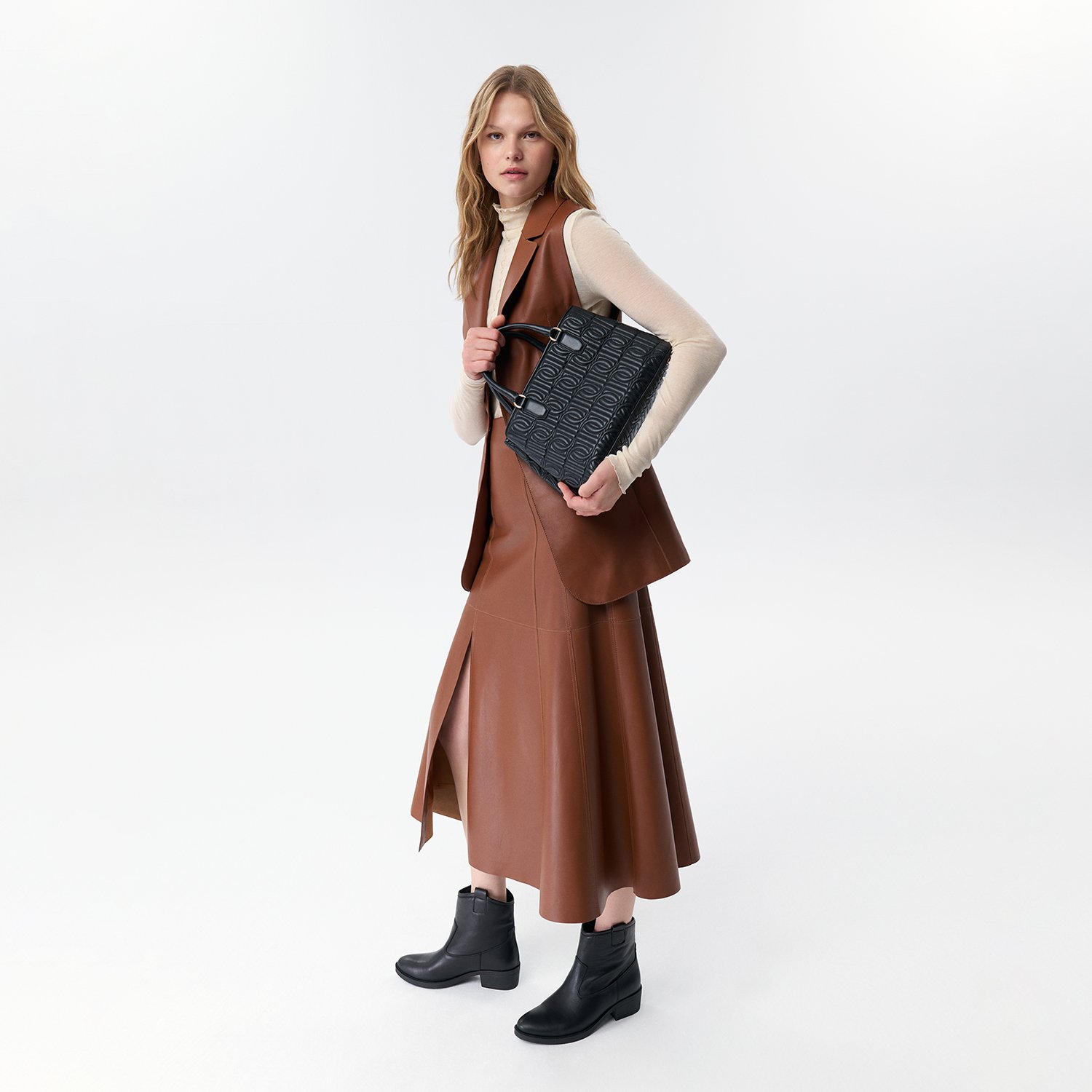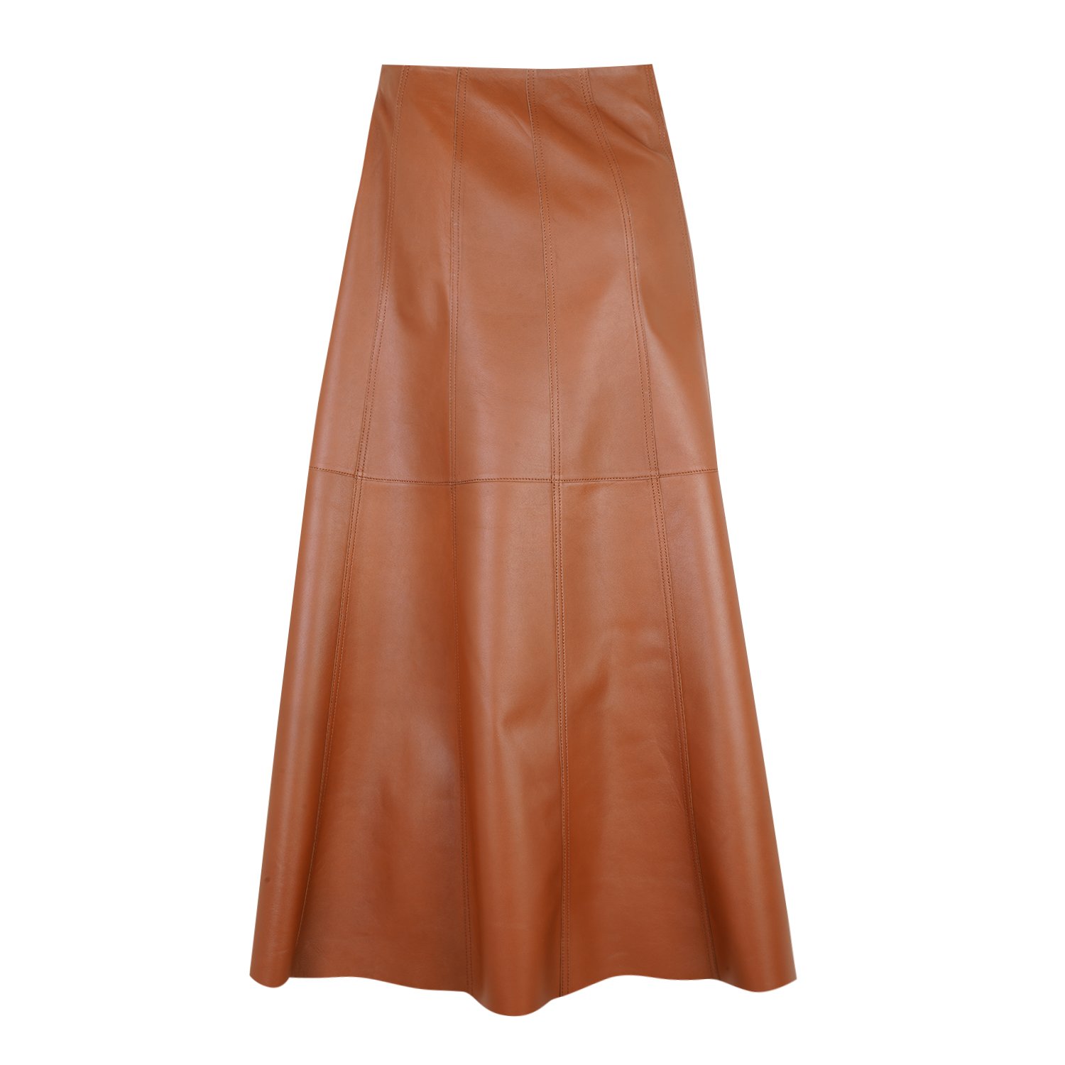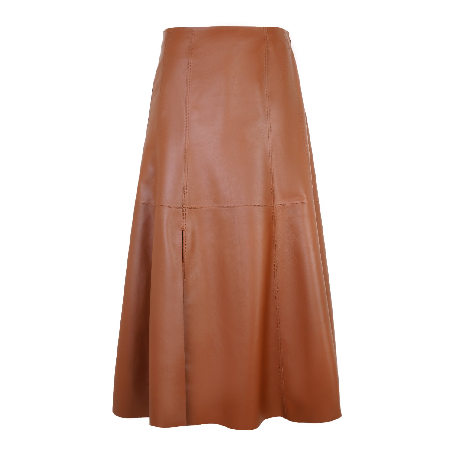 Kadın A form, yüksek bel, yırtmaç detaylı, midi boy deri etek.