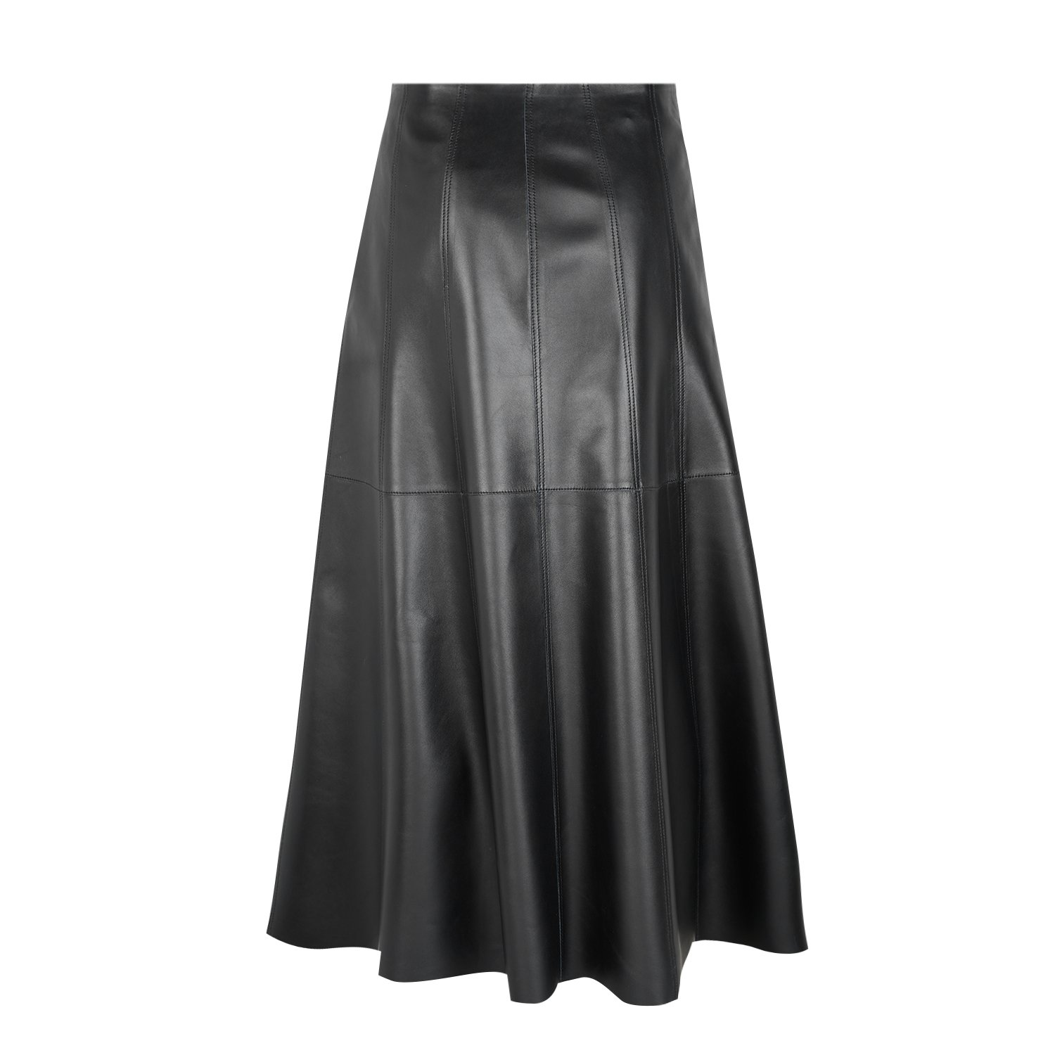 Kadın A form, yüksek bel, yırtmaç detaylı, midi boy deri etek.