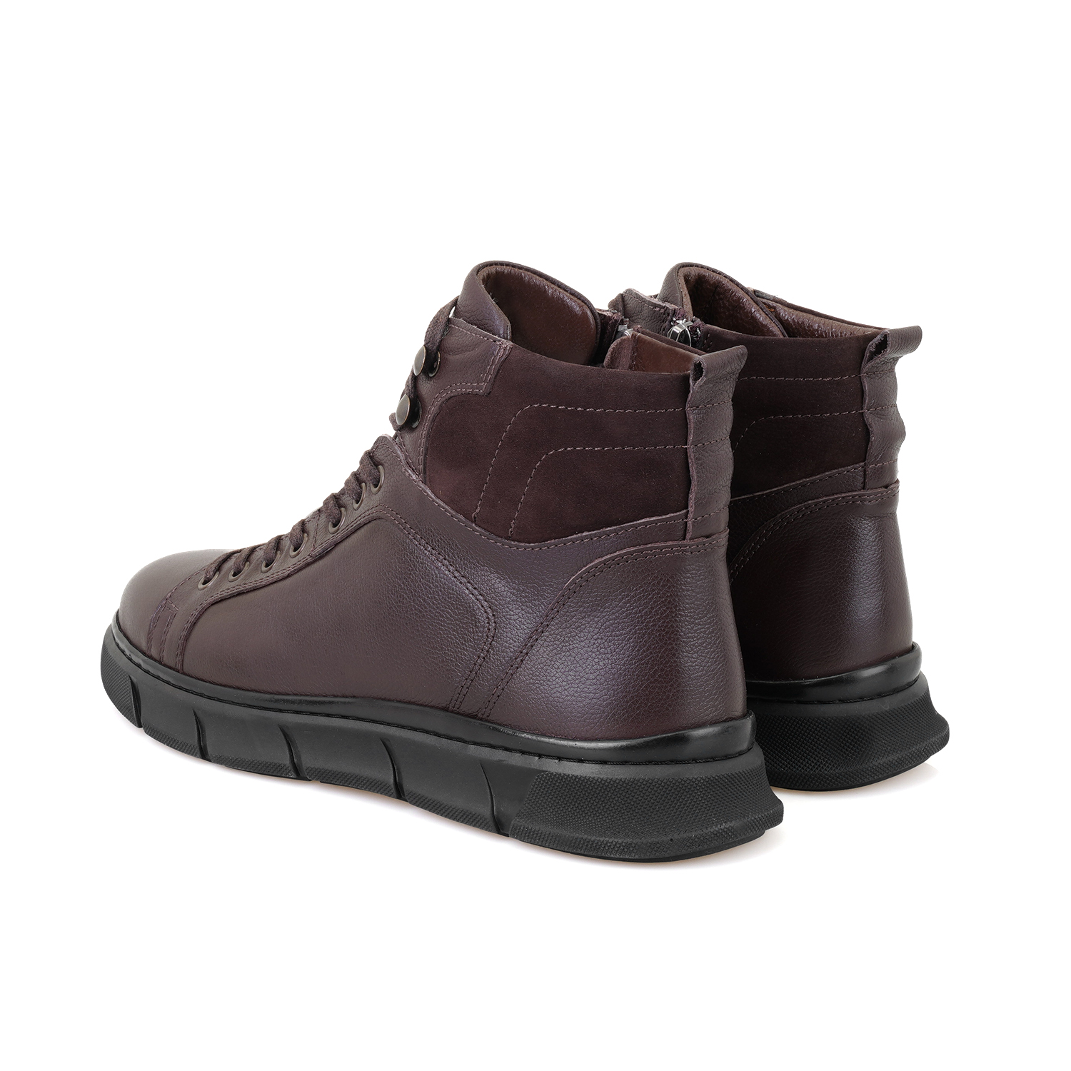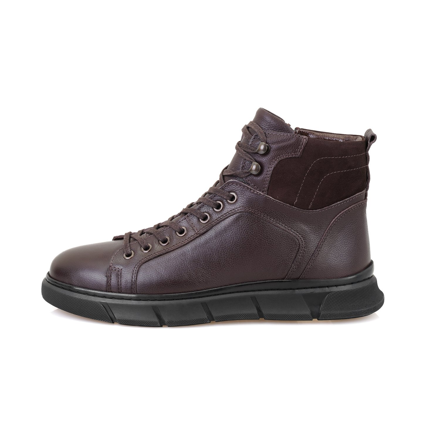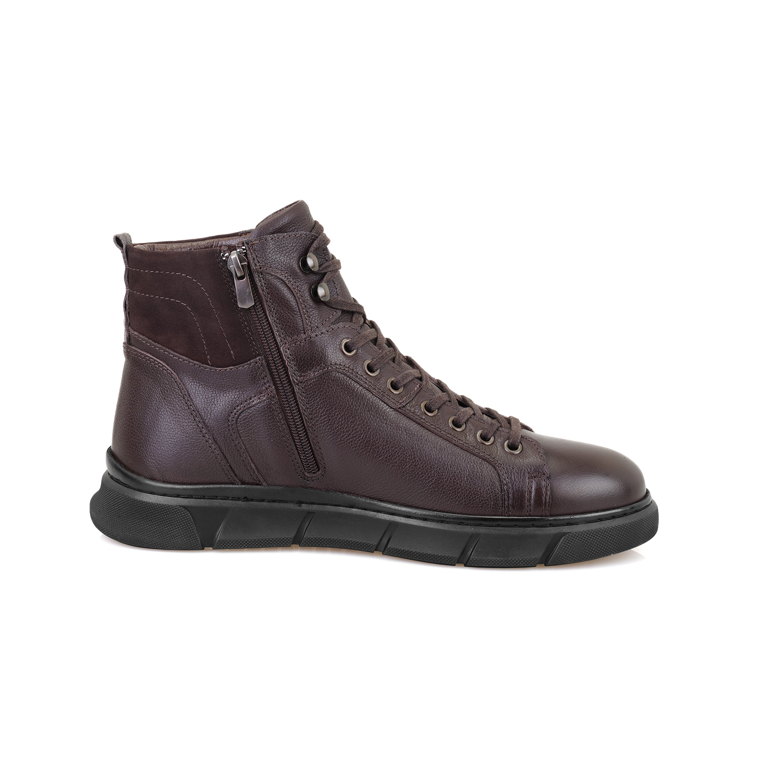 %100 deri, deri iç tabanlı, tekstil astarlı, içten fermuarlı, kauçuk tabanlı, bağcıklı erkek bot.