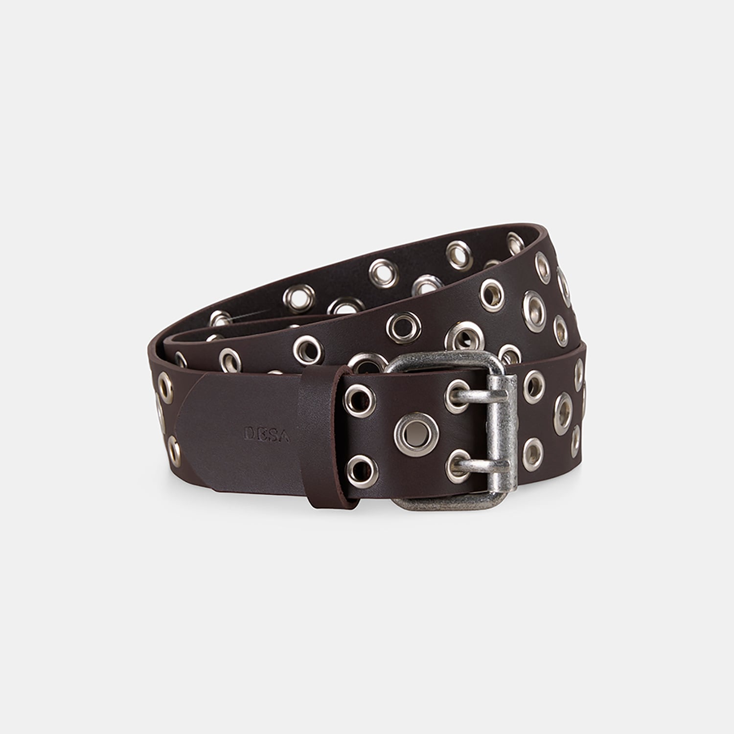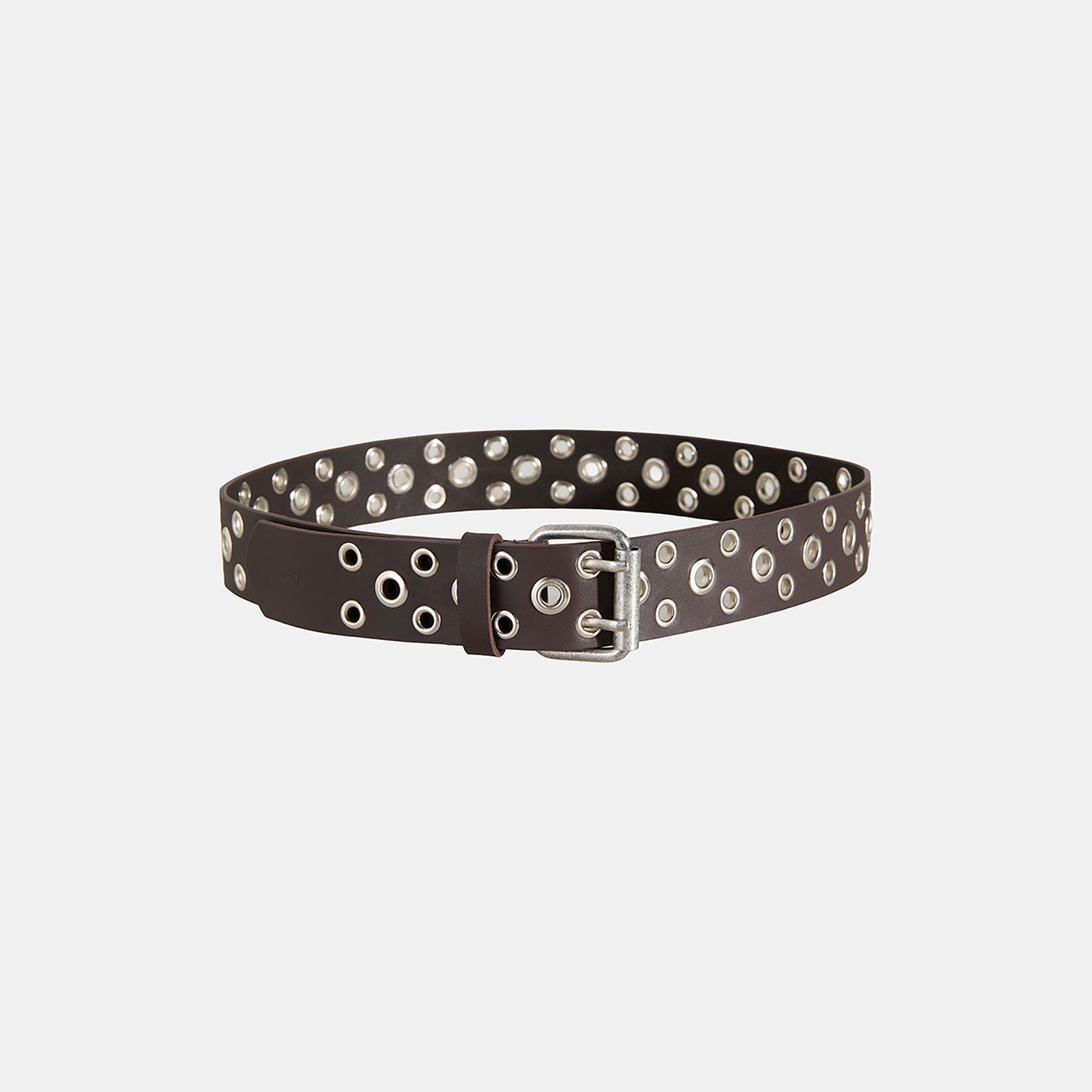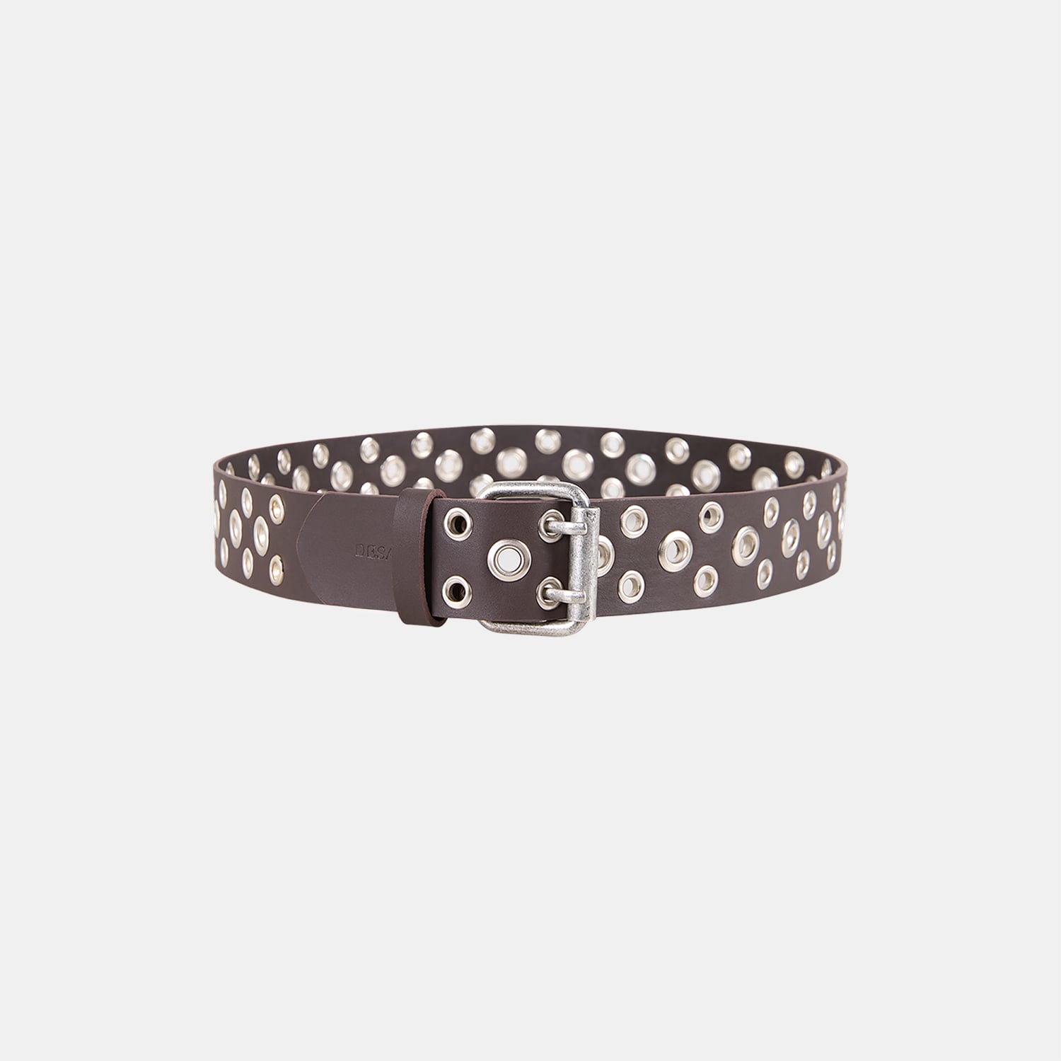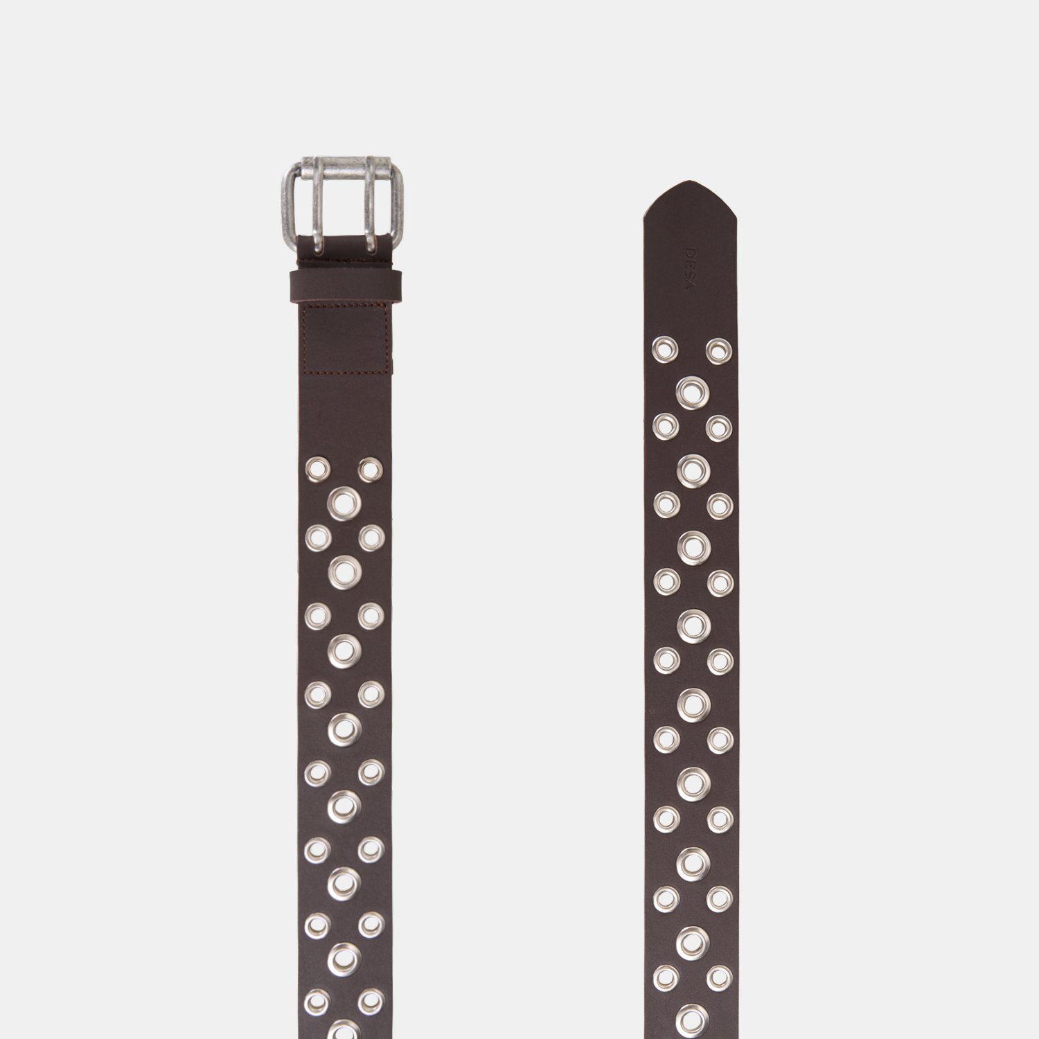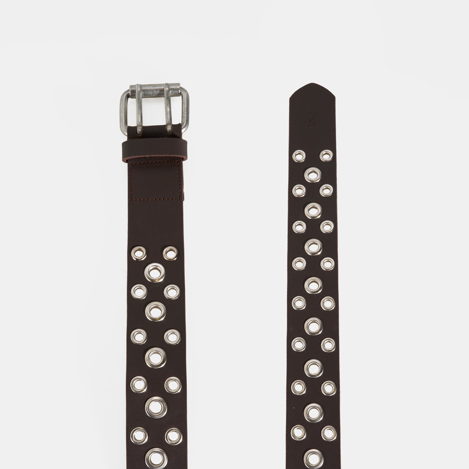 Deri yapısı ve kemer boyunca yer alan metal halka detaylarıyla öne çıkan bu kemer, modern ve güçlü bir stil sunar.