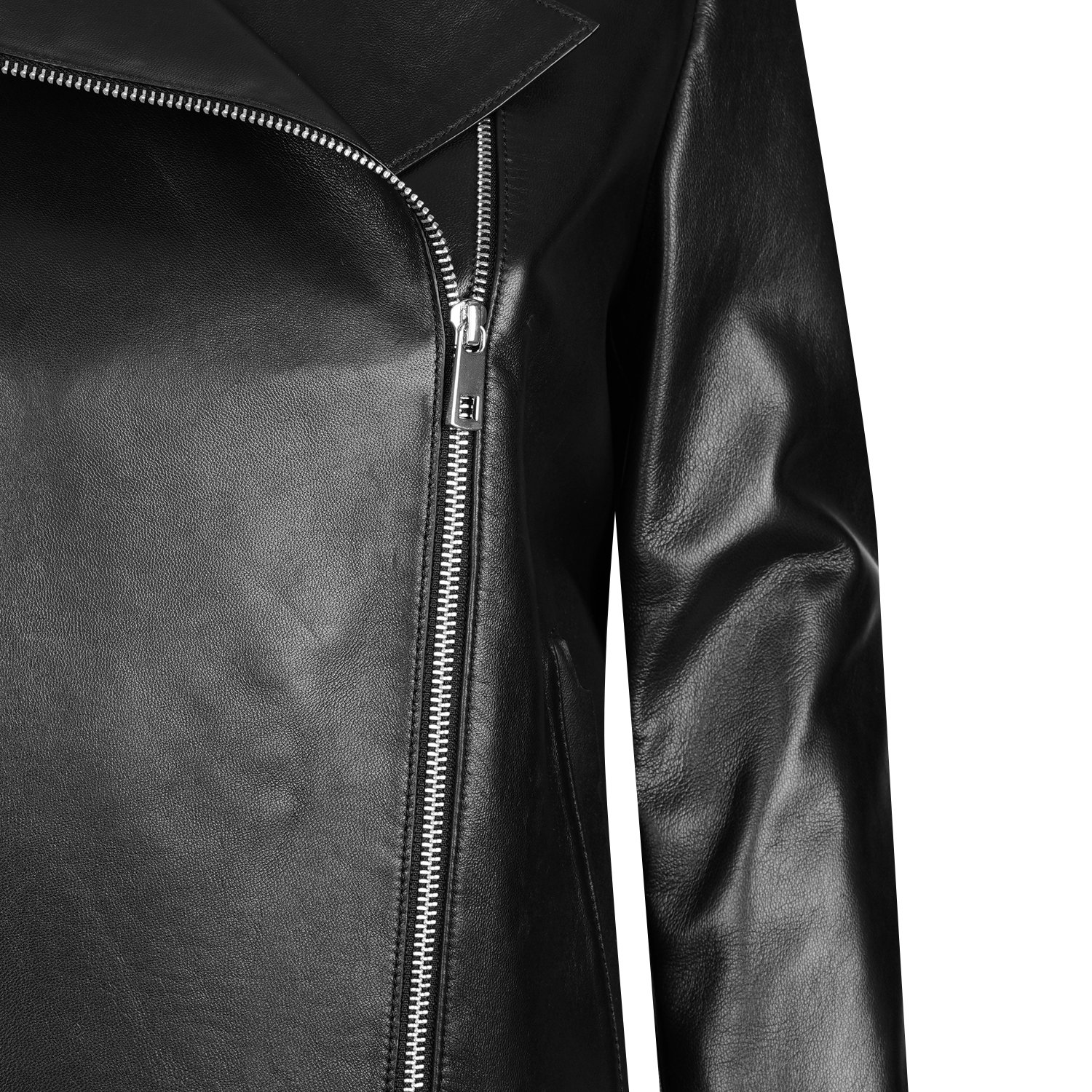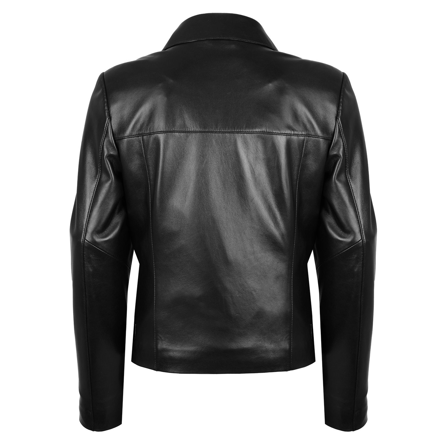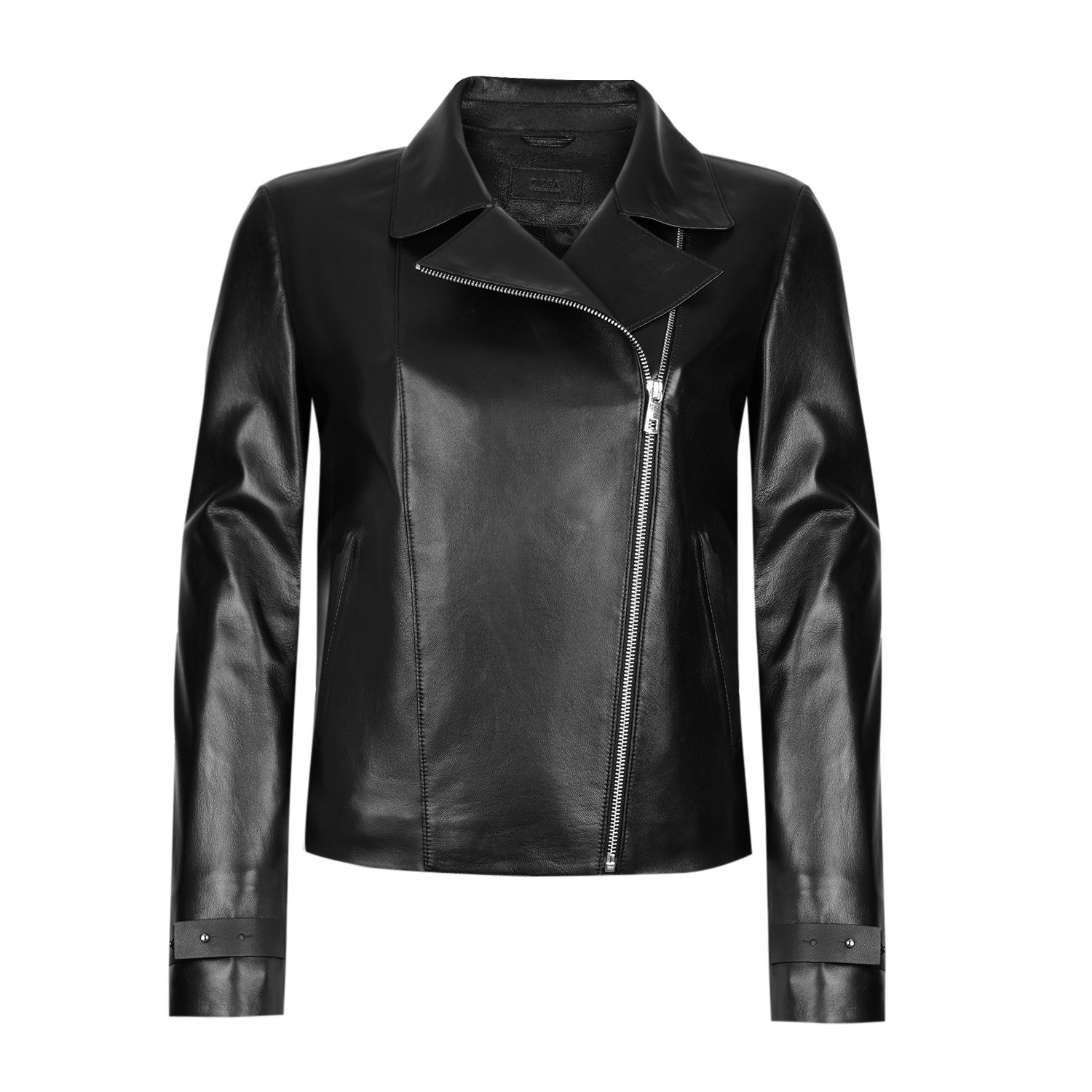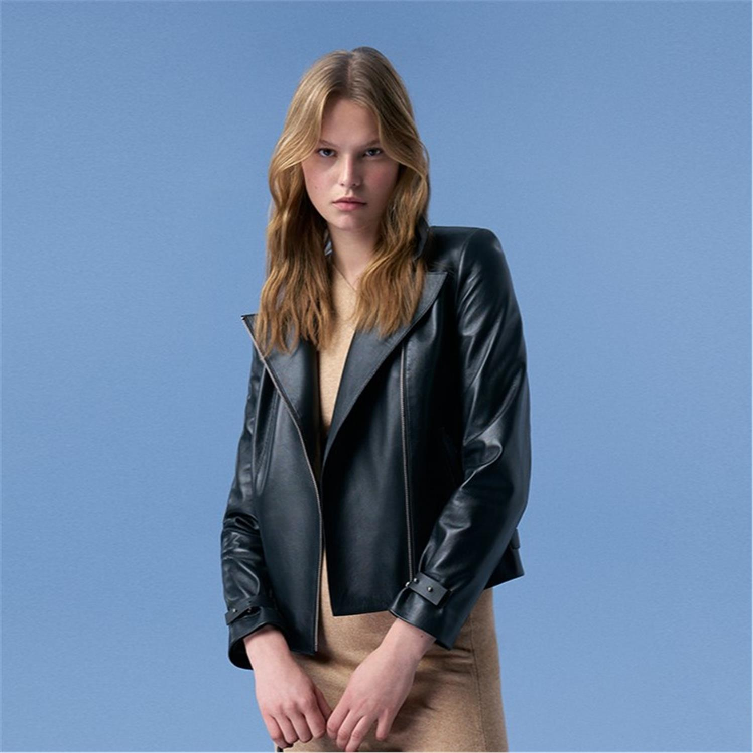 Kadın yakalı biker deri ceket.