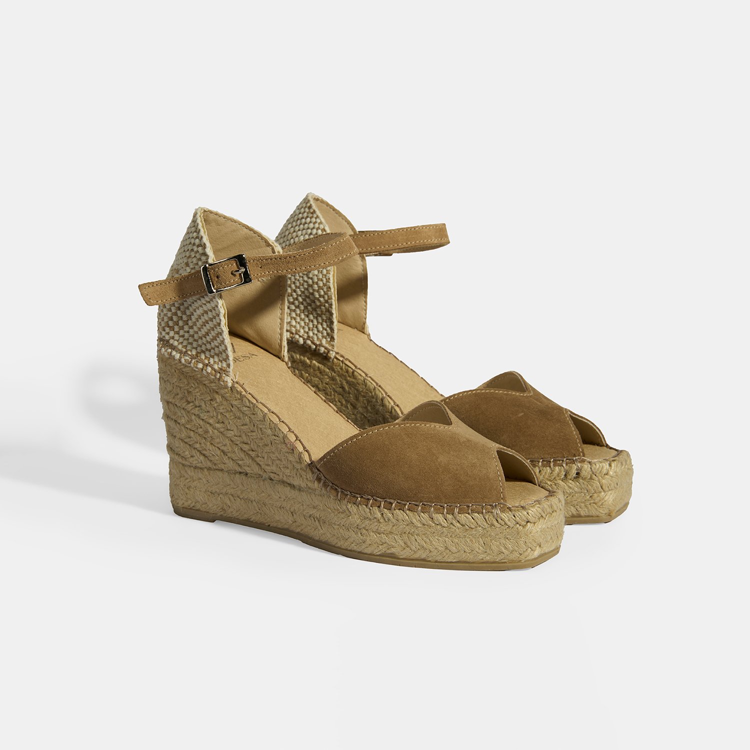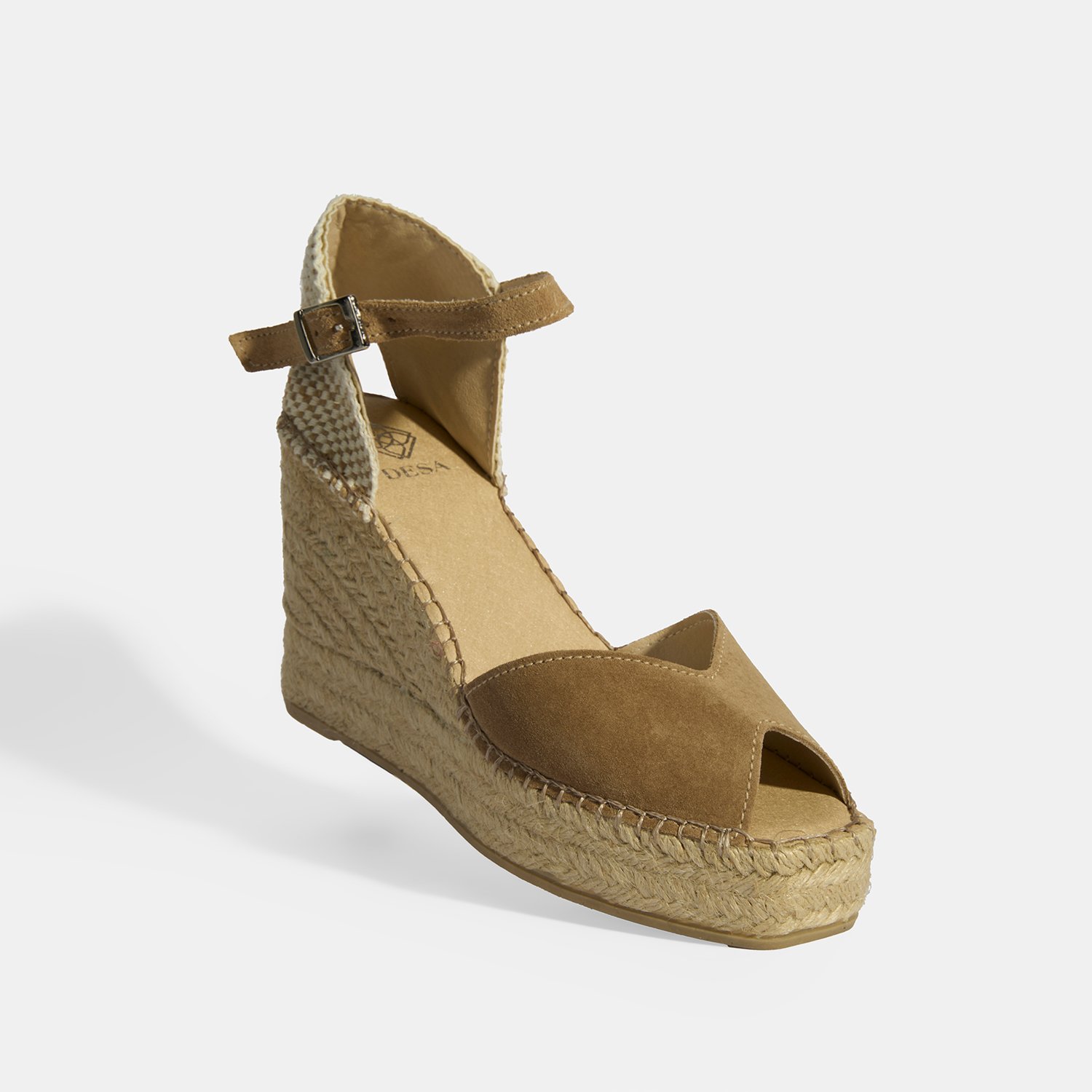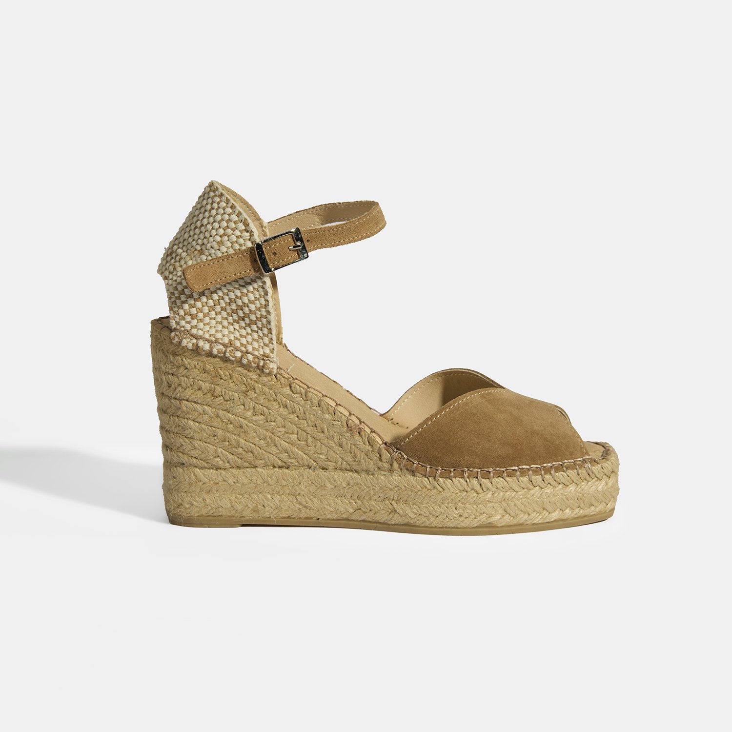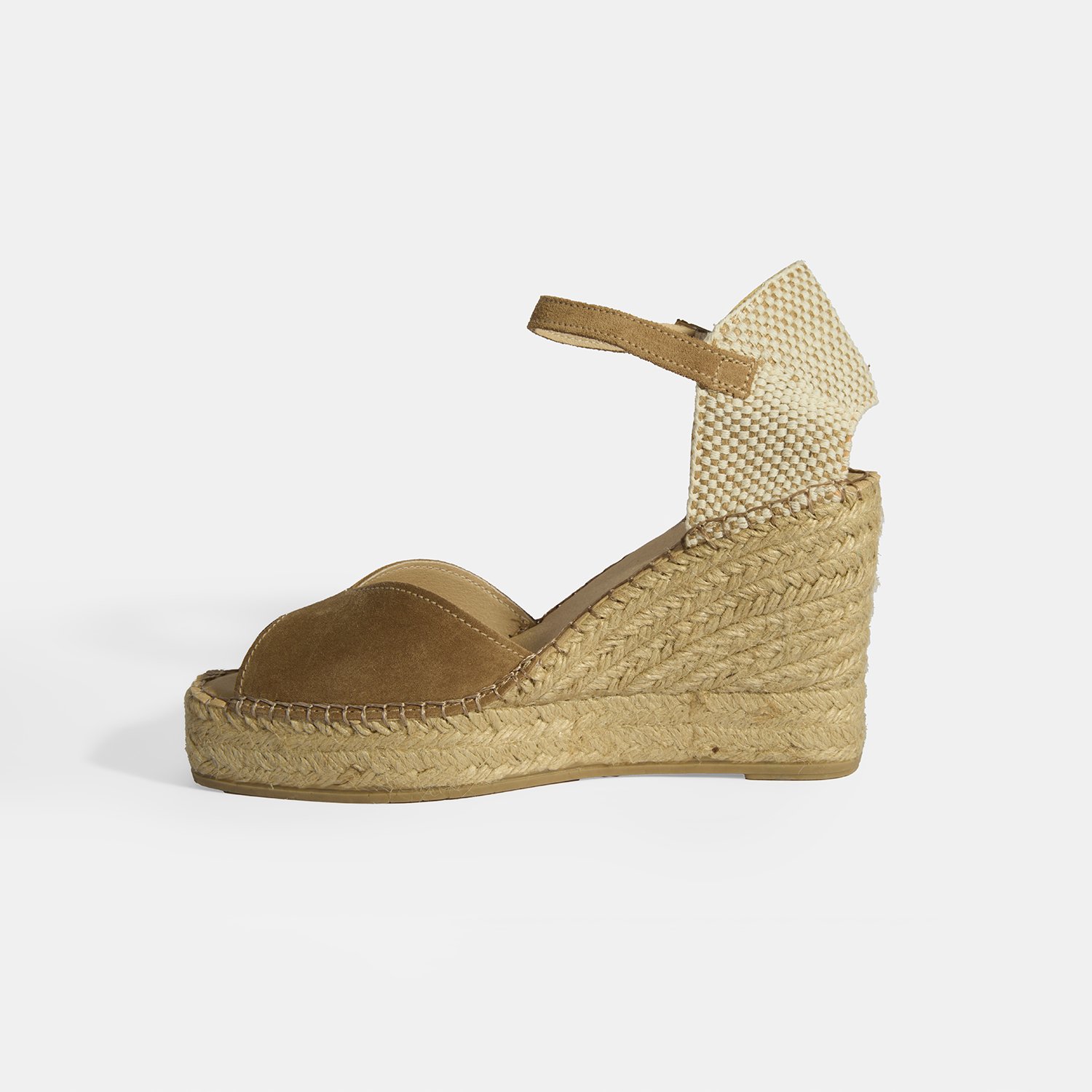 %100 süet deri, deri iç tabanlı, deri astarlı, ayarlanabilir metal tokalı, jüt sargılı tpu tabanlı, kadın dolgu topuklu espadril.