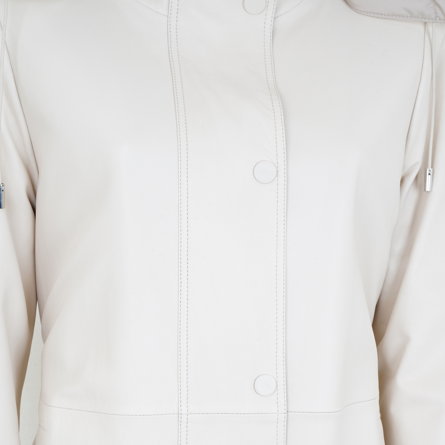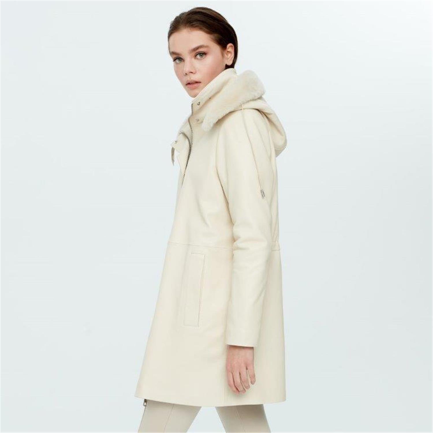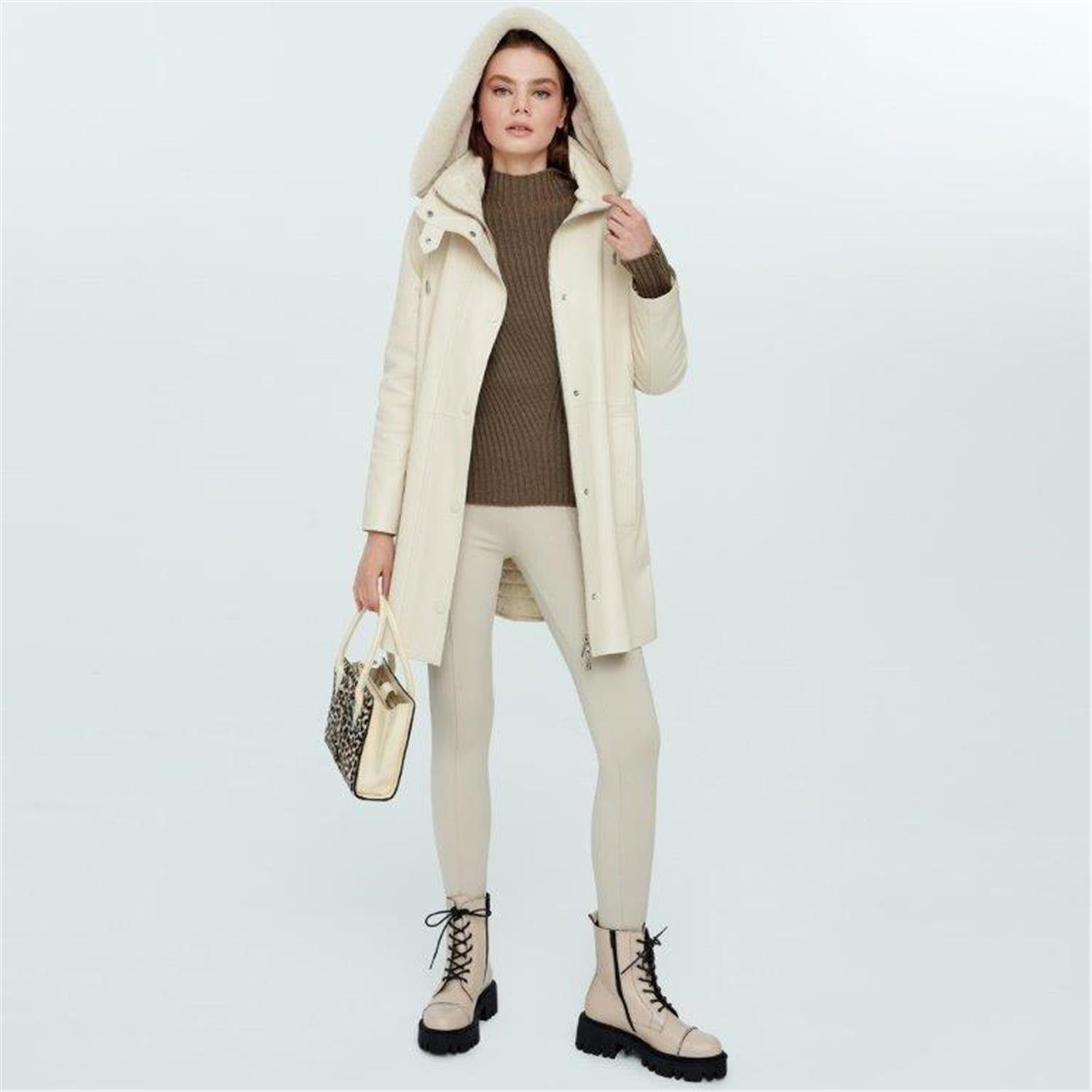 Biana Krem Kadın Kapüşonlu Deri Kaban