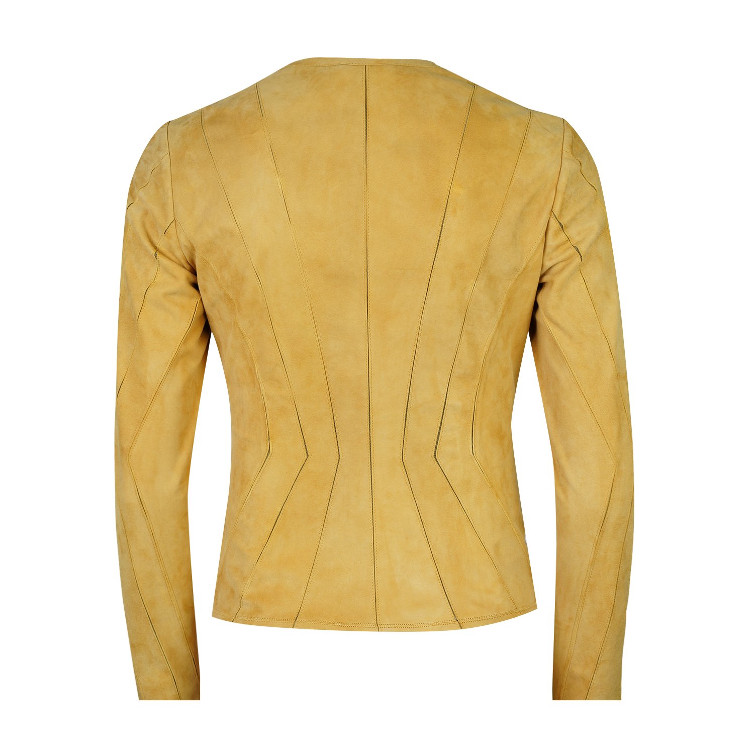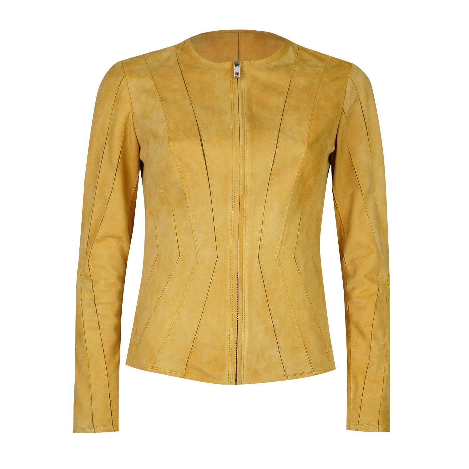 Kadın yuvarlak yakalı fit panelli süet deri ceket.