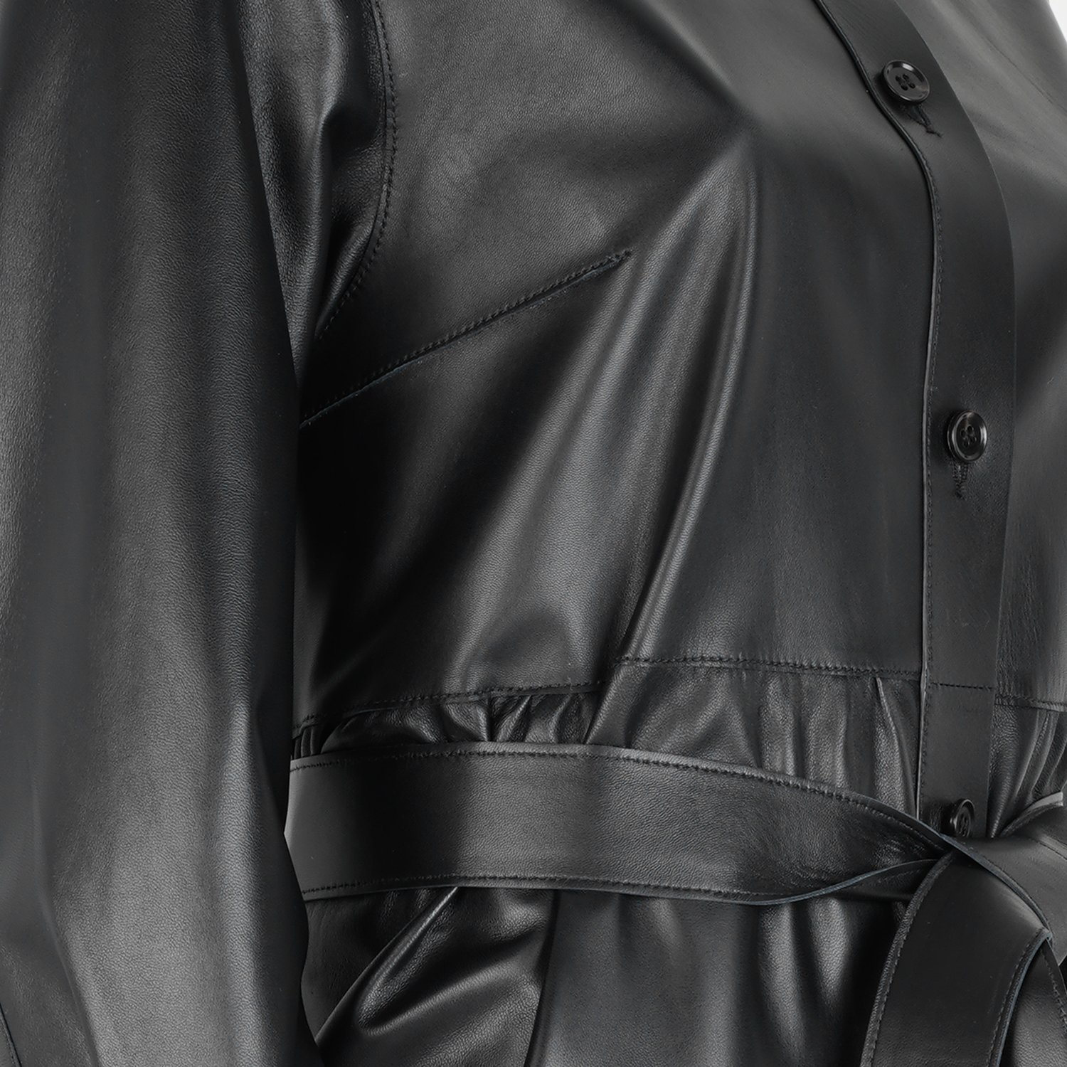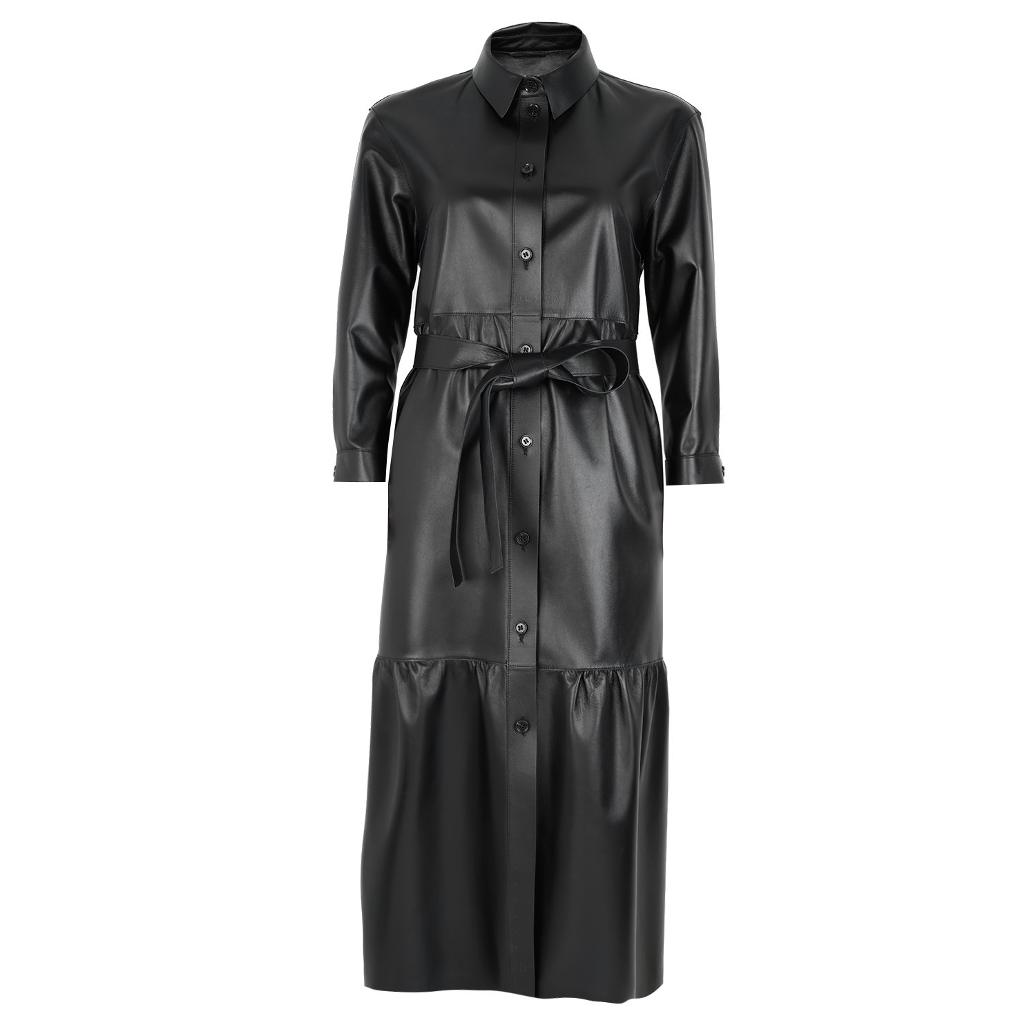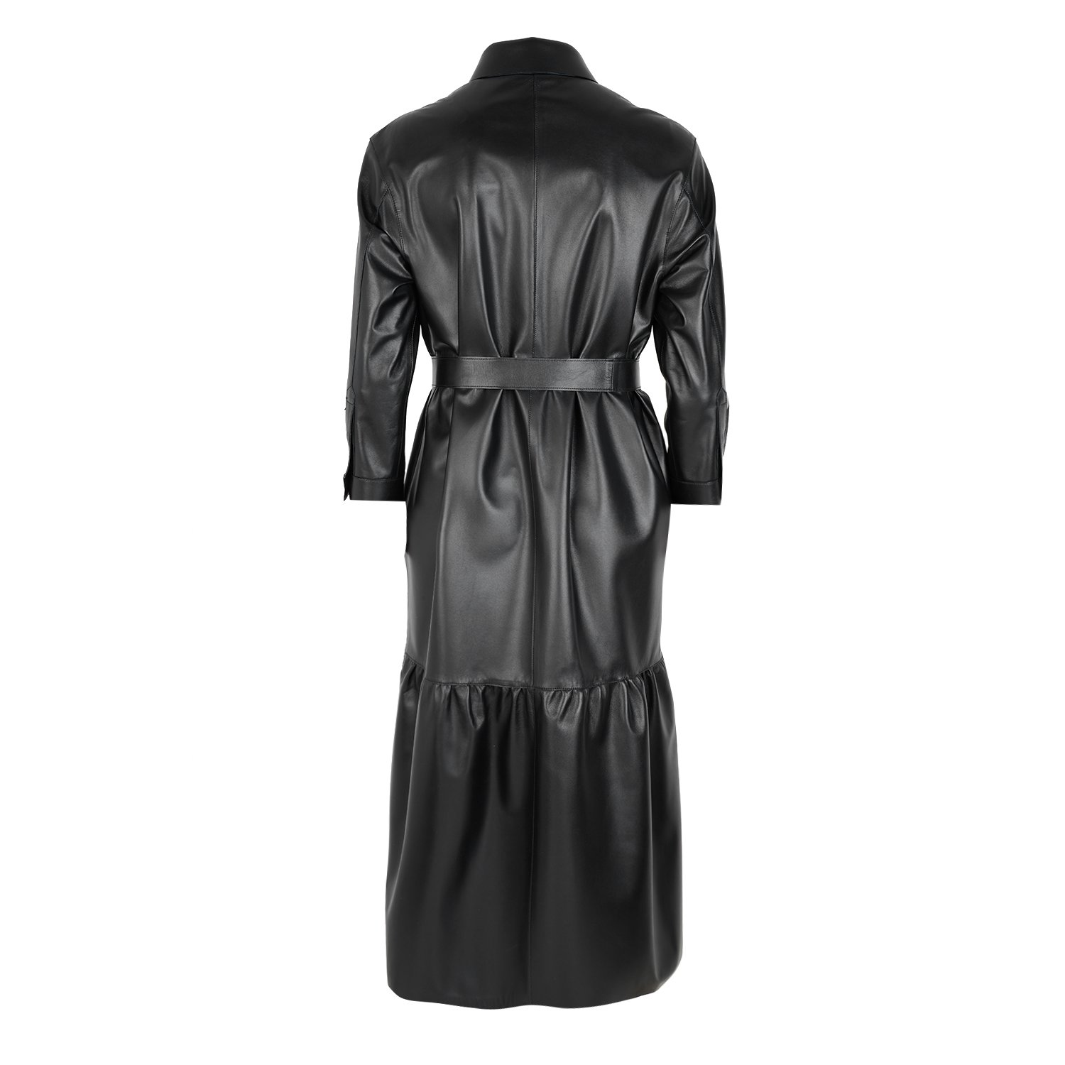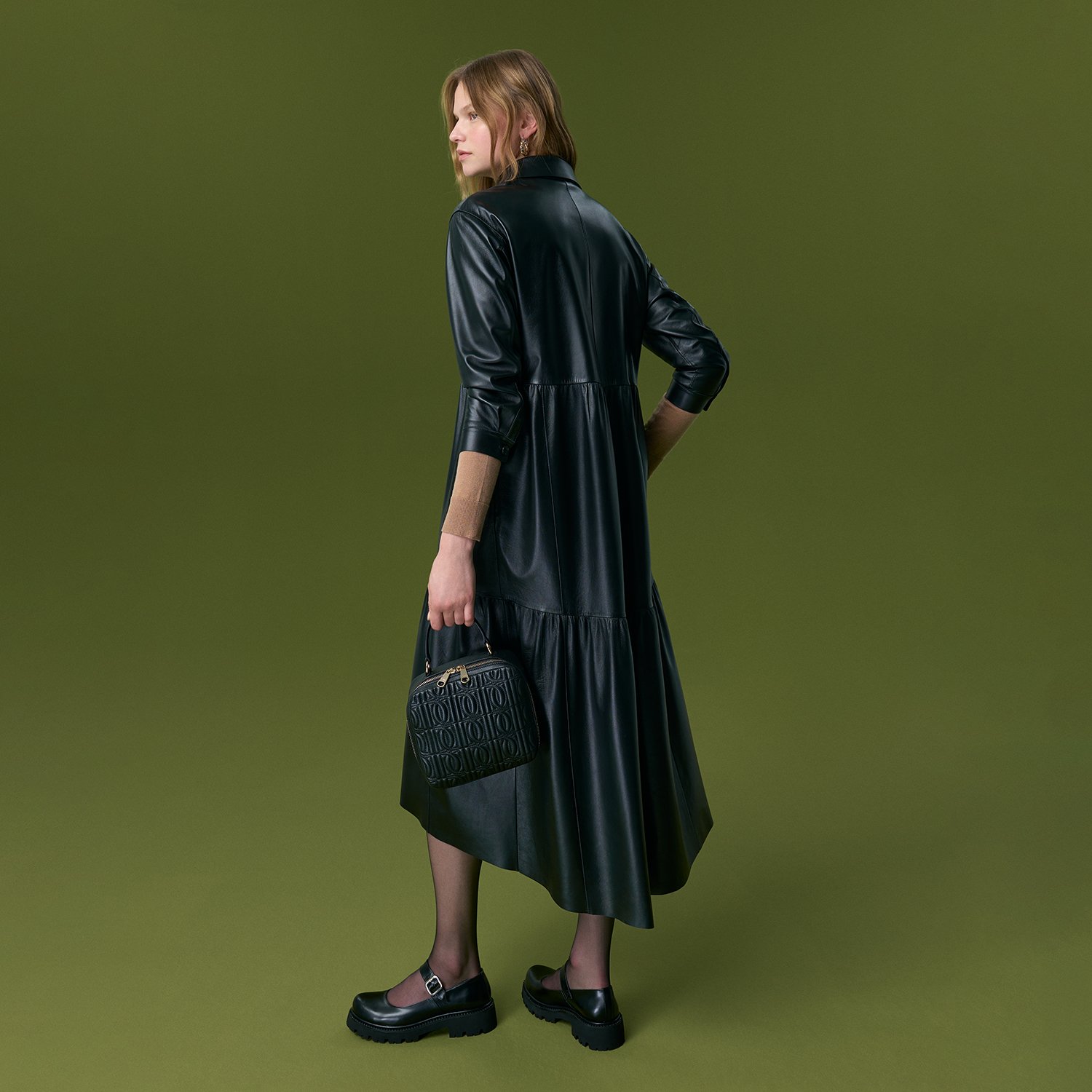 Yakalı, büzgü detaylı kadın uzun boy deri elbise.