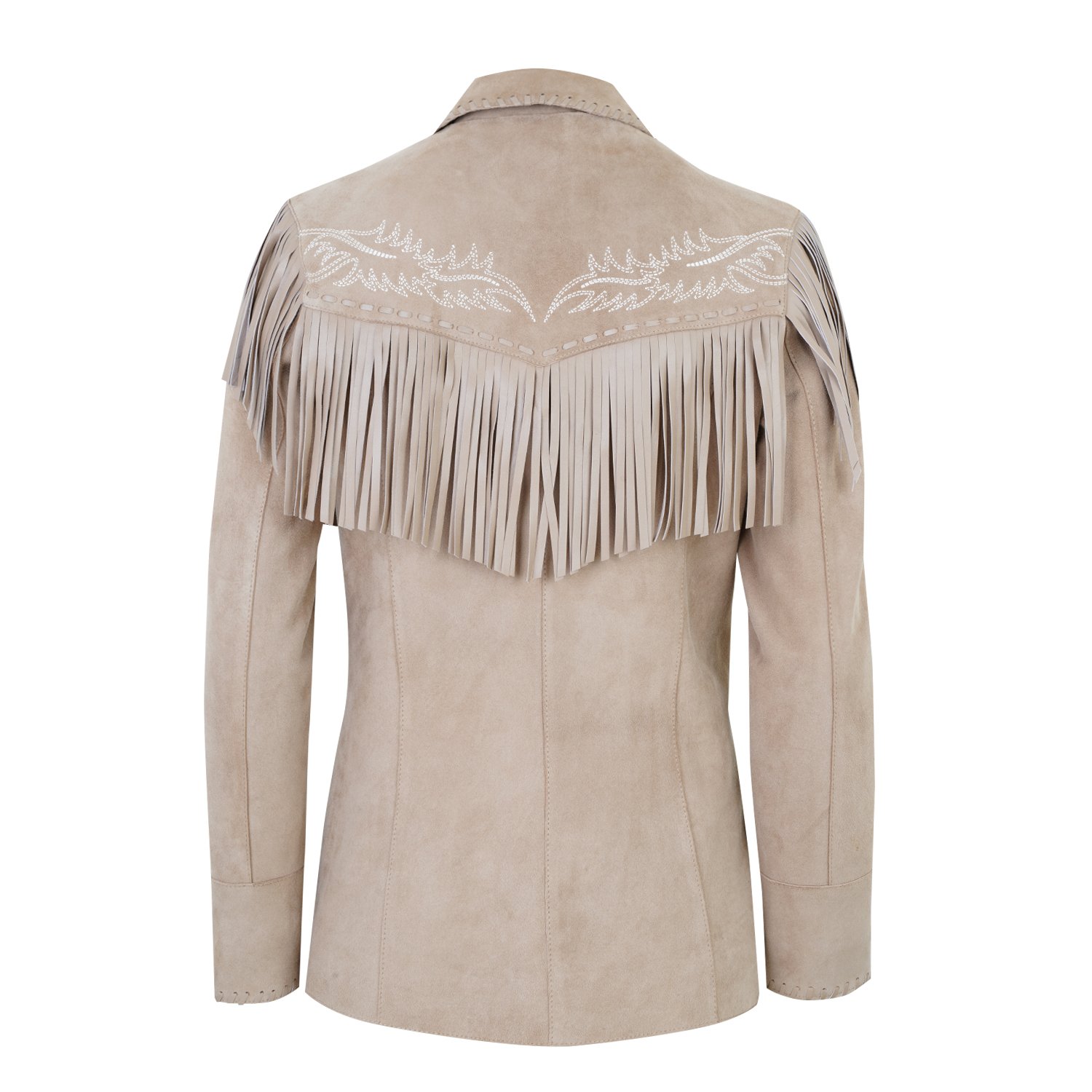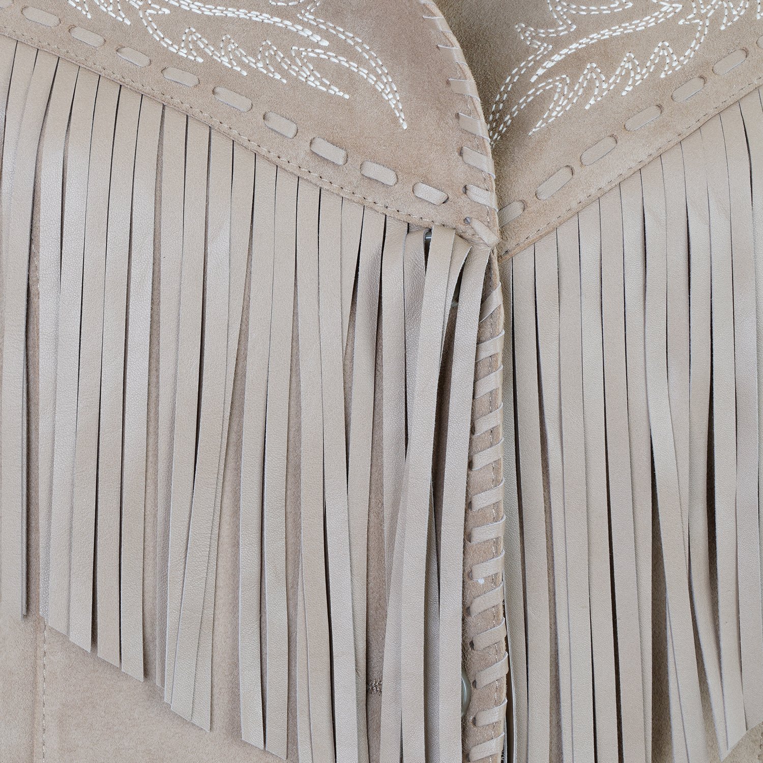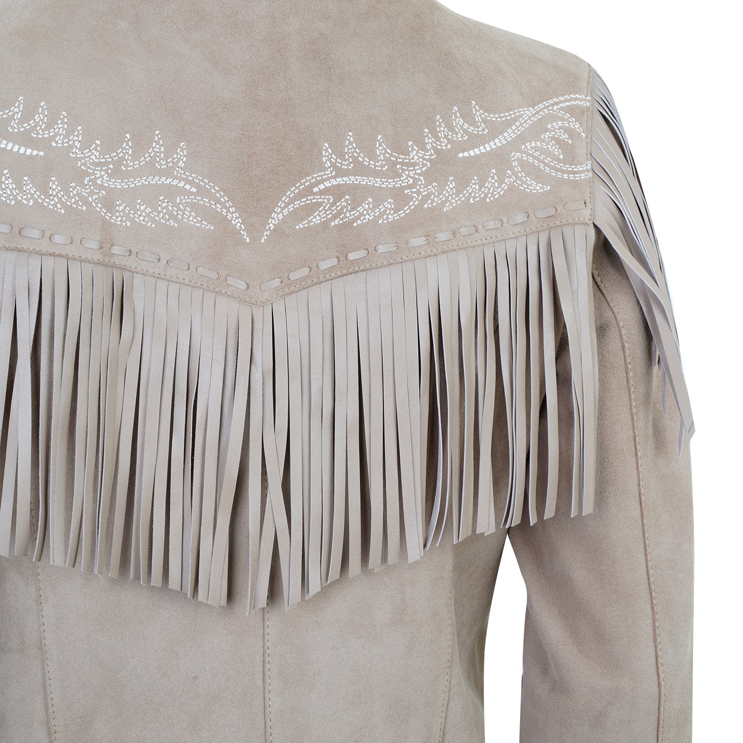 Yakalı, western nakış detaylı, deri püsküllü kadın süet deri ceket.