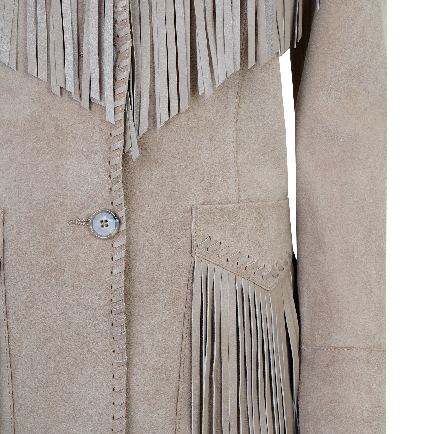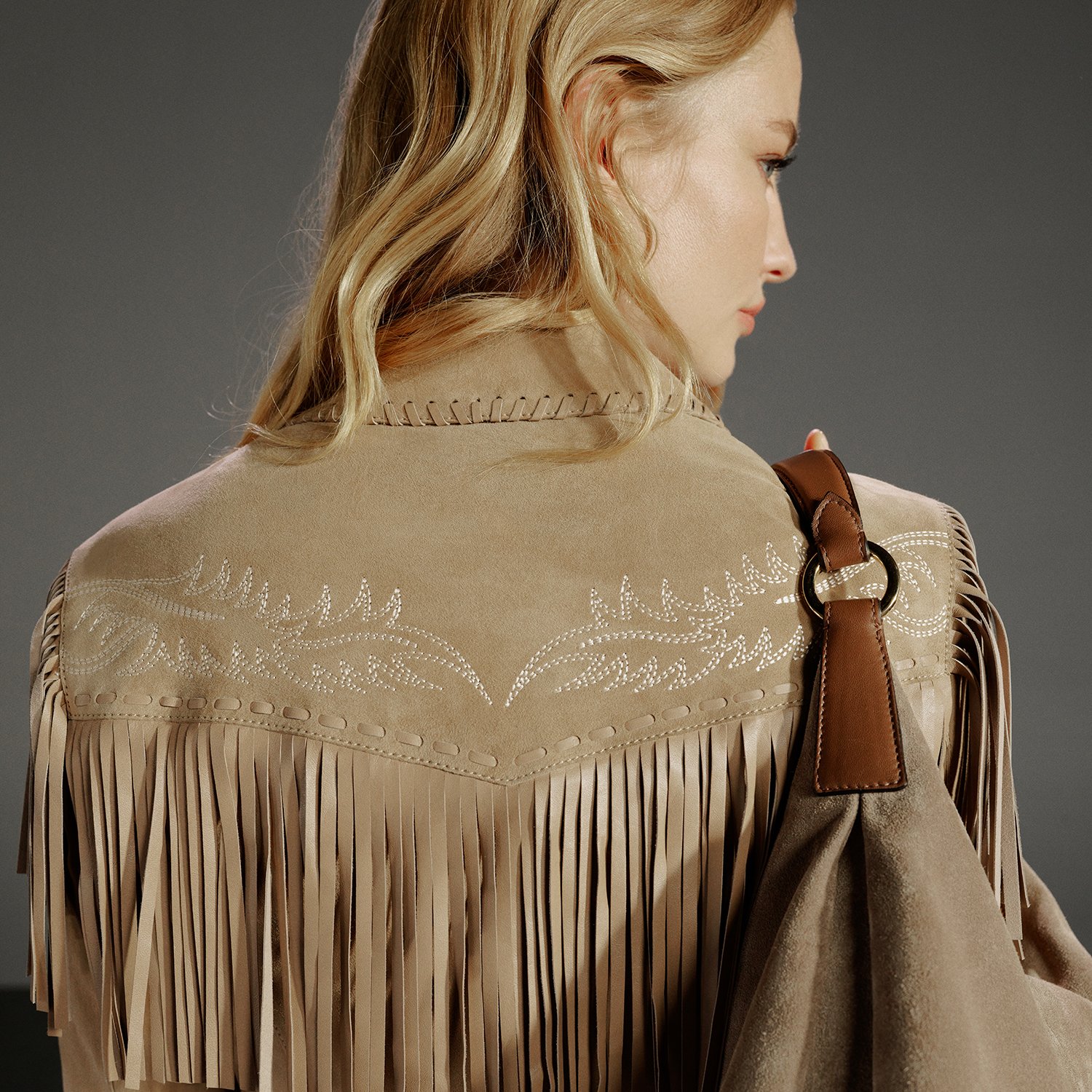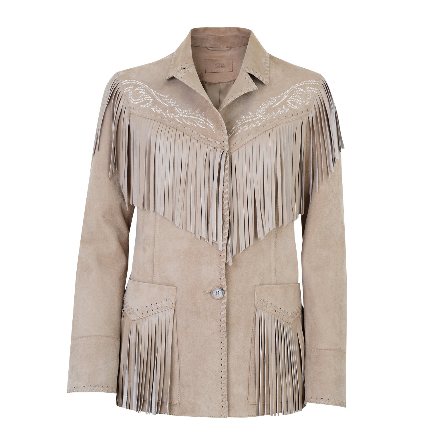 Yakalı, western nakış detaylı, deri püsküllü kadın süet deri ceket.
