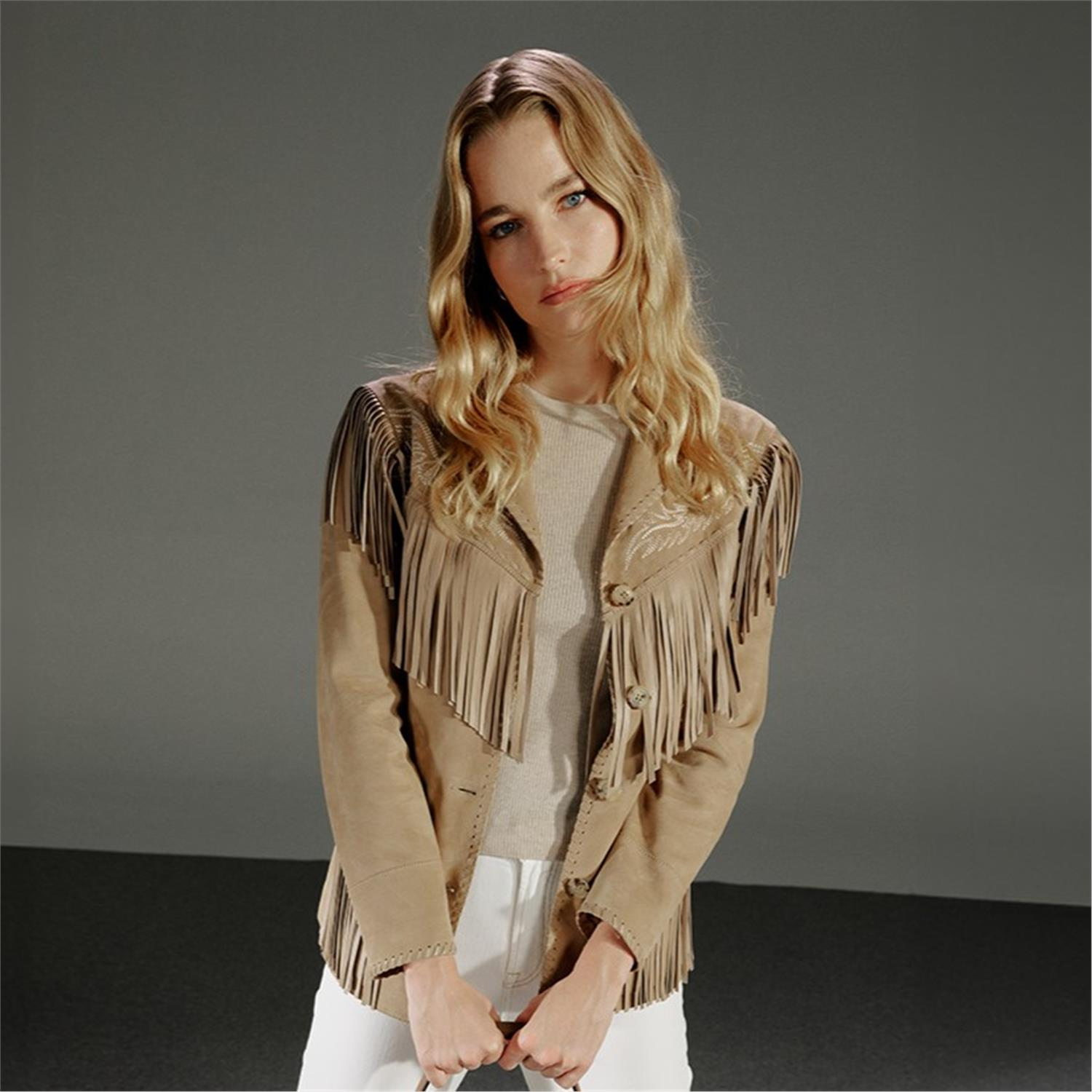 Breahne Bej Kadın Püsküllü Western Deri Ceket
