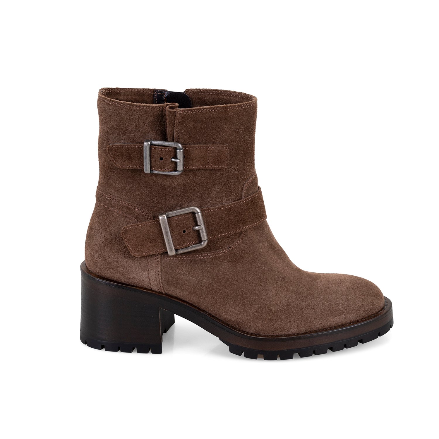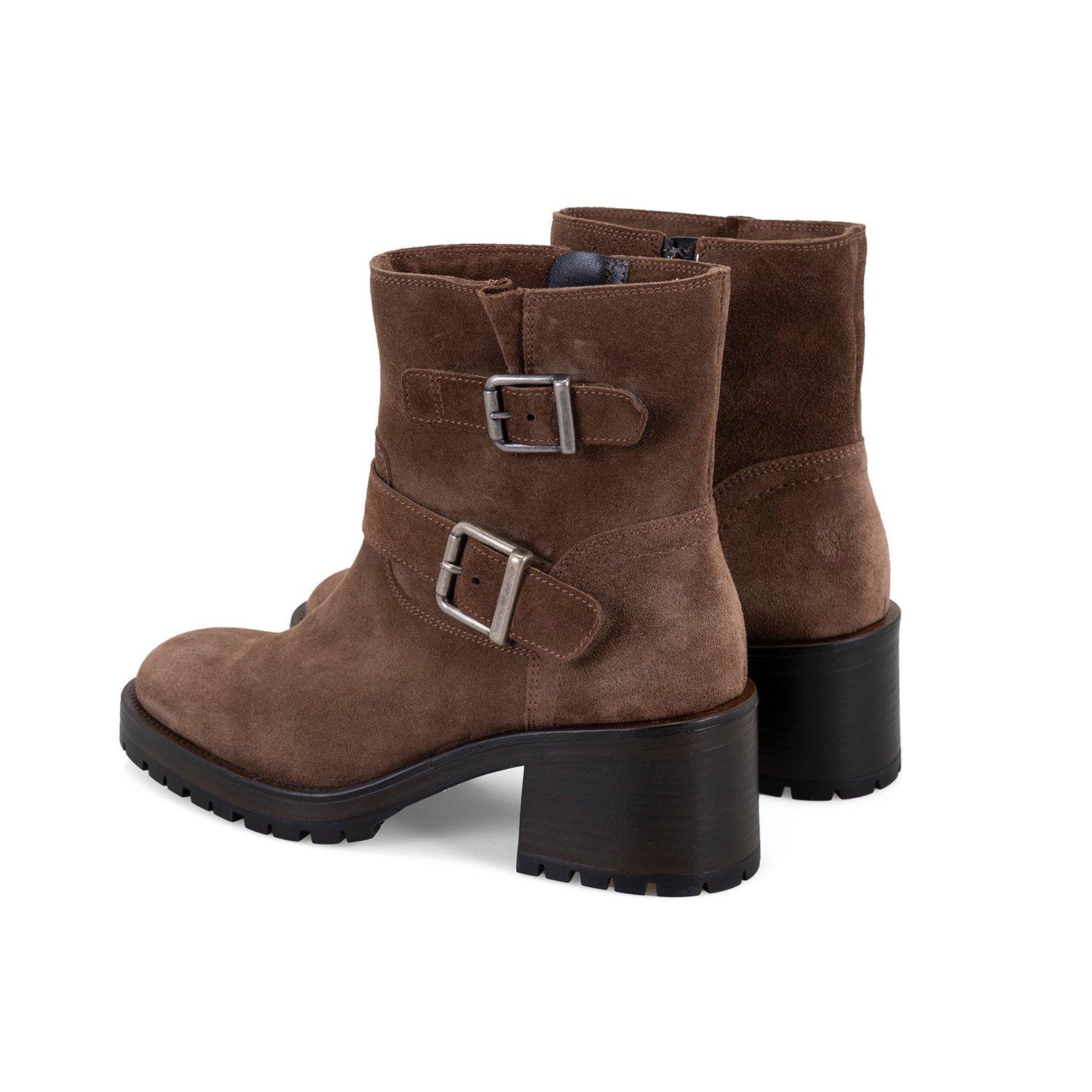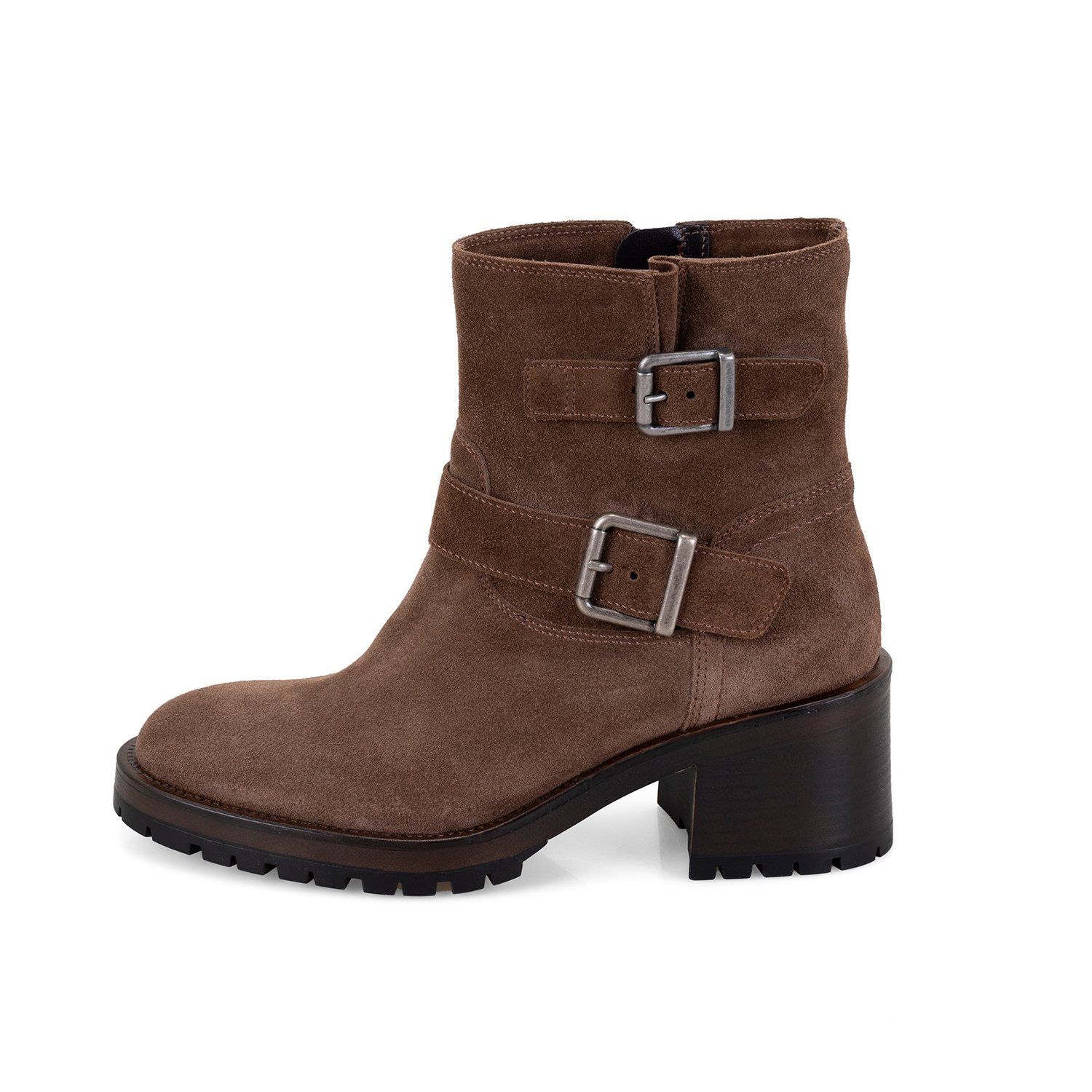 %100 süet deri, deri iç tabanlı, tekstil astarlı, metal toka aksesuarlı, termo tabanlı, içten fermuarlı kadın biker bot.