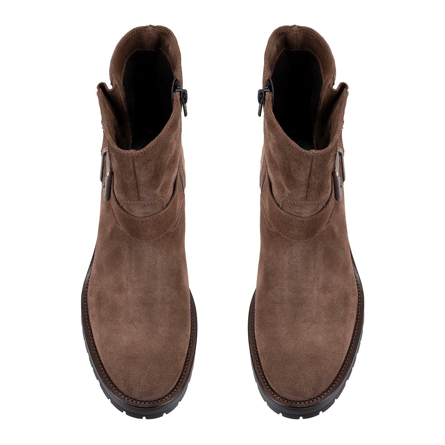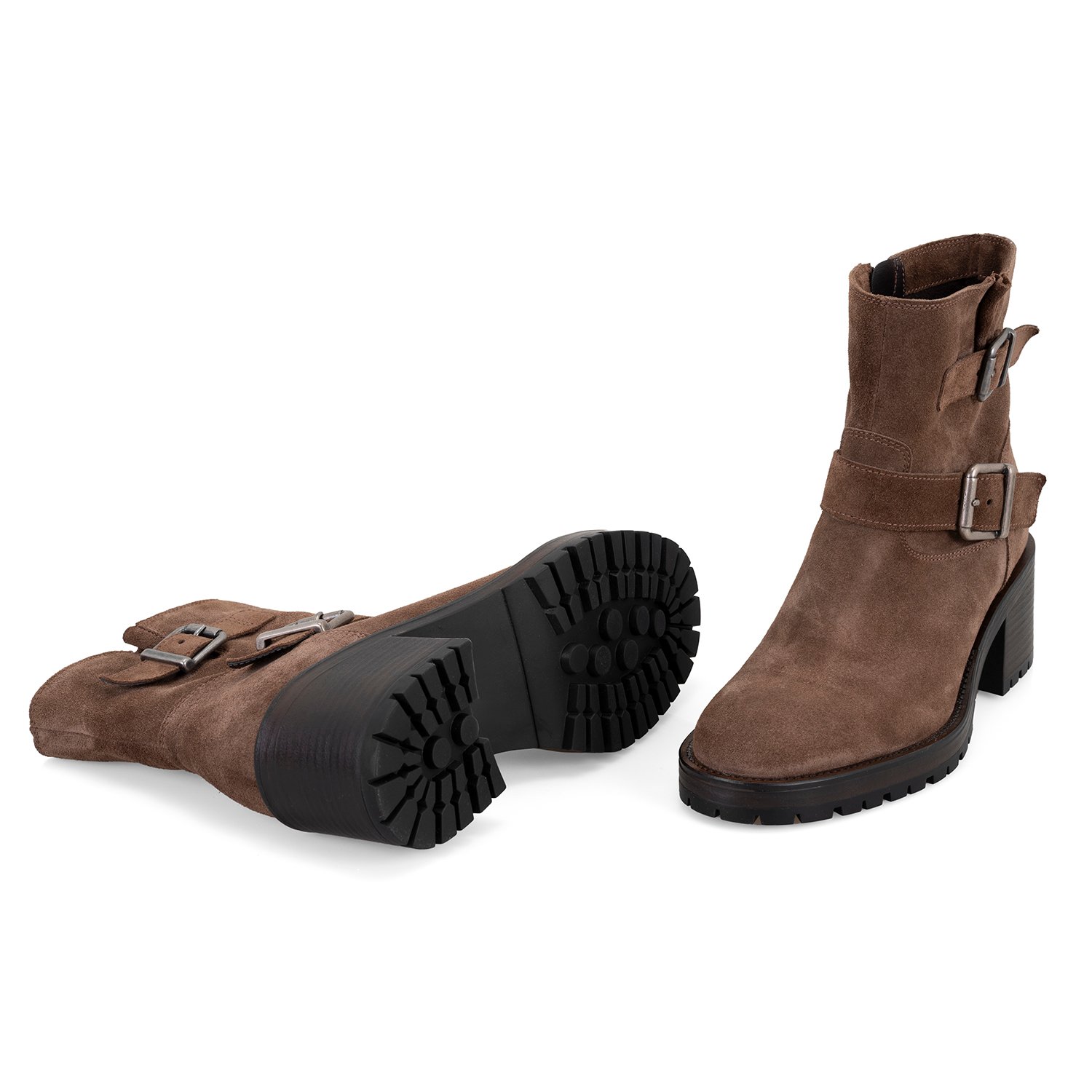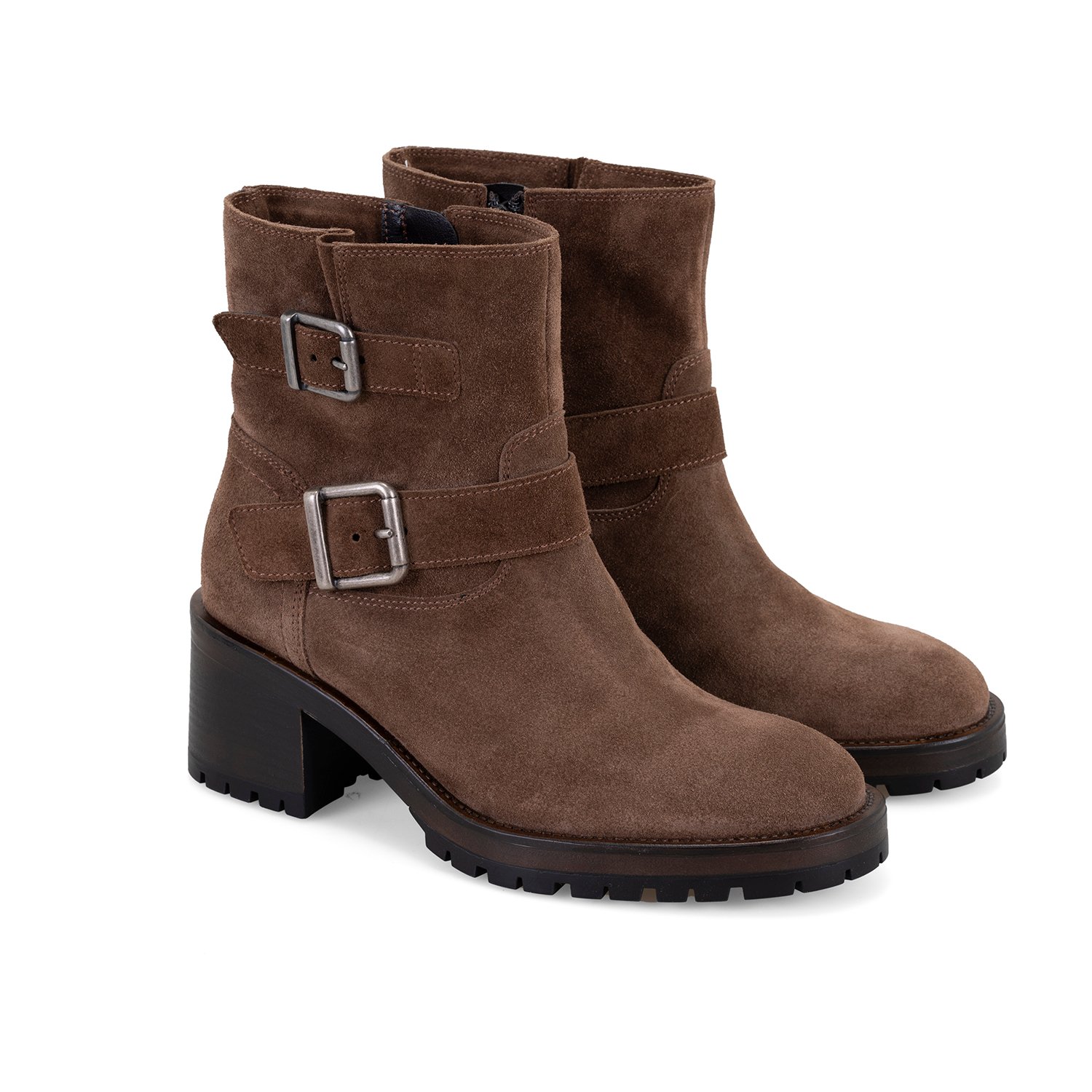 %100 süet deri, deri iç tabanlı, tekstil astarlı, metal toka aksesuarlı, termo tabanlı, içten fermuarlı kadın biker bot.