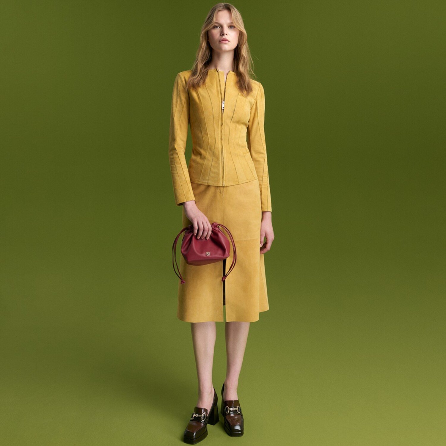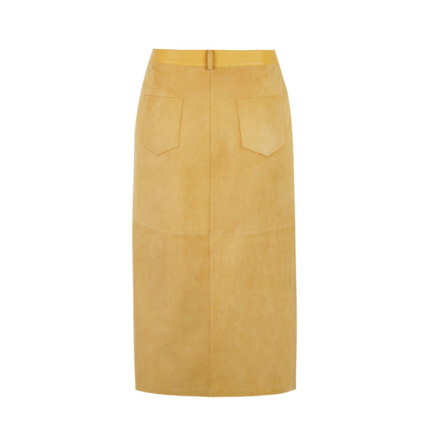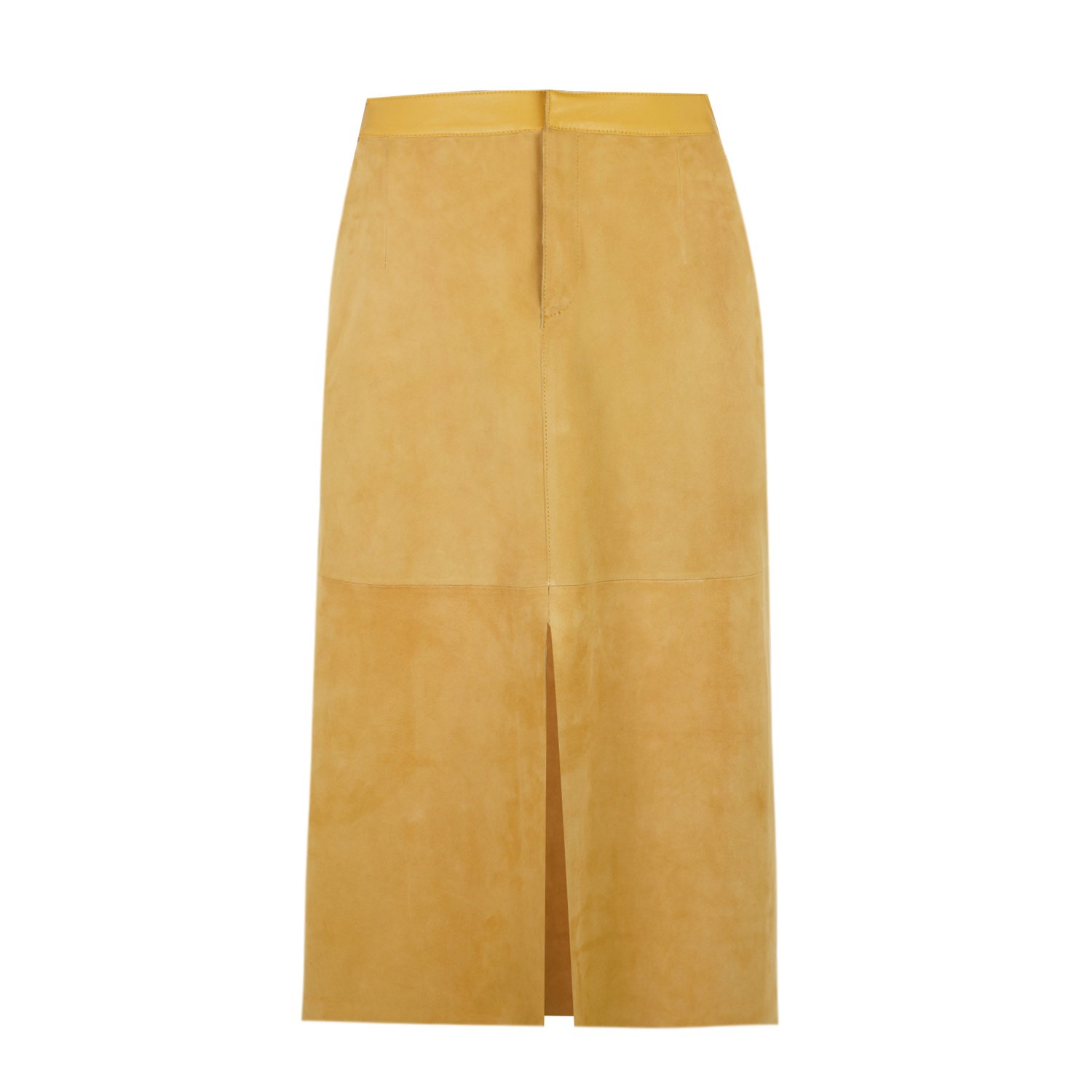 Kadın yüksek bel, A form, yırtmaç detaylı midi boy deri etek.