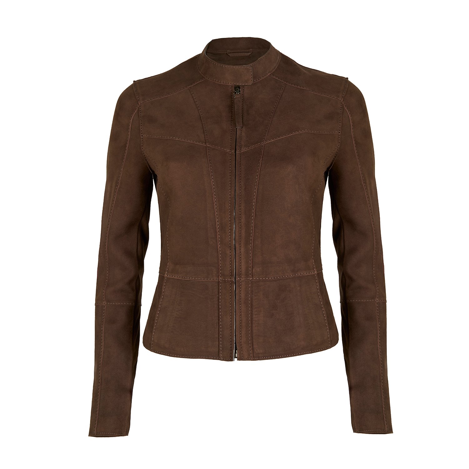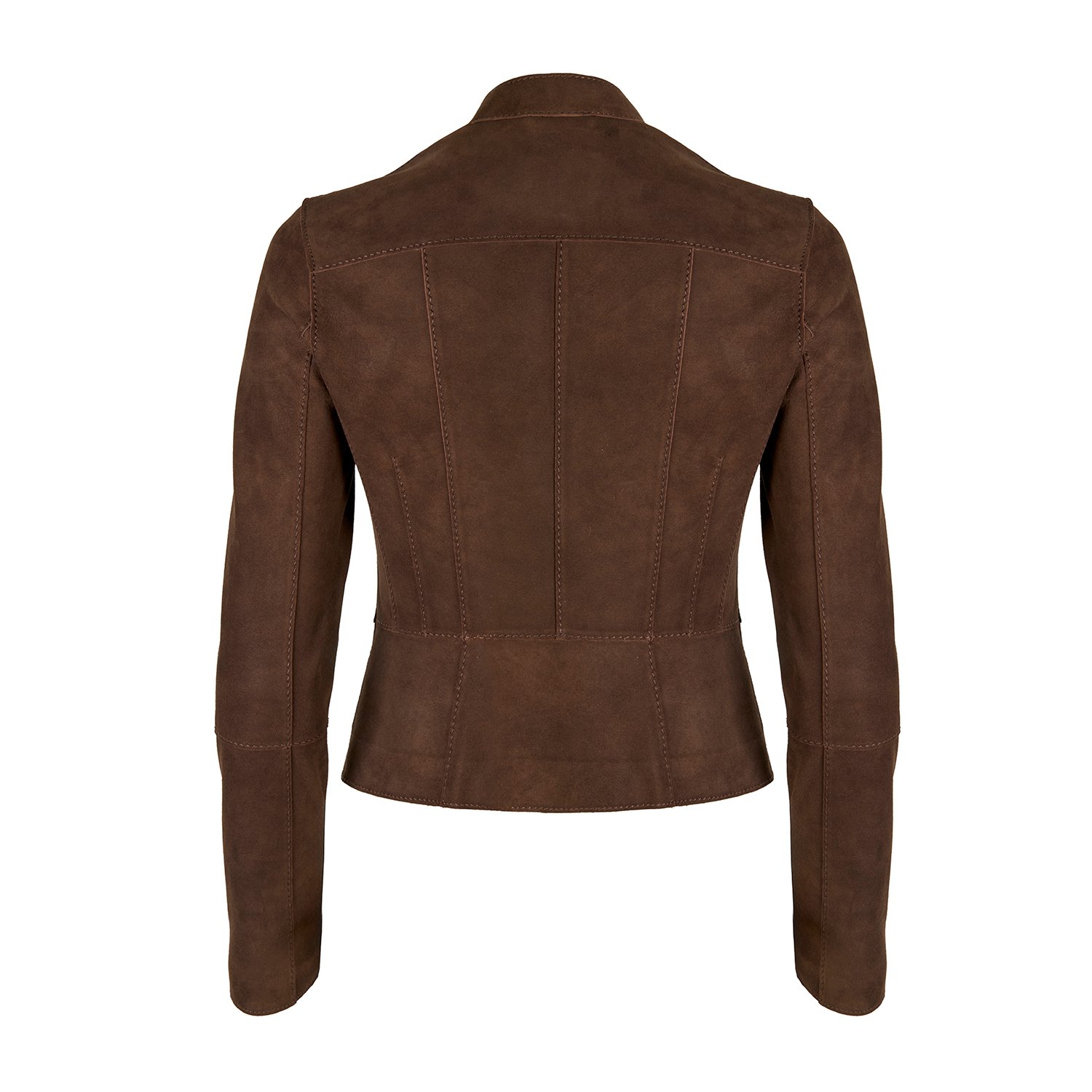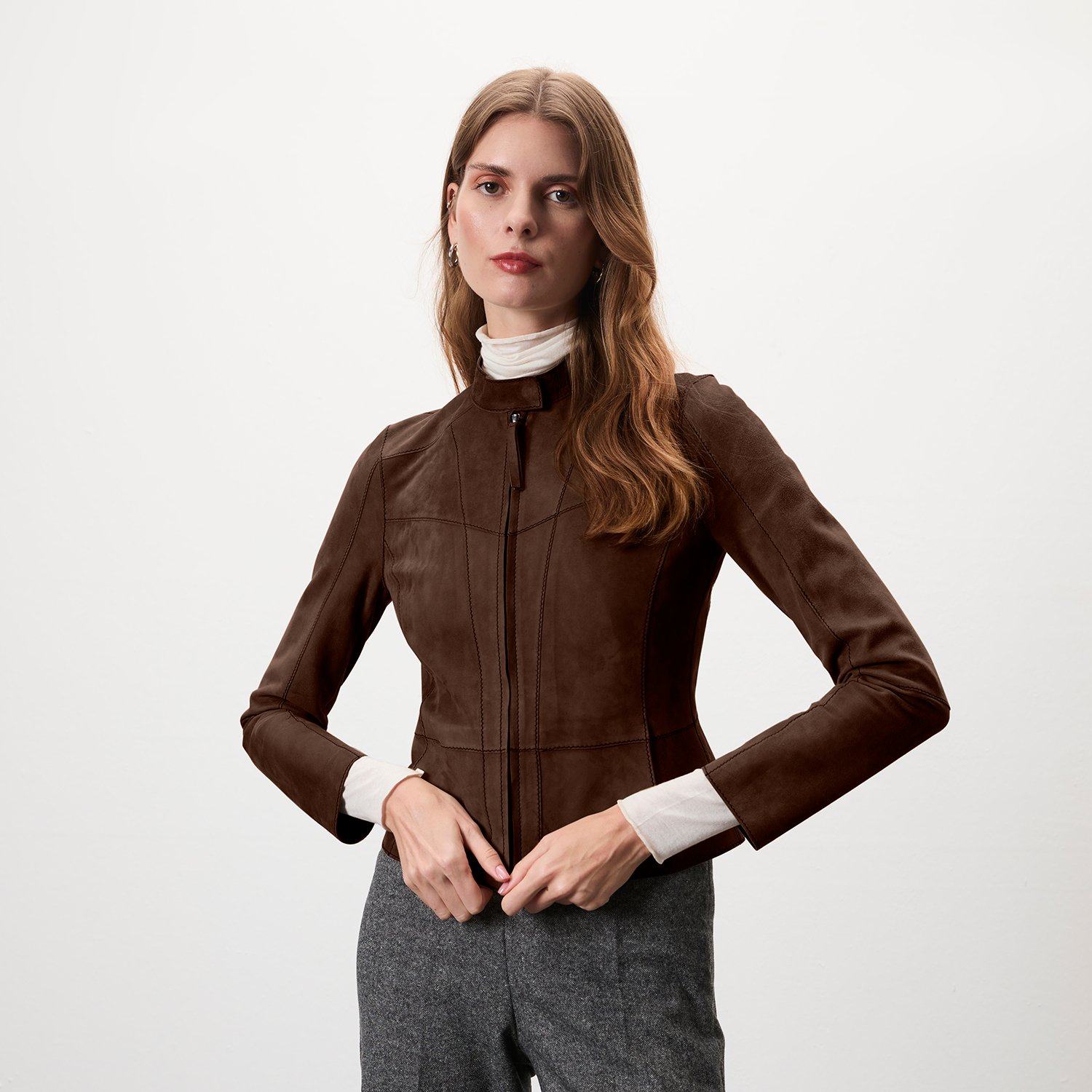 Kadın hafif hakim yakalı fit süet deri ceket.
