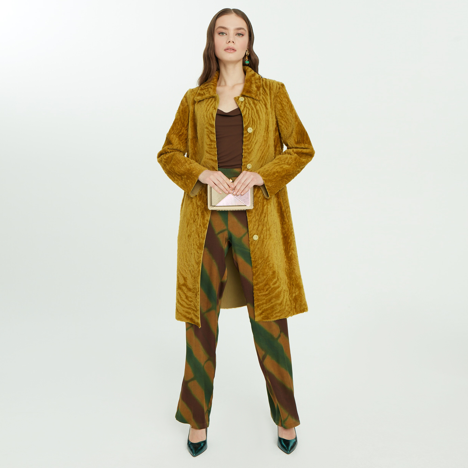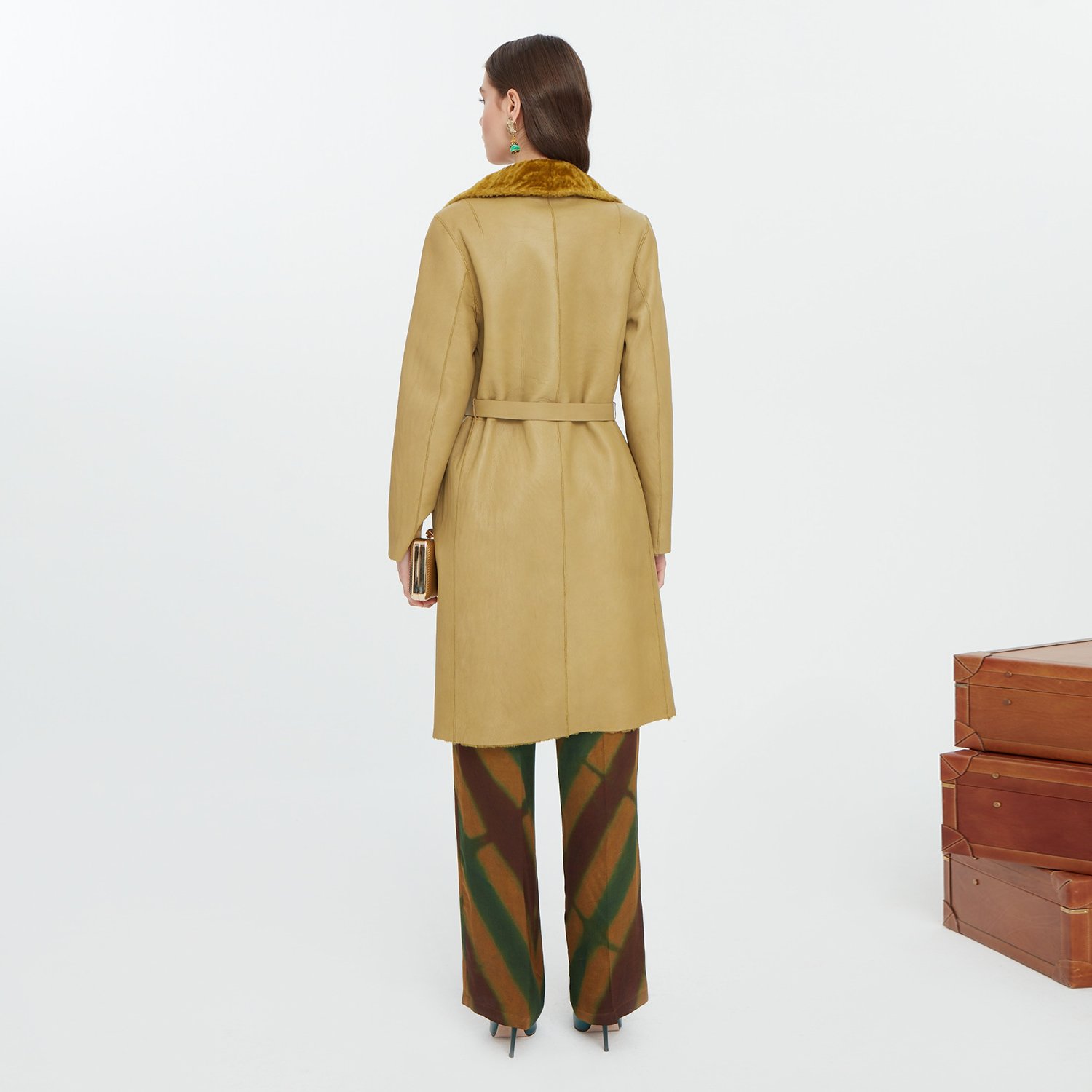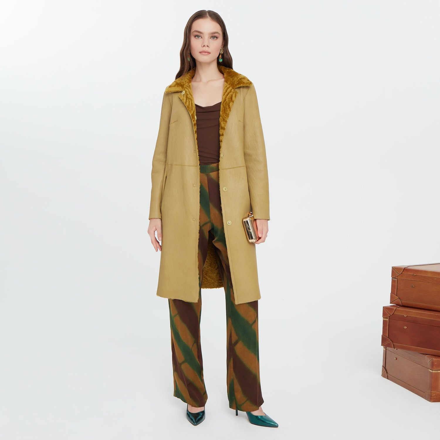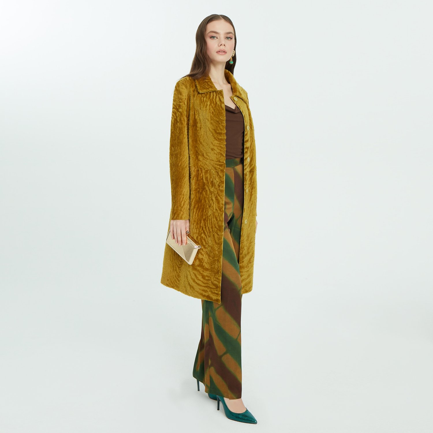 Kadın gömlek yakalı çift taraflı kürk kaban.