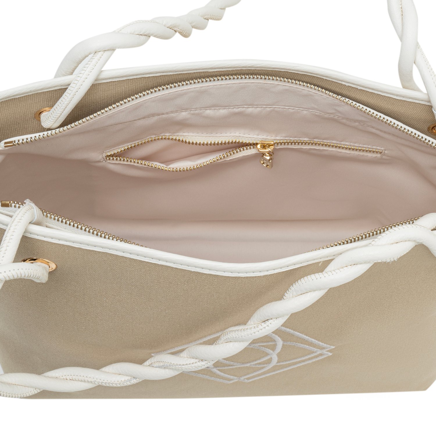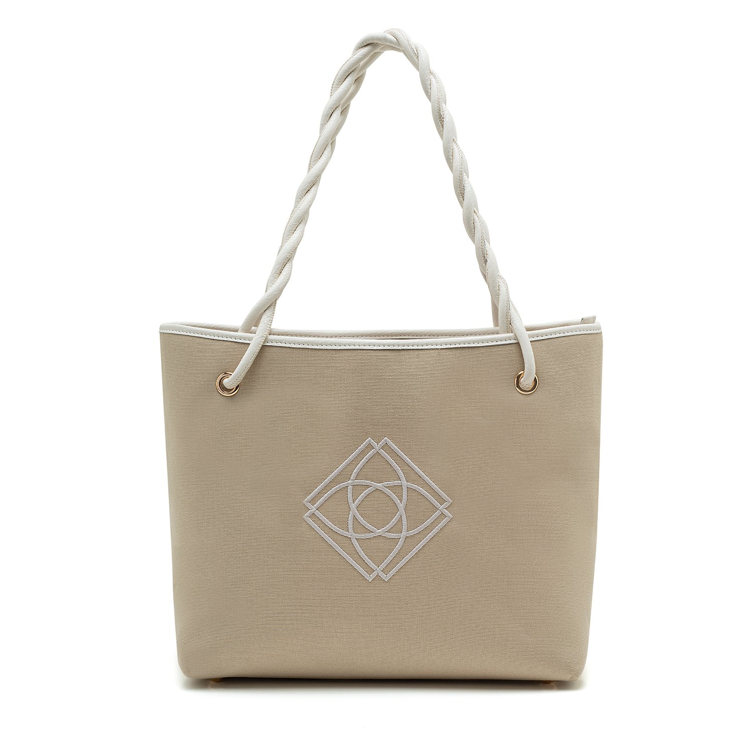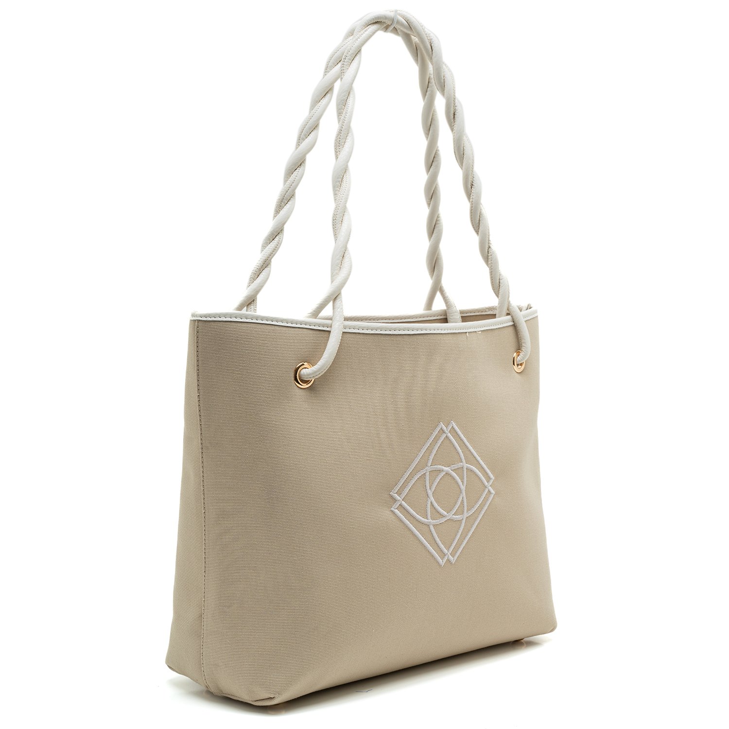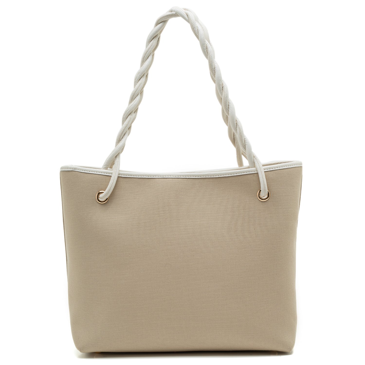 Kumaş ve derinin birleştiği kadın omuz çantasıdır.