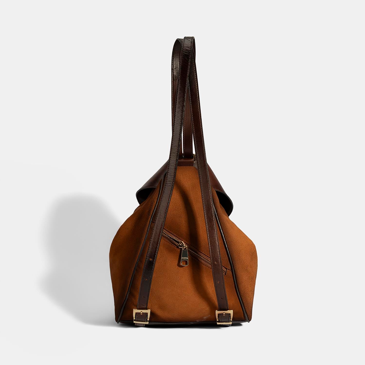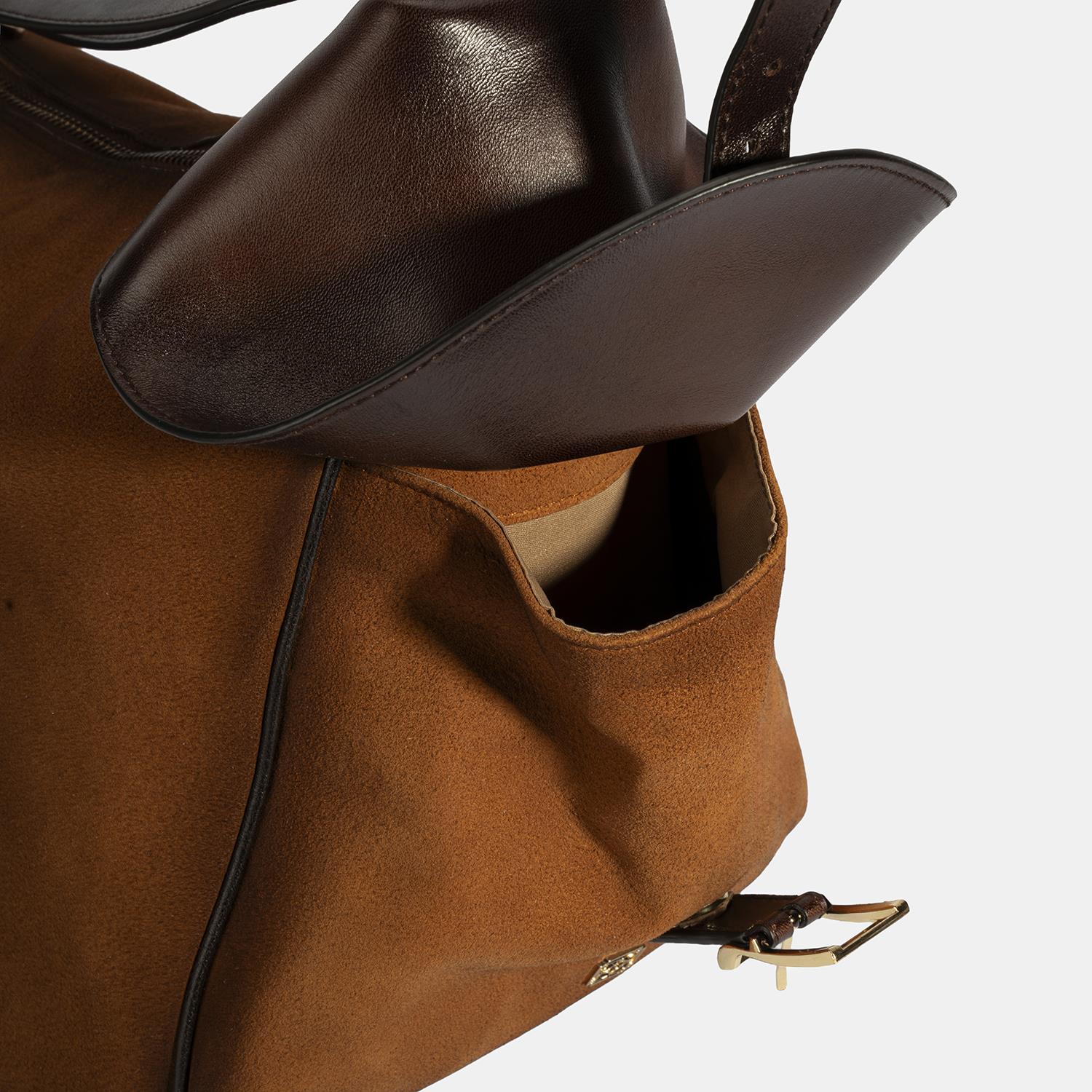 %100 gerçek deri ve süetten yapılmış kadın omuz ve sırt çantasıdır.