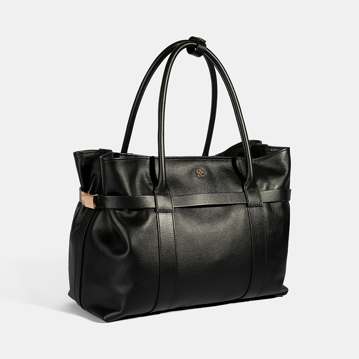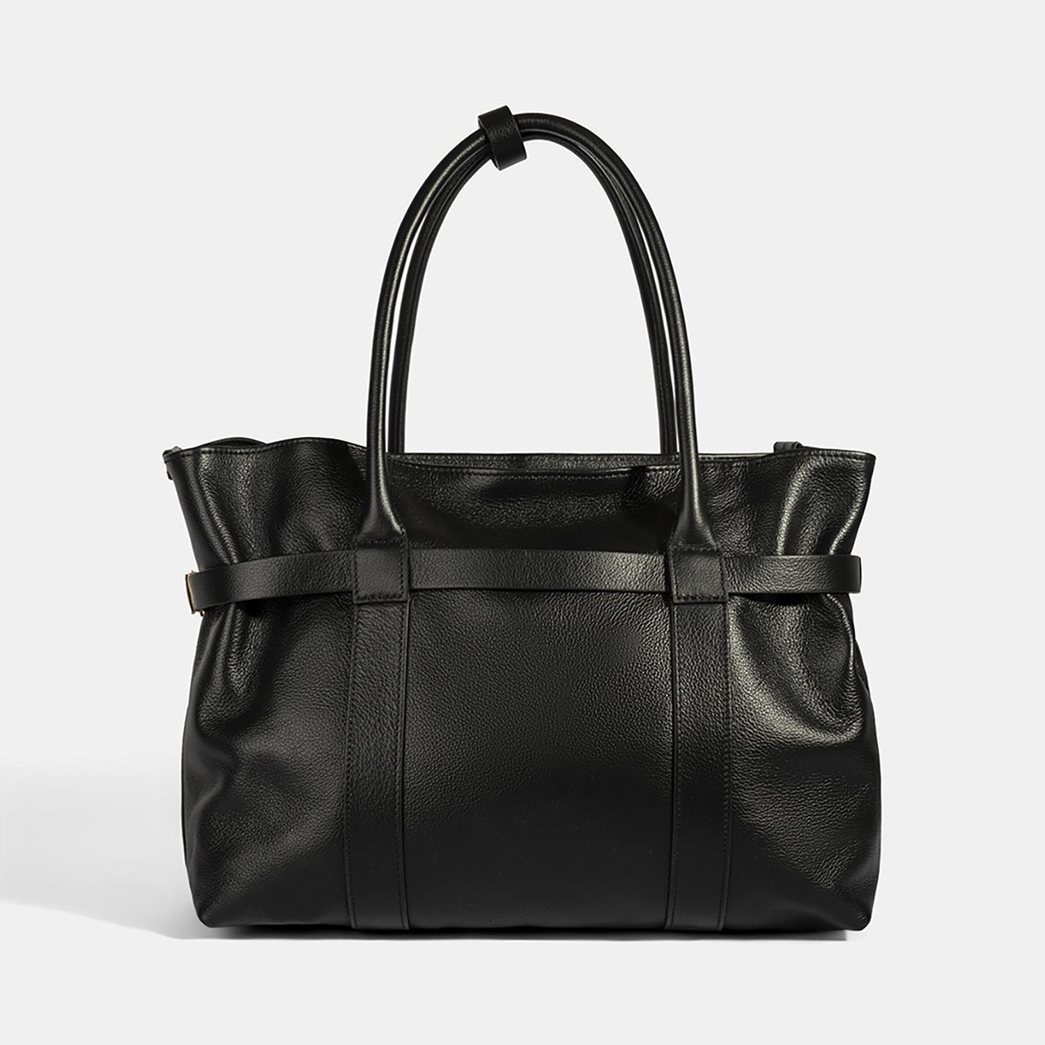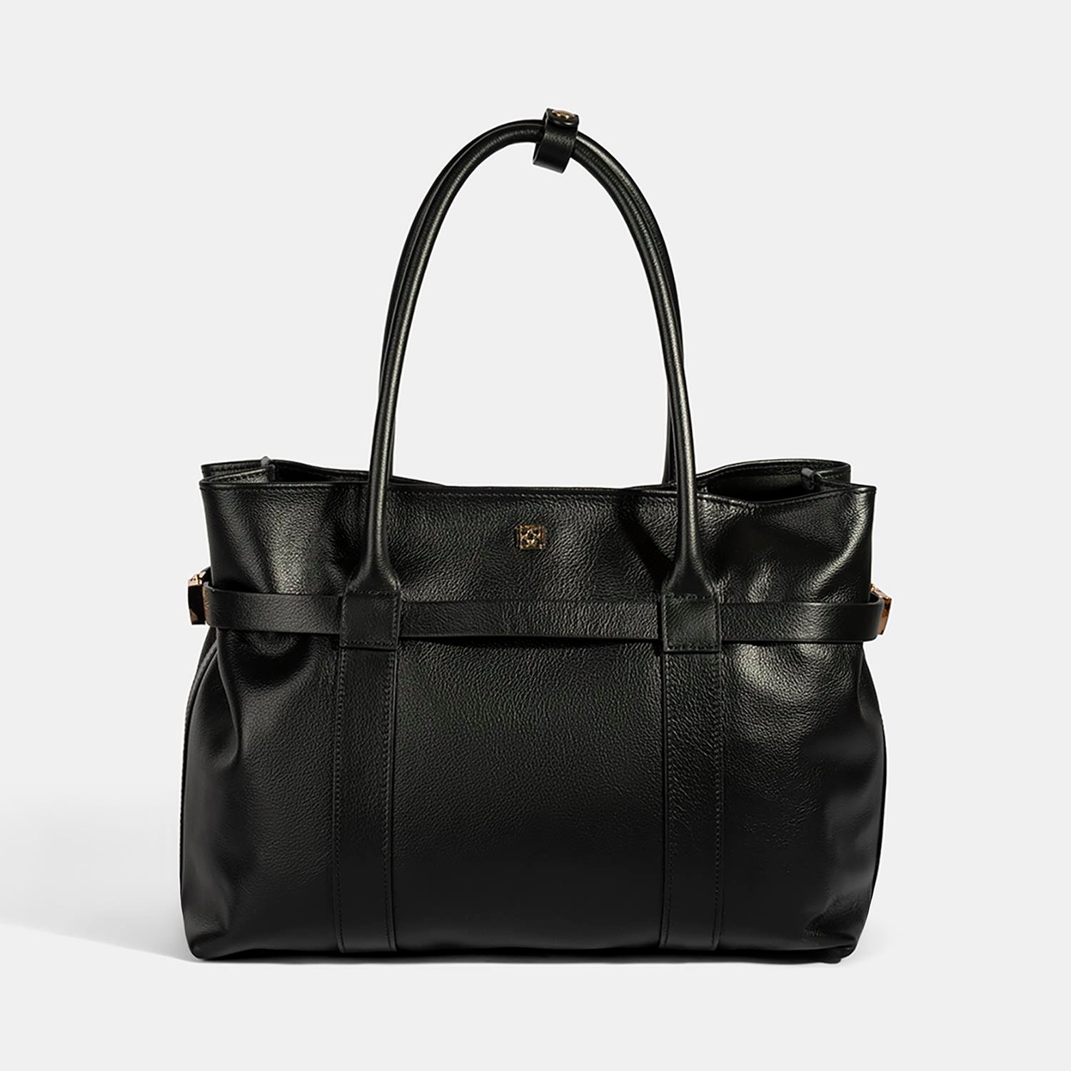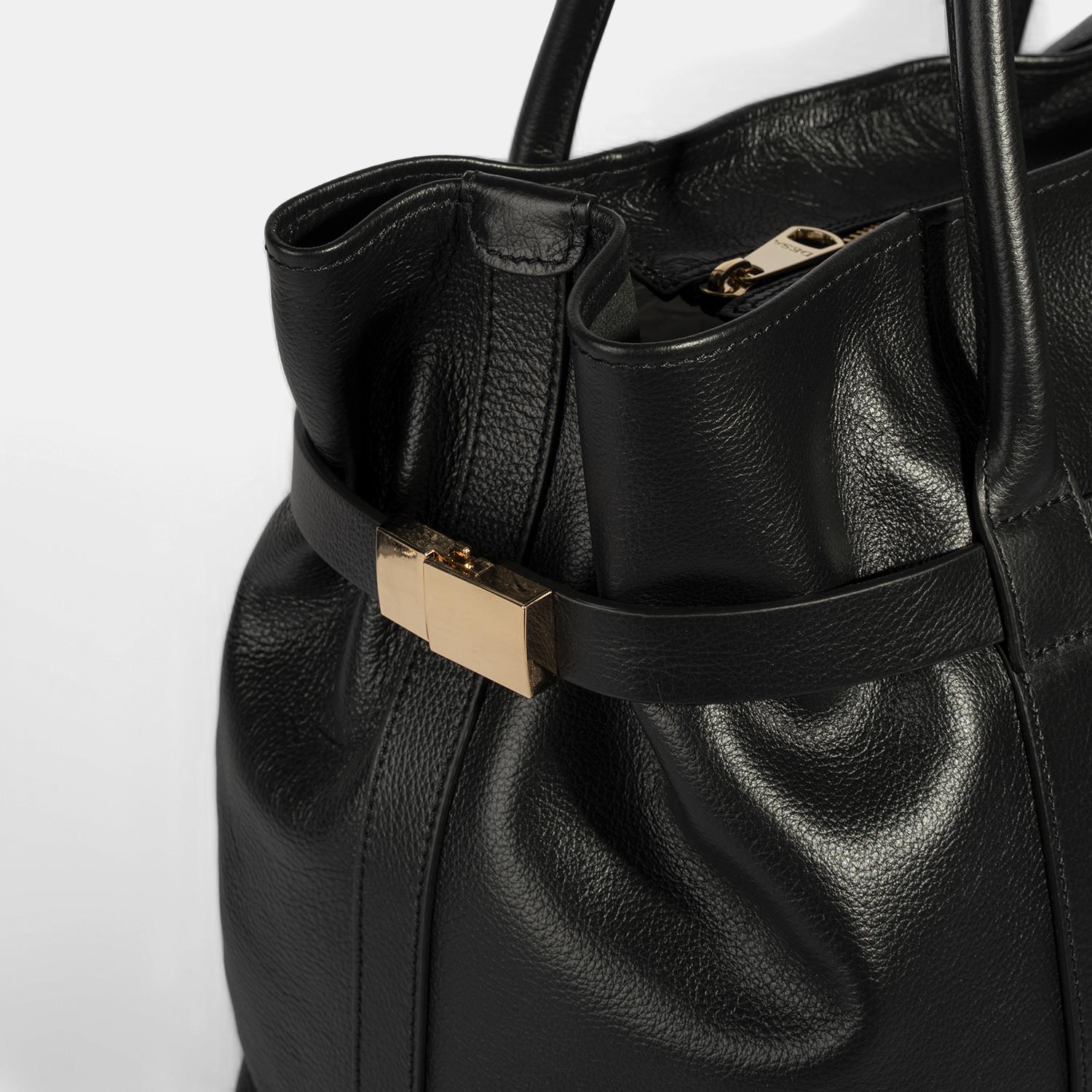 Ön ve arka gövde üzerinde yer alan dekoratif bant detaylarına sabitlenmiş iki kemer parçası, kutu kilit sistemiyle birleştirilerek çantanın formunun isteğe bağlı olarak daraltılıp genişletilebilmesini sağlar.