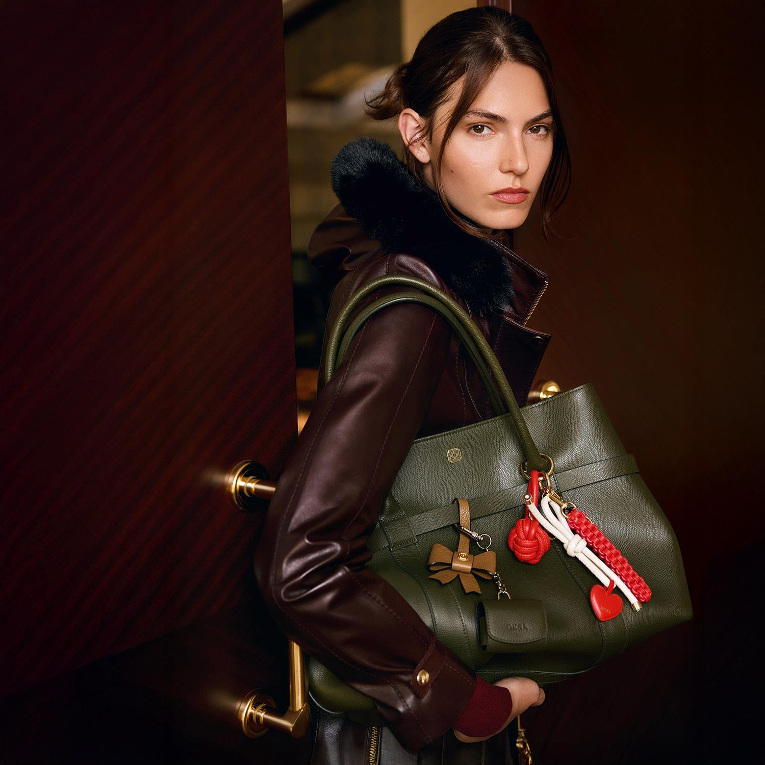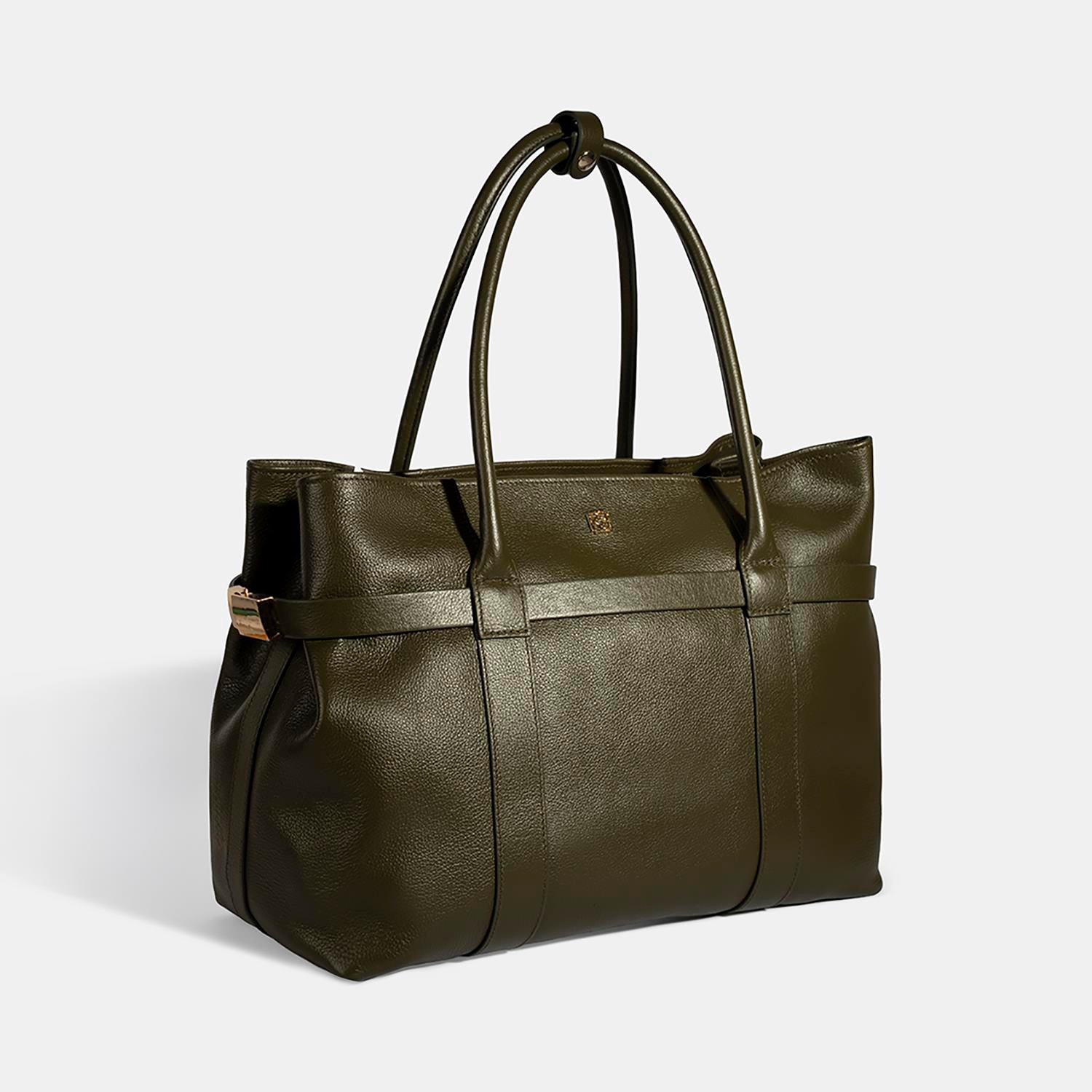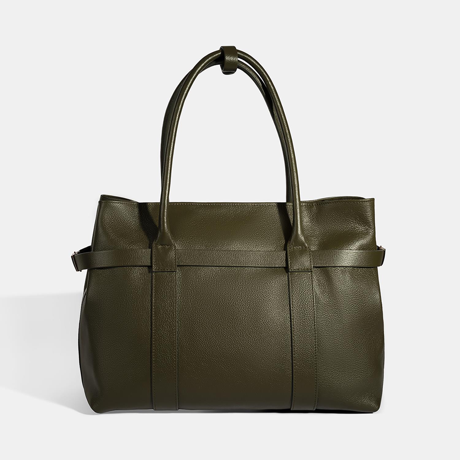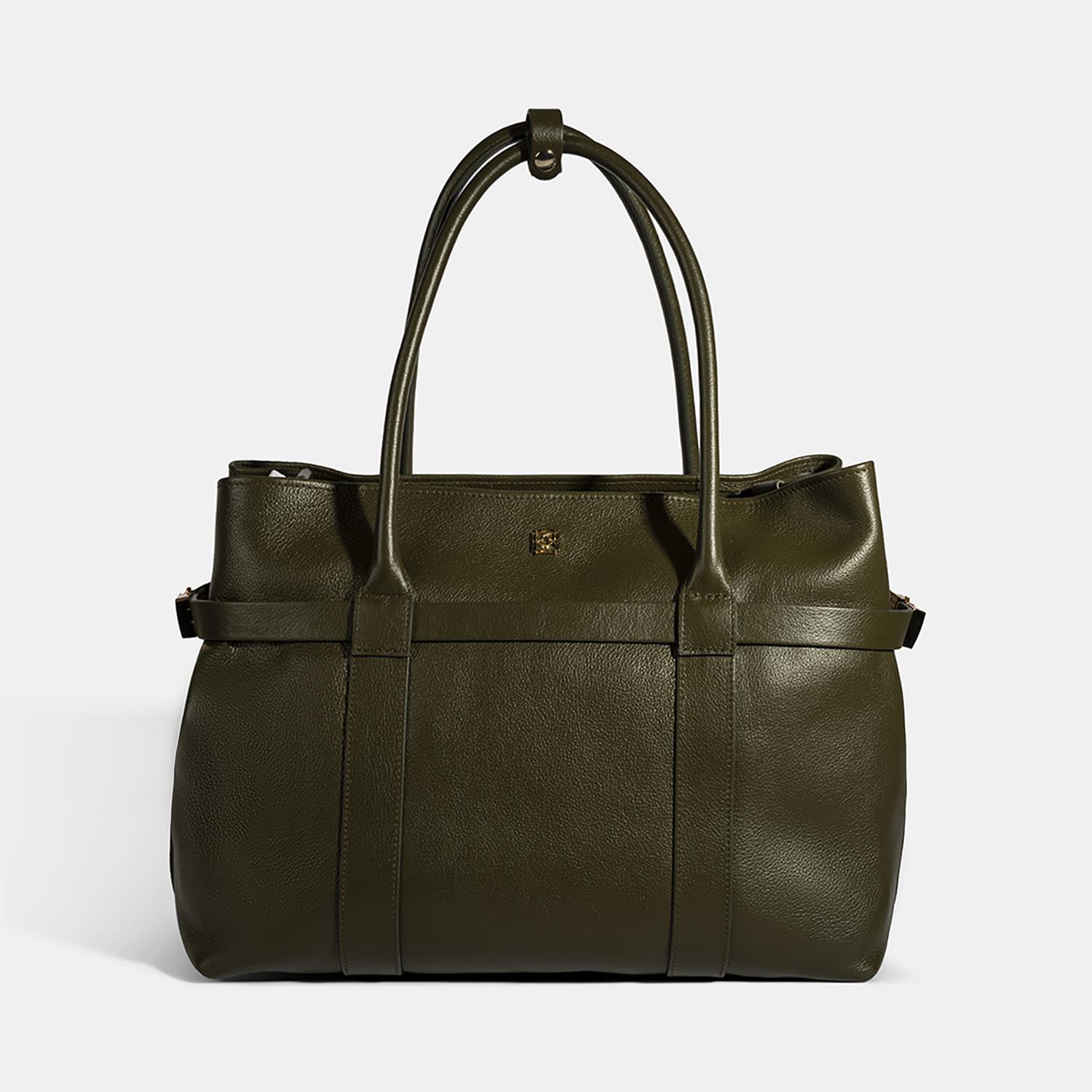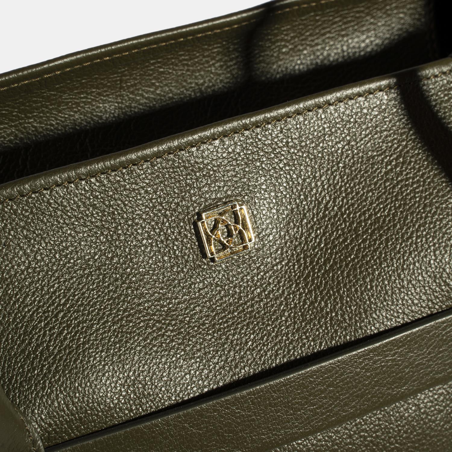 Ön ve arka gövde üzerinde yer alan dekoratif bant detaylarına sabitlenmiş iki kemer parçası, kutu kilit sistemiyle birleştirilerek çantanın formunun isteğe bağlı olarak daraltılıp genişletilebilmesini sağlar.