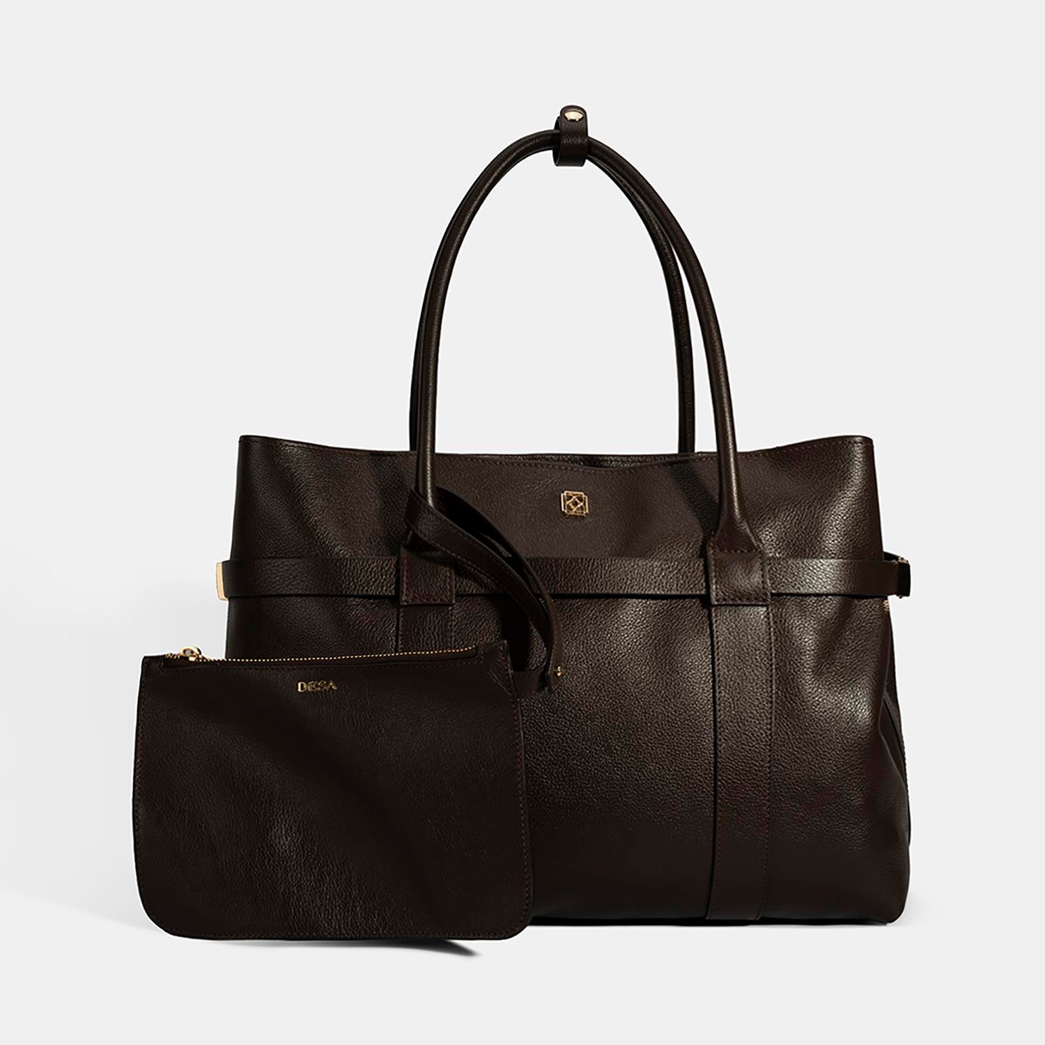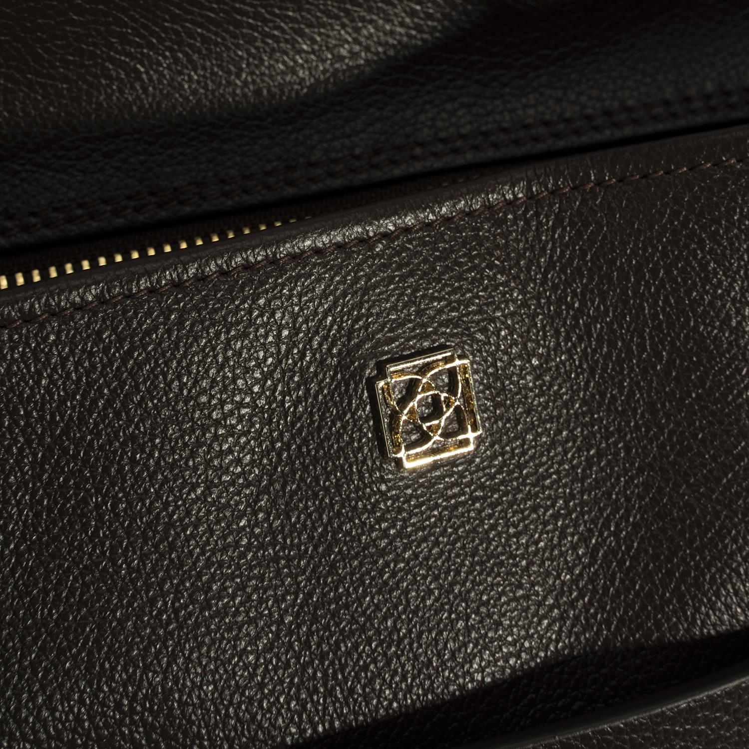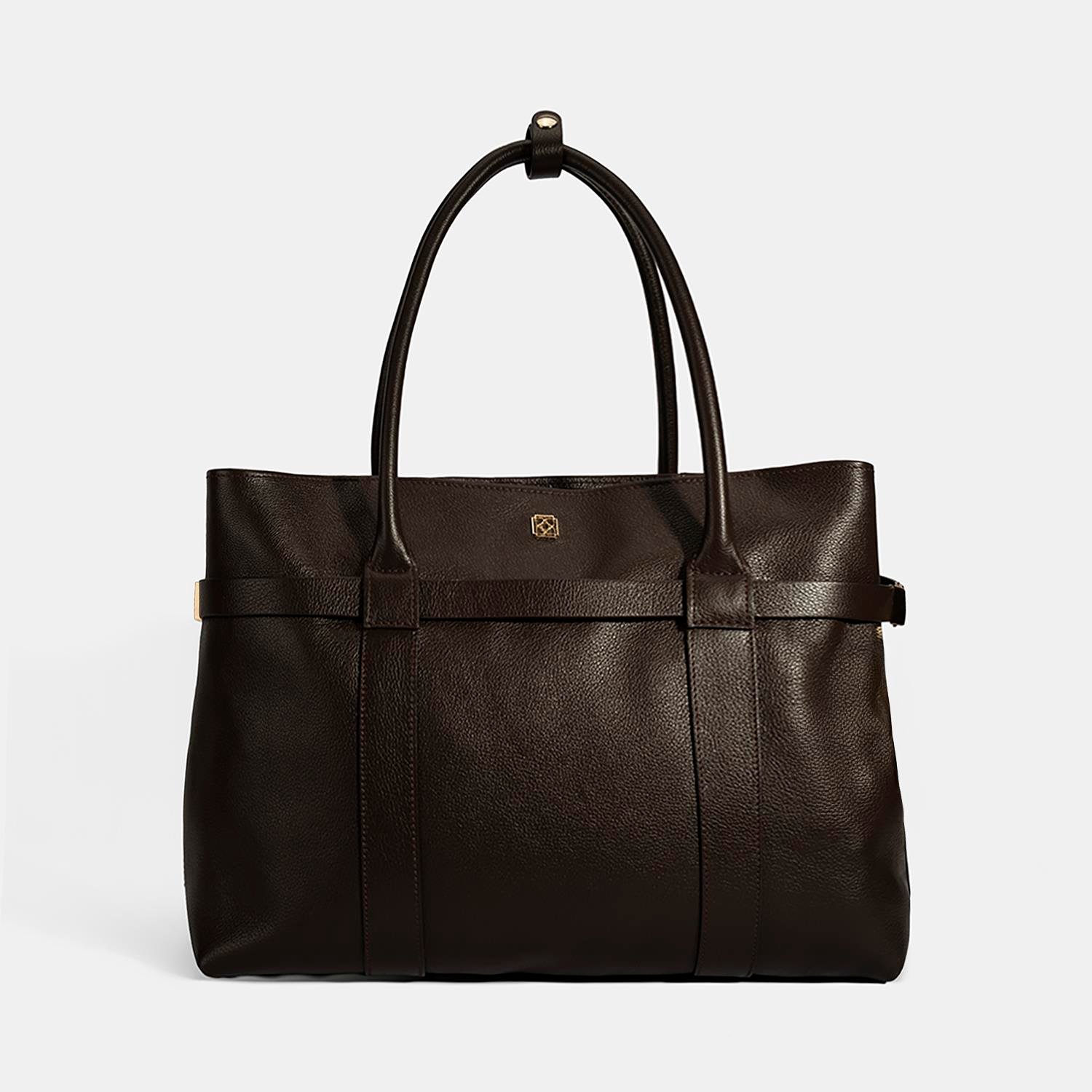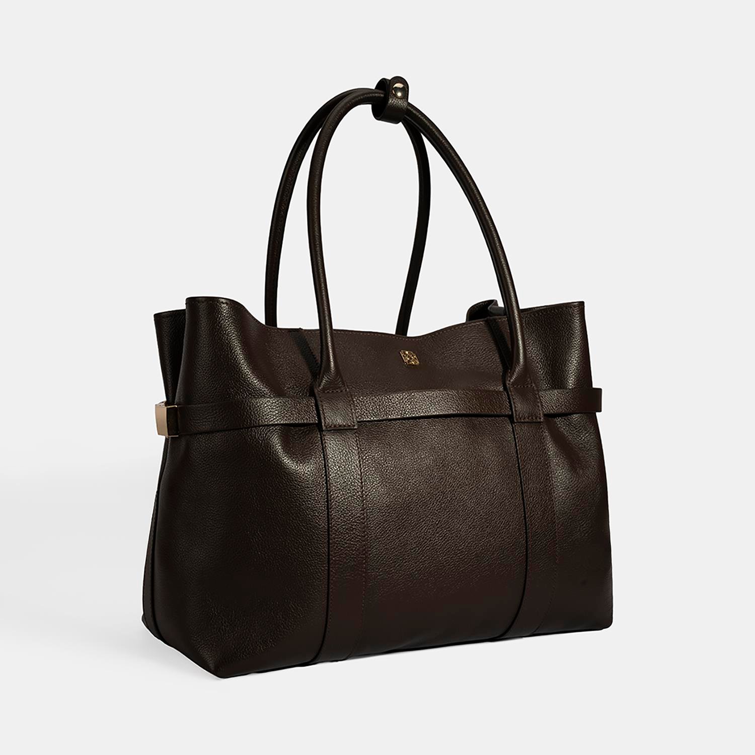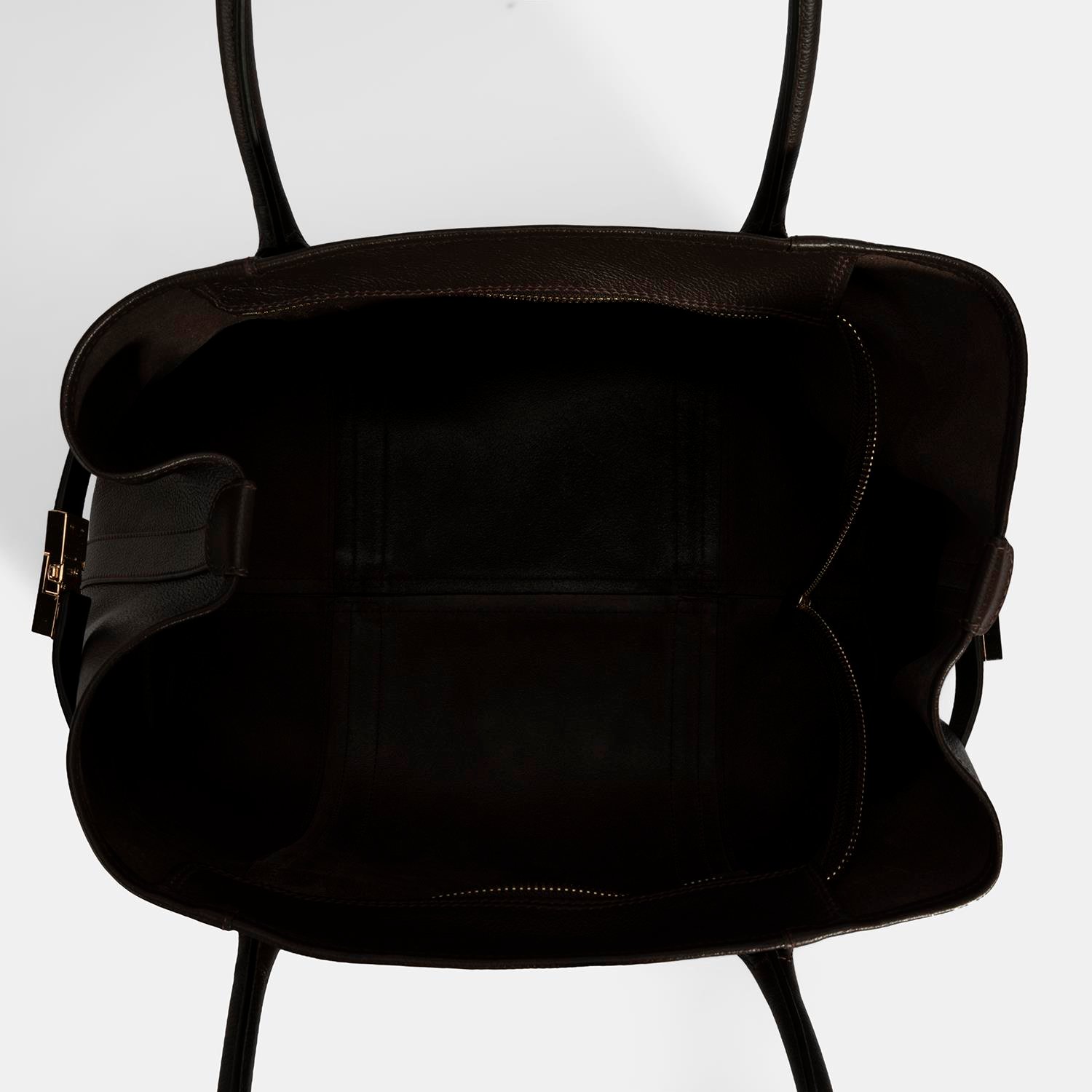 Ön ve arka gövde üzerinde yer alan dekoratif bant detaylarına sabitlenmiş iki kemer parçası, kutu kilit sistemiyle birleştirilerek çantanın formunun isteğe bağlı olarak daraltılıp genişletilebilmesini sağlar.