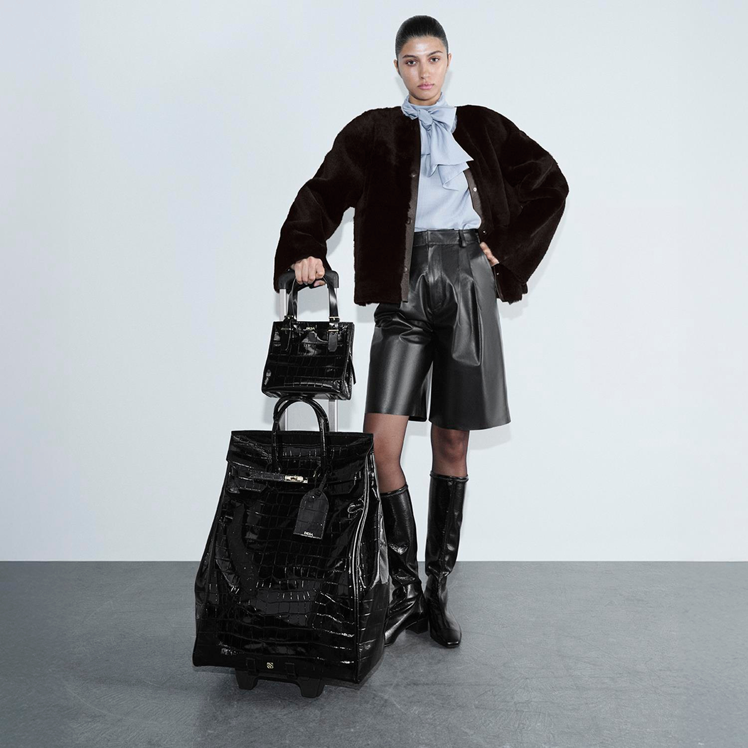 Siyah Kroko Baskılı Rugan Deri Kabin Valiz