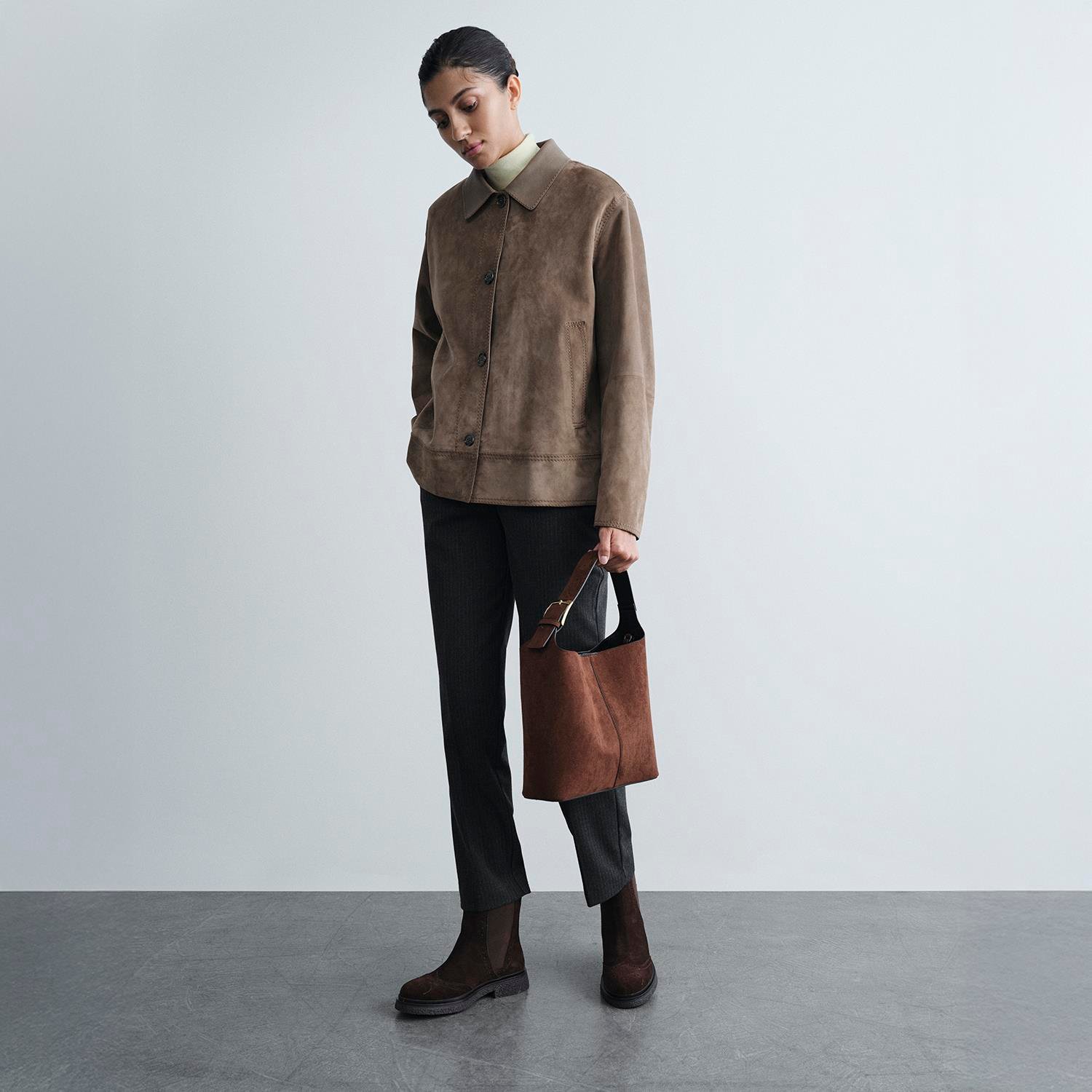 Suni süet dış yüzeyi, çantaya zarif bir görünüm kazandırırken, dayanıklı yapısıyla uzun süreli kullanım sağlar.