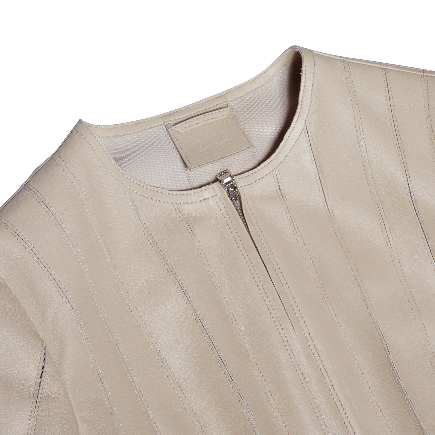 Kadın vücut anatomisini vurgulamak için; esneyen tül ile desteğiyle bedene yerleştirilen deriler sayesinde hem rahat hem de fit bir görünüm kazandırılmış, özel deri panel ve tül laminasyon çalışması yapılmıştır.