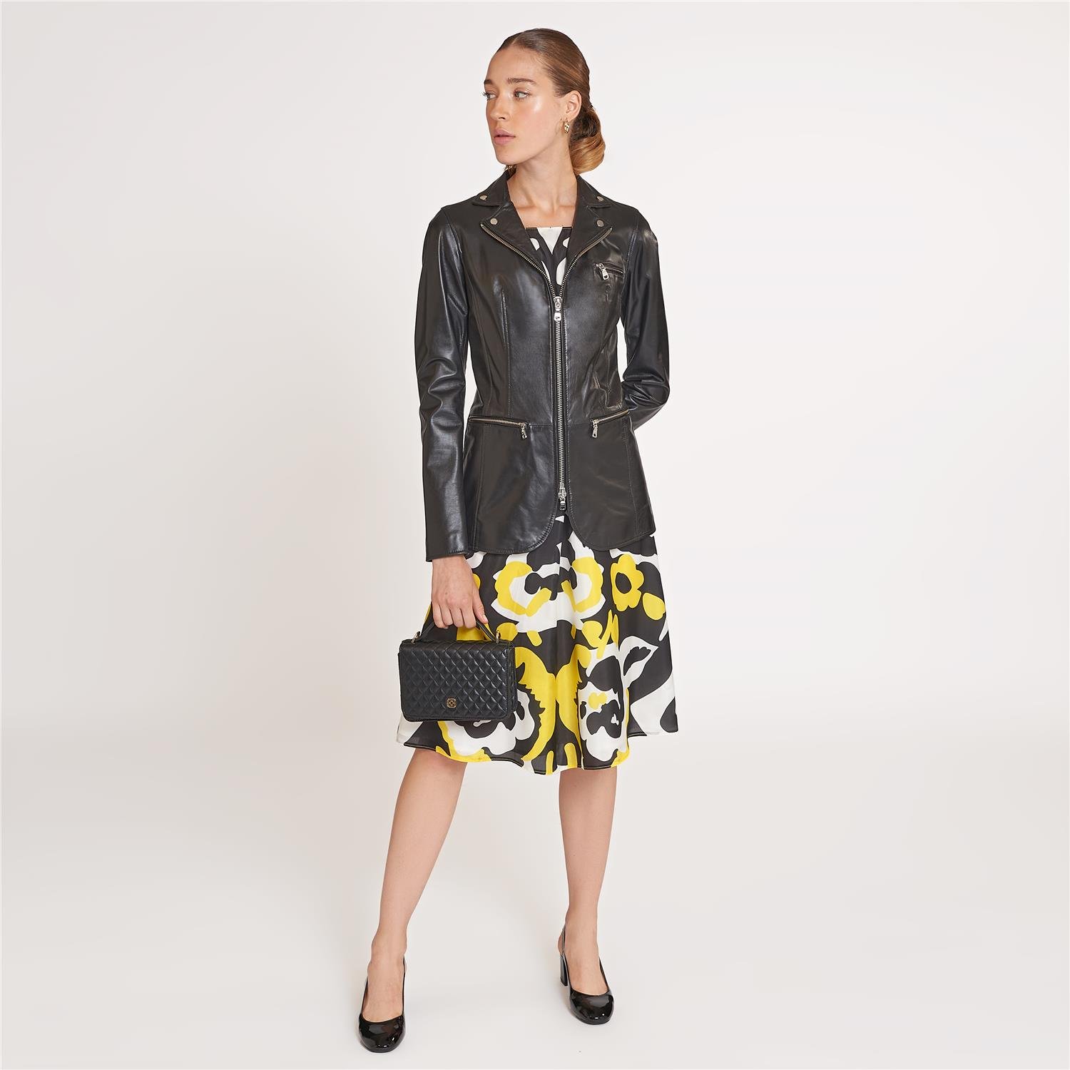 Yakalı, önden metal fermuar kapamalı, kadın deri spor blazer.