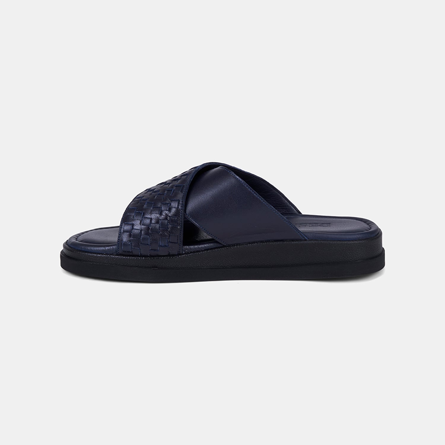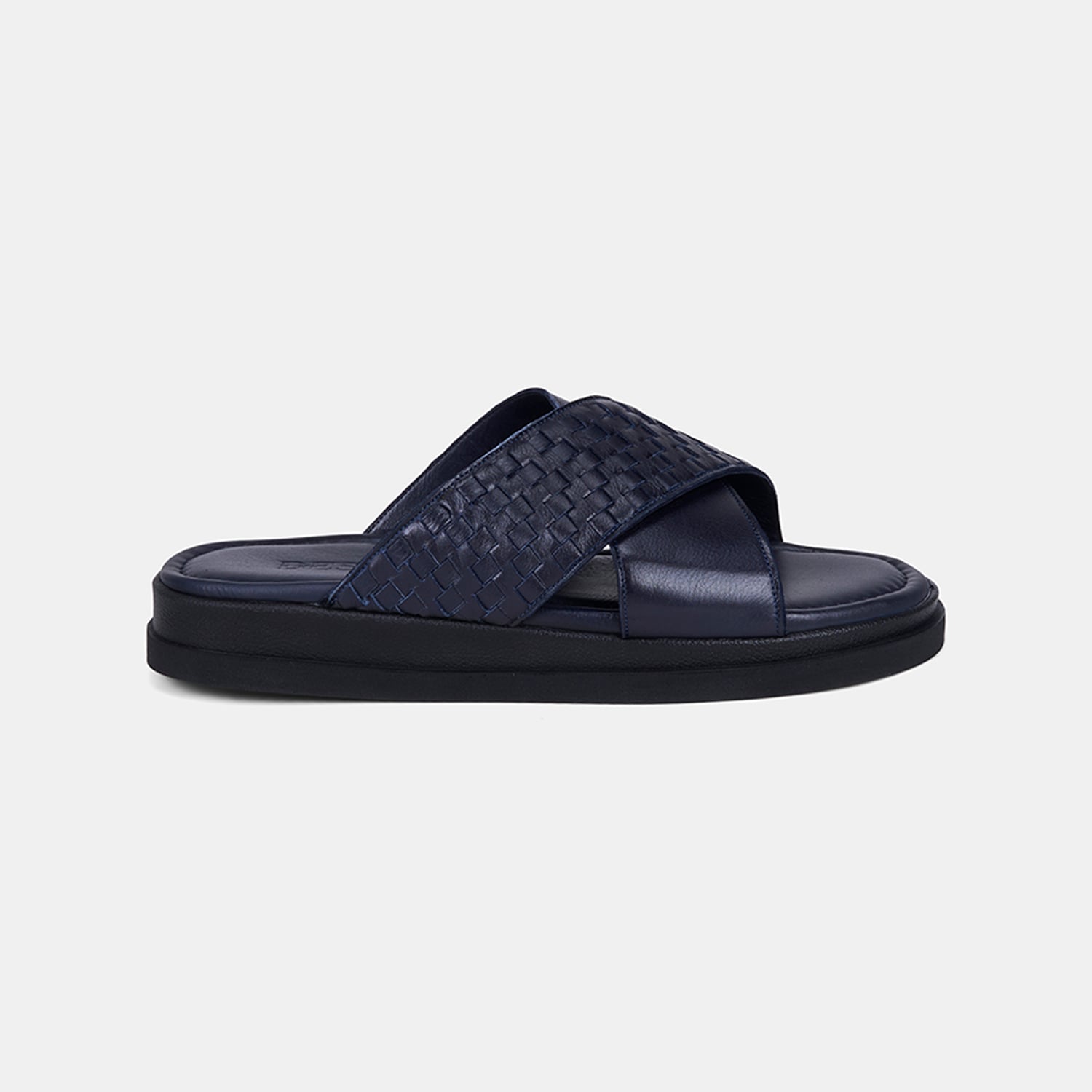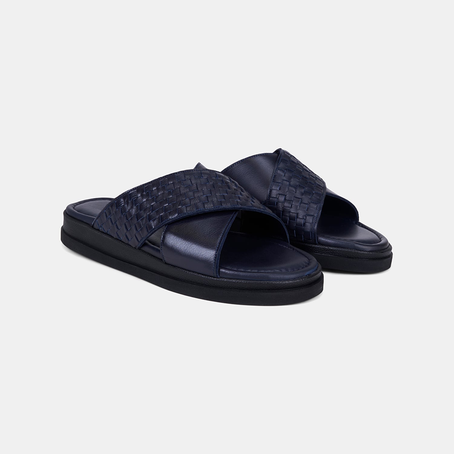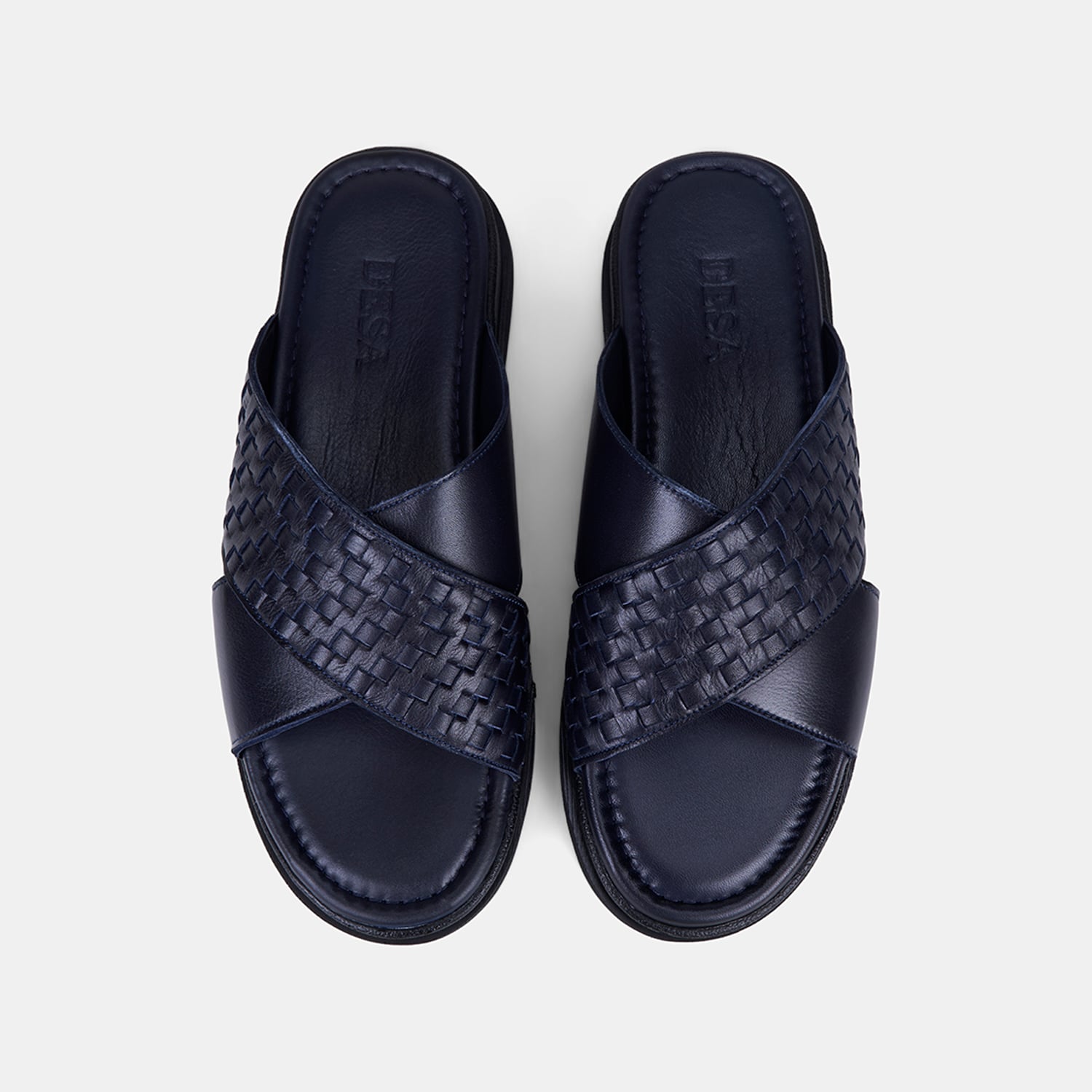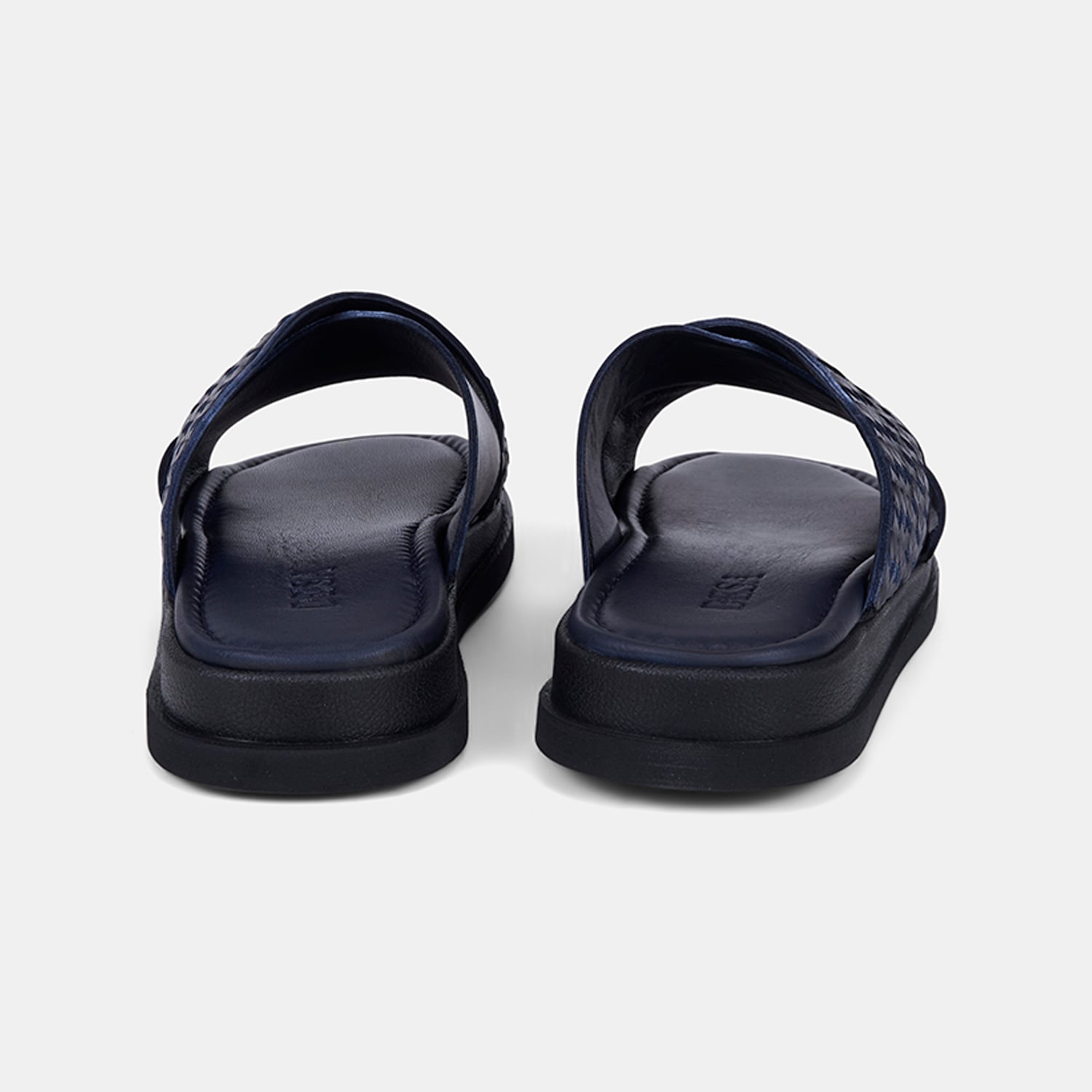 Erkek Lacivert Çapraz Bantlı Baskılı Deri Terlik