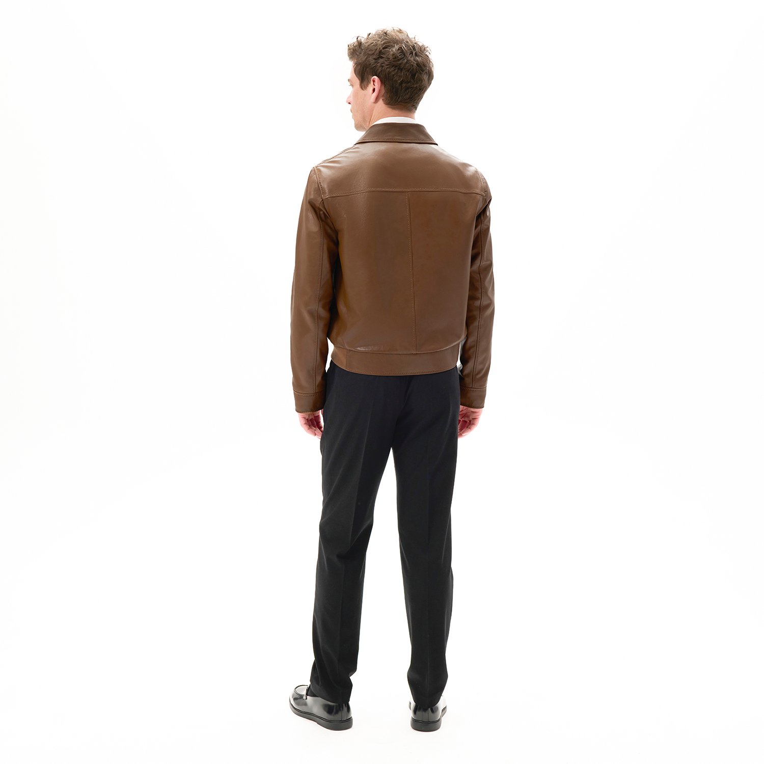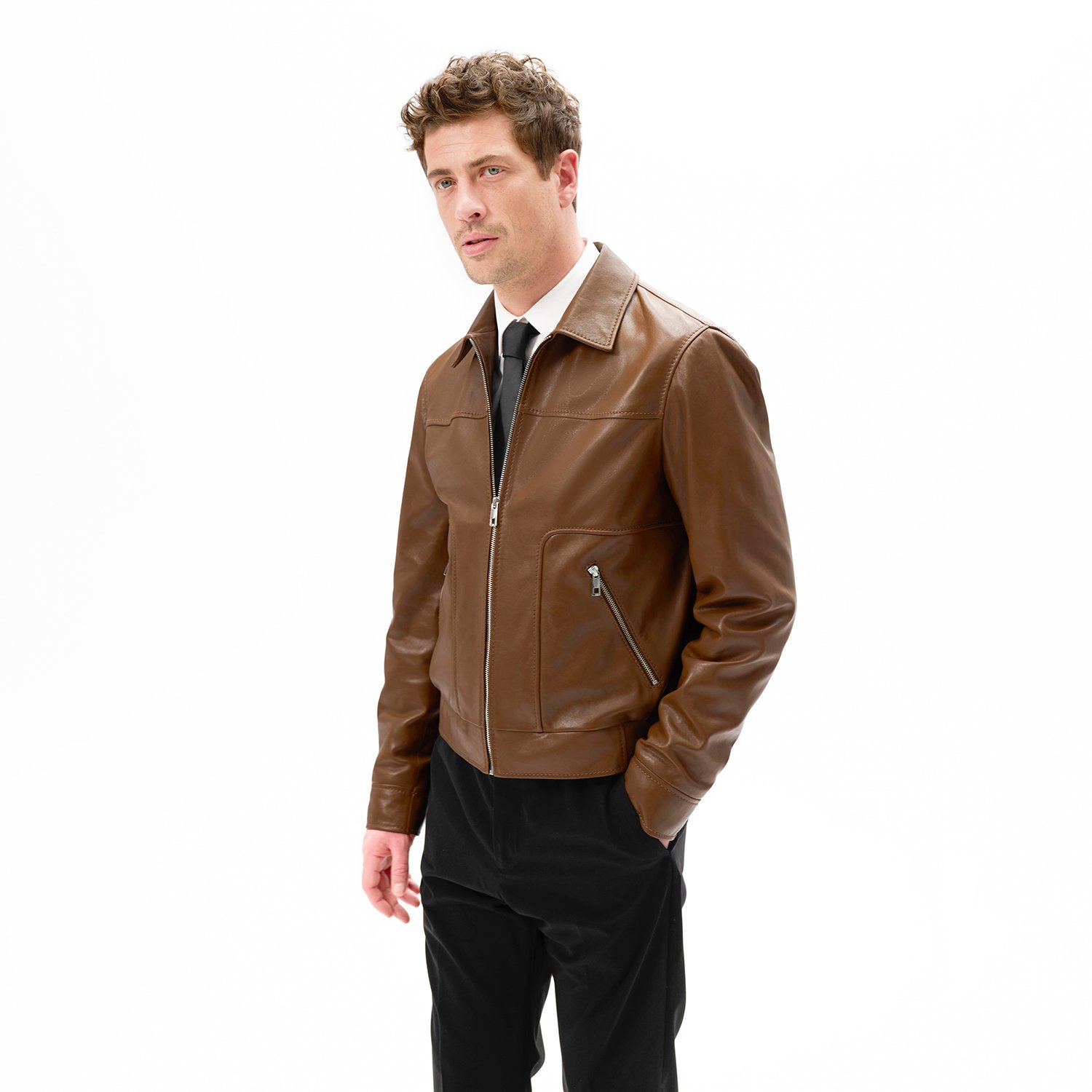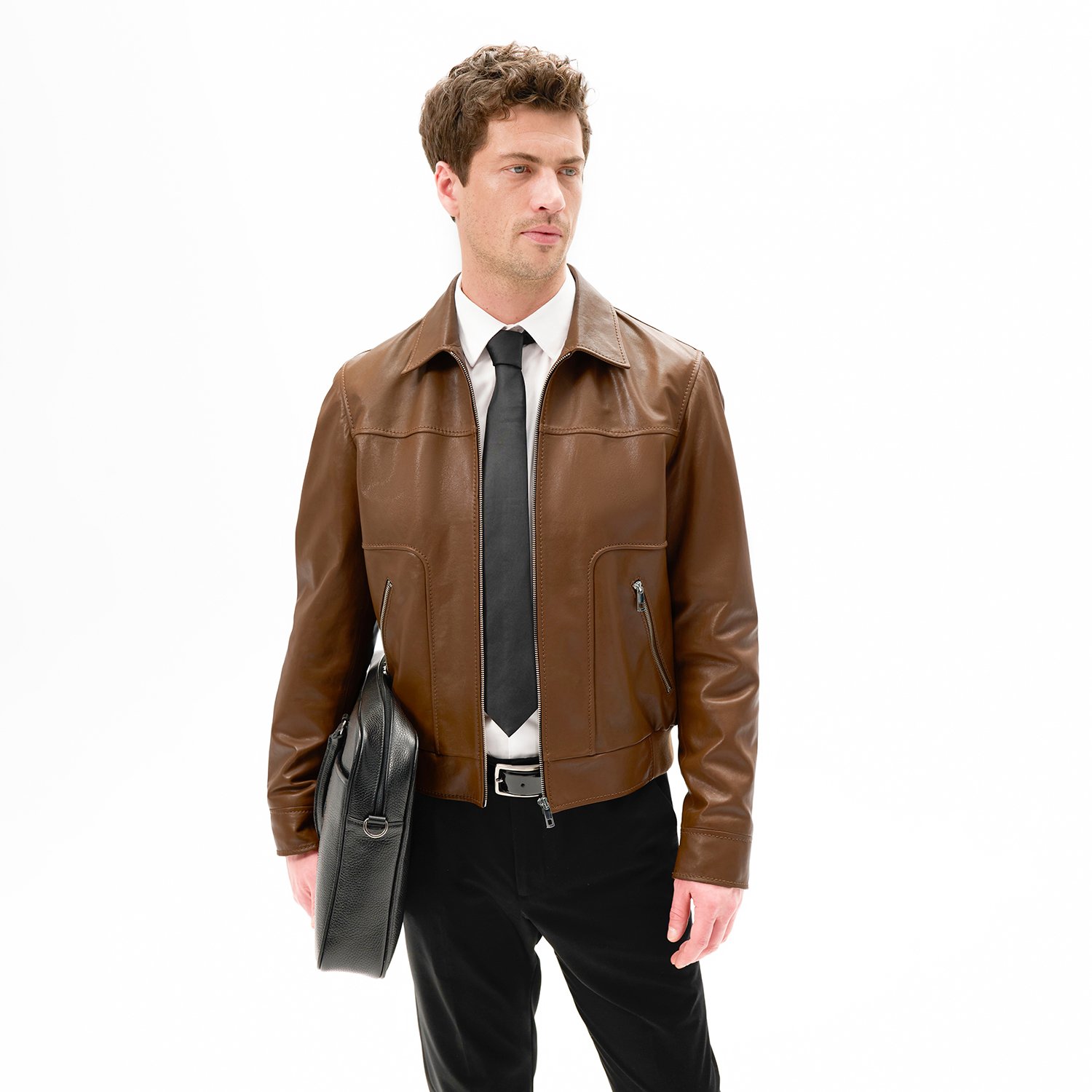 Erkek Taba Fermuarlı Gömlek Yaka Deri Ceket