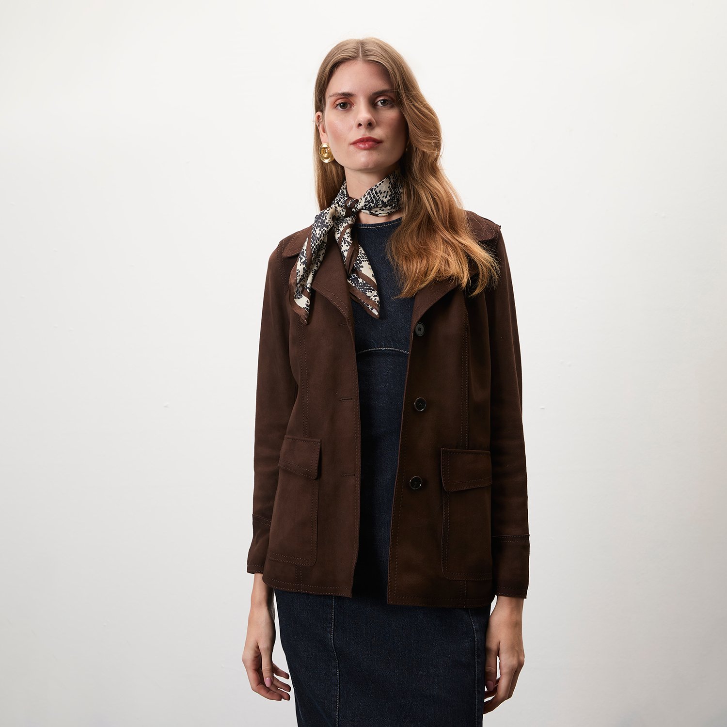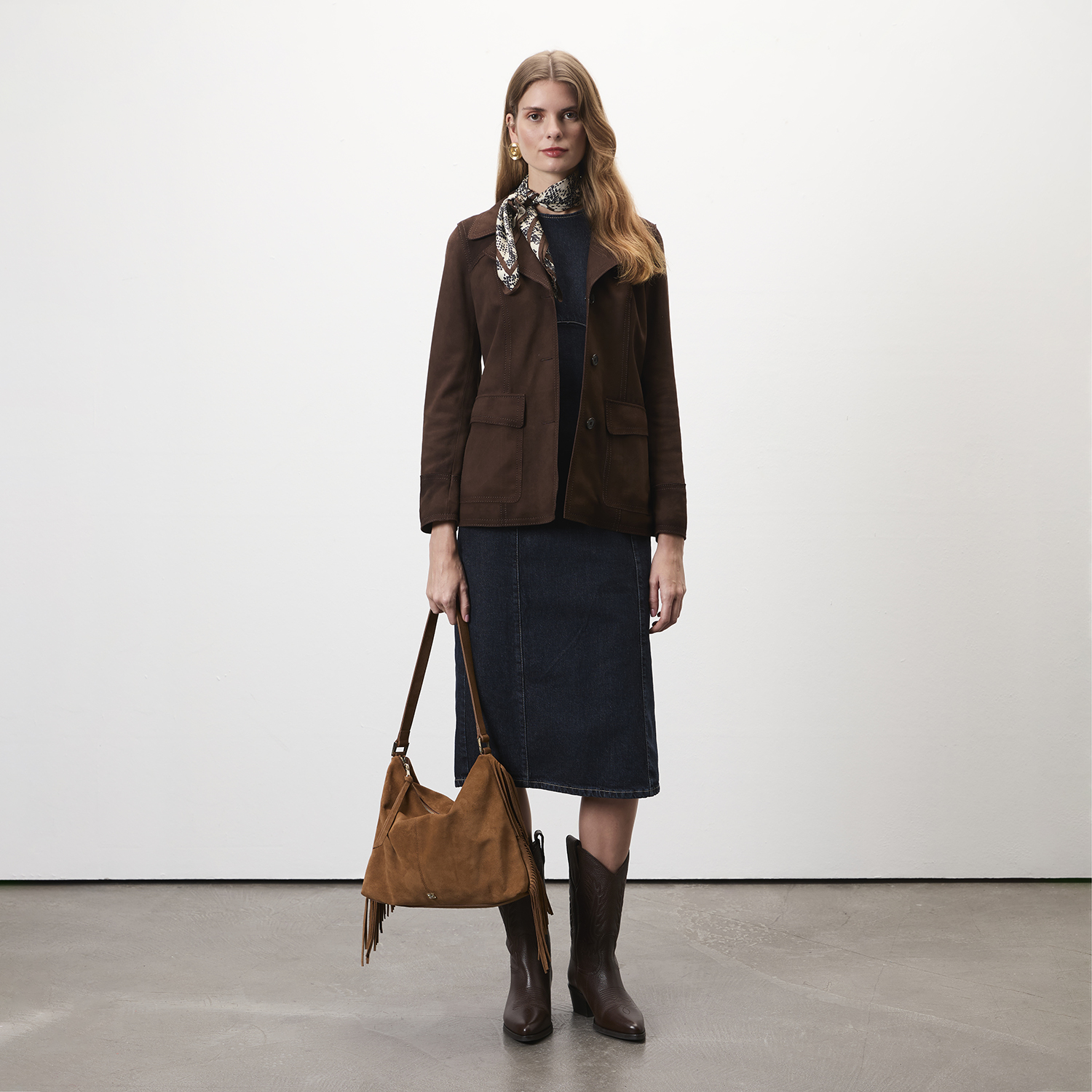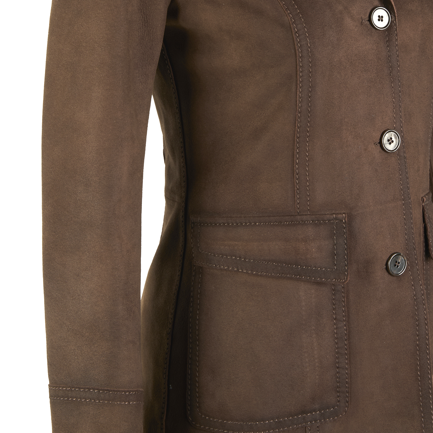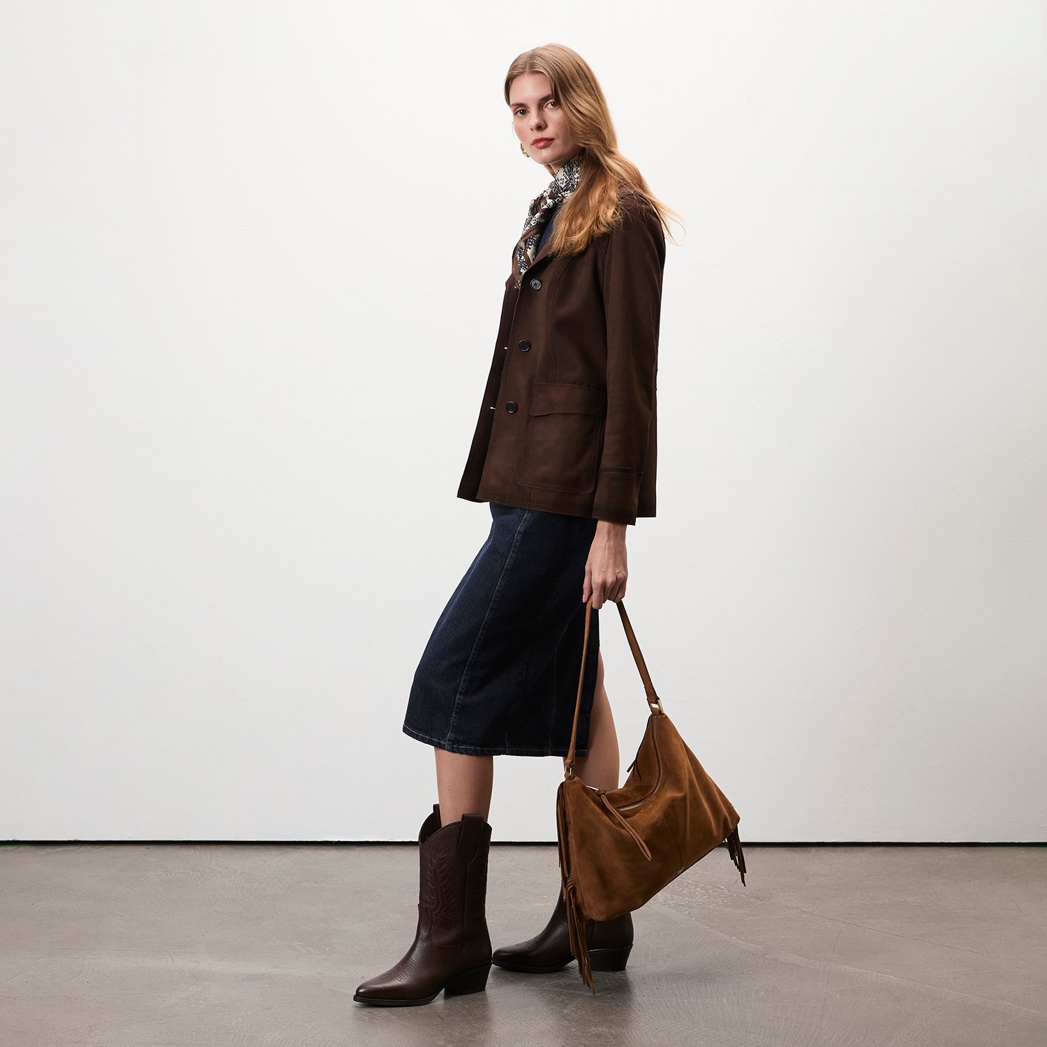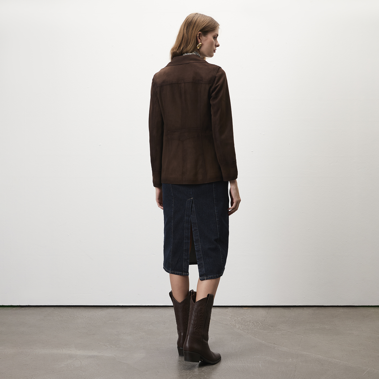 Zengin görünümdeki tonu, sıcak ve doğal bir şıklık yaratırken, yumuşak süet malzemesi ceketinizin her ortamda öne çıkmasını sağlar.