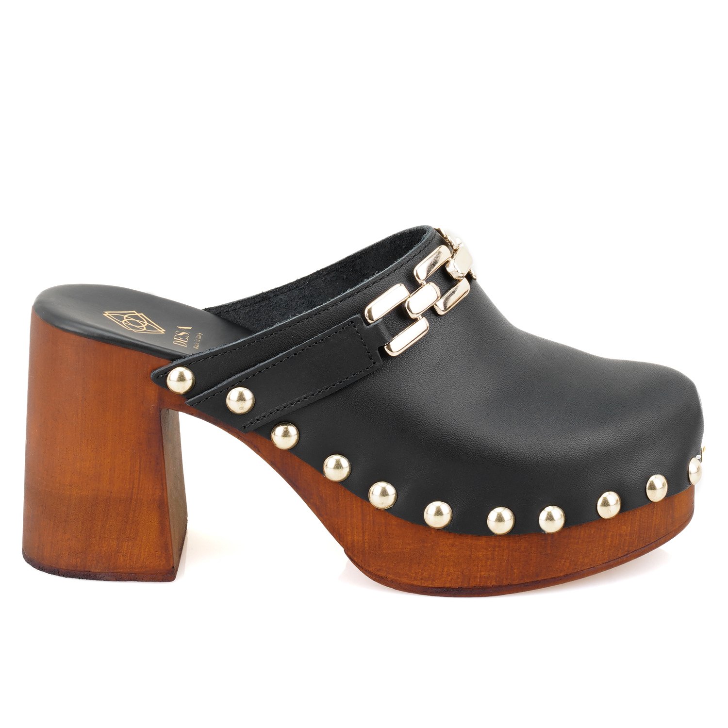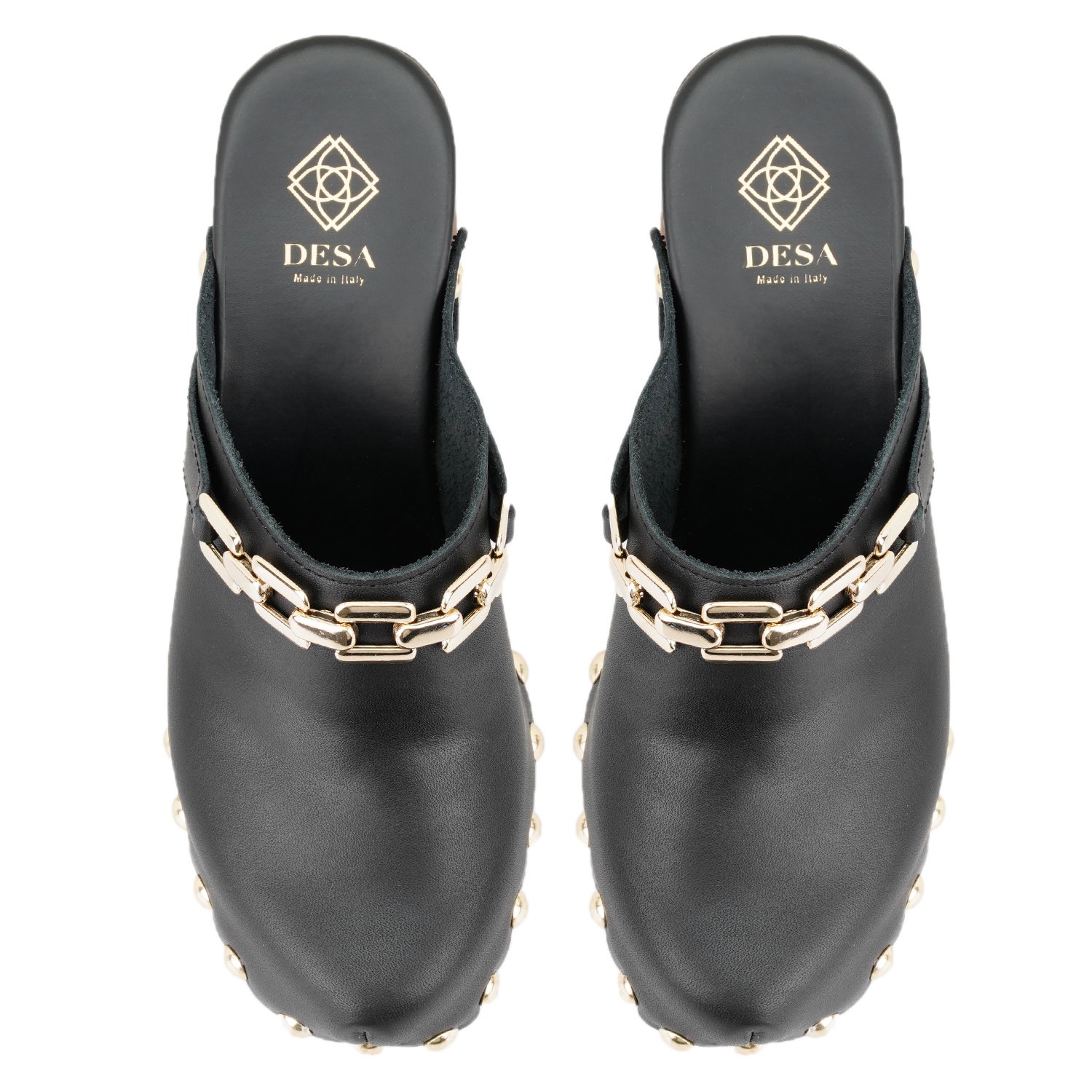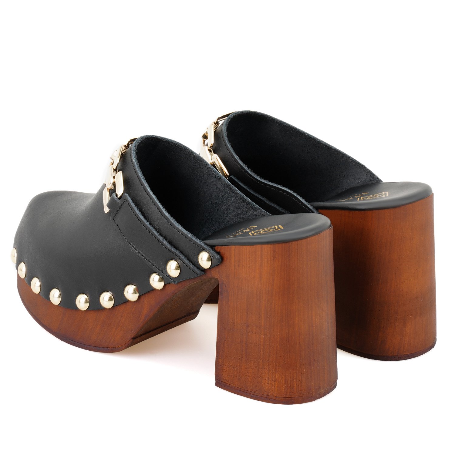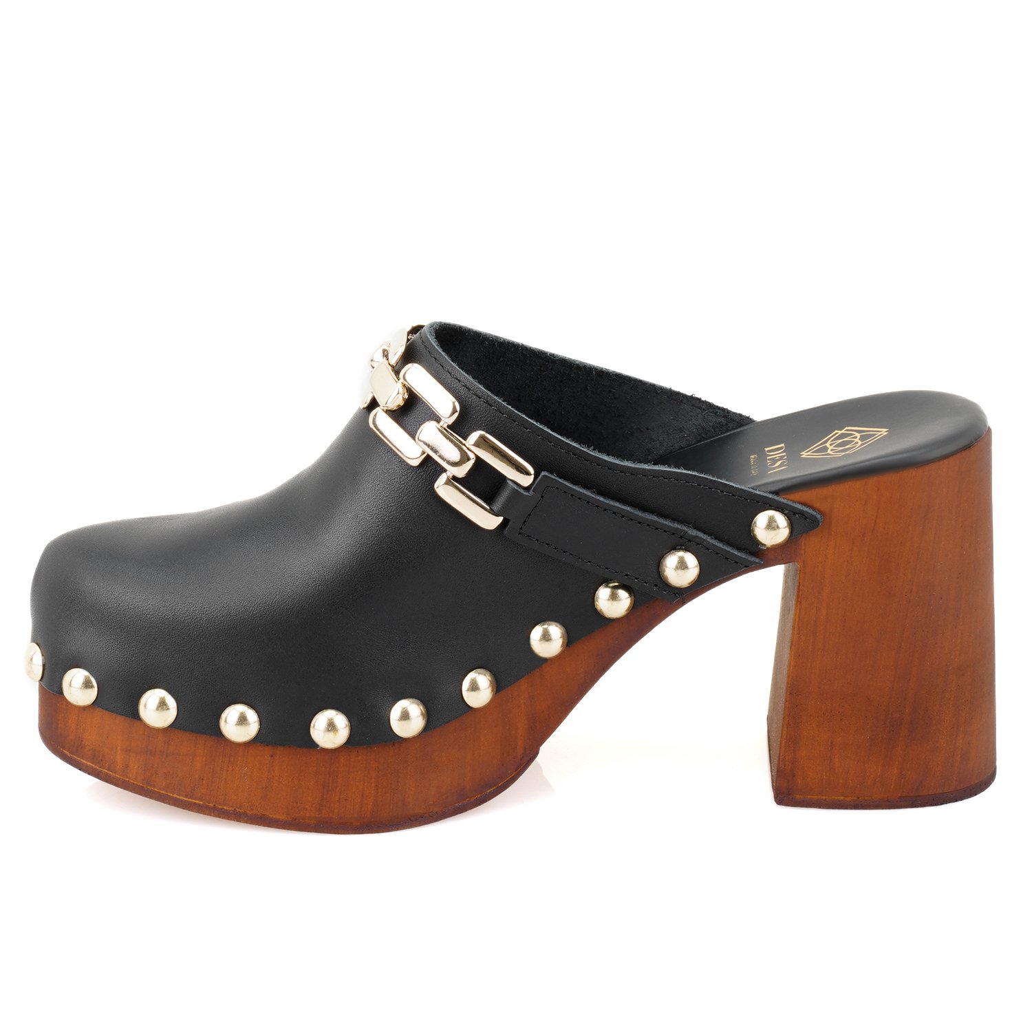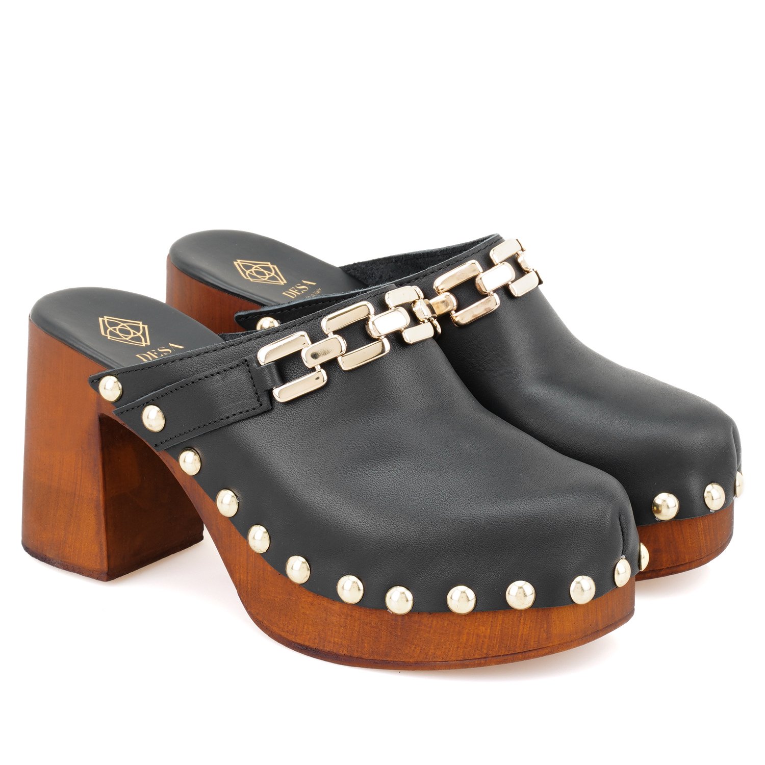 %100 vegetal deri astarsız, pu iç tabanlı, pu tabanlı, metal zincir aksesuar detaylı, topuklu kadın sabo terlik.
