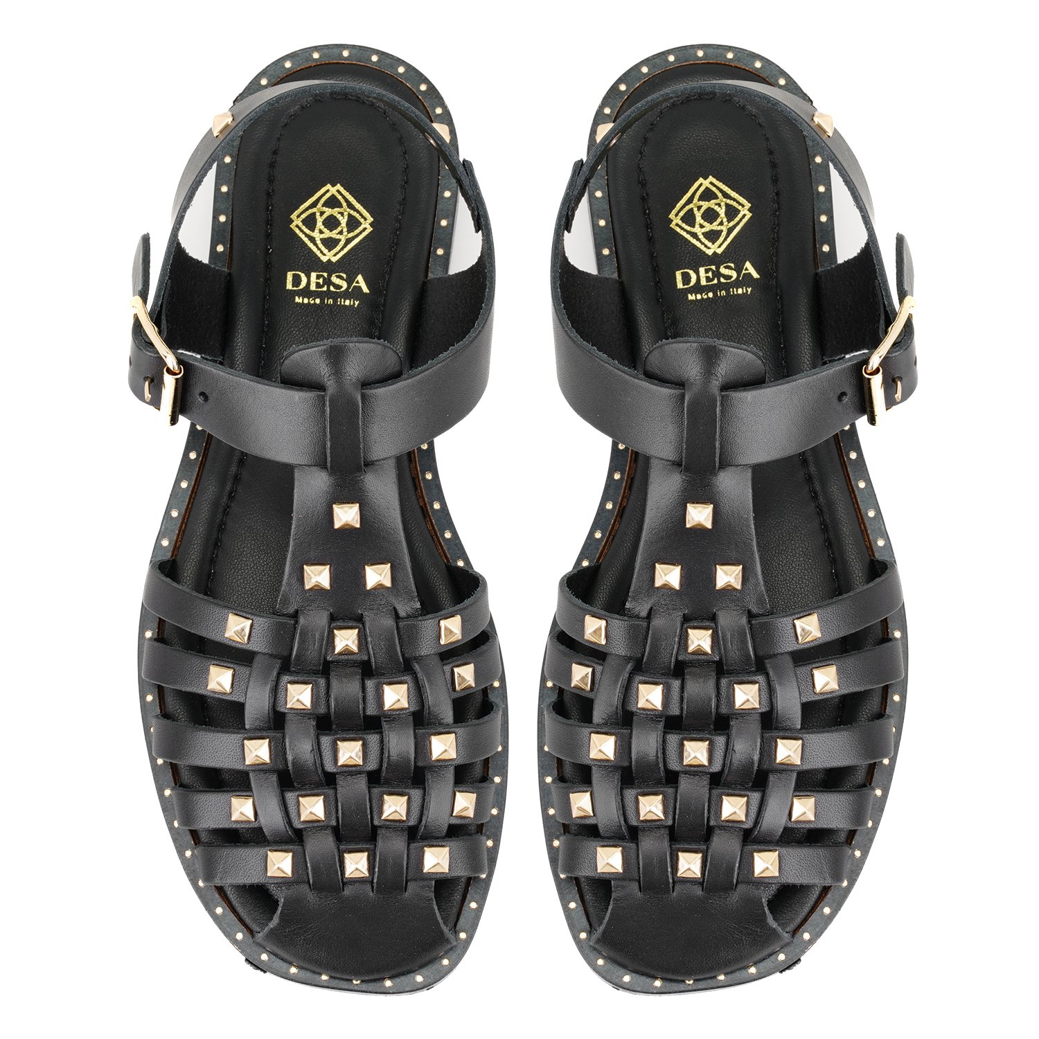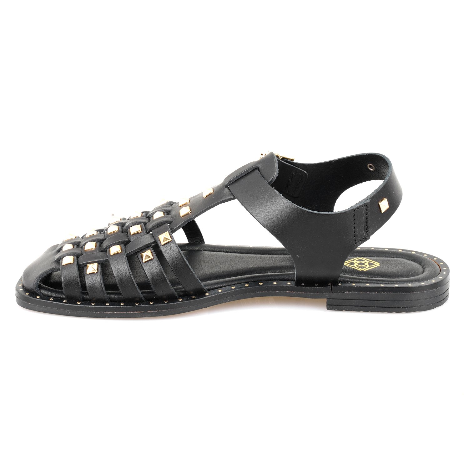 %100 deri, deri iç astarlı, deri iç tabanlı, ayarlanabilir metal tokalı, metal pim detaylı, tpu tabanlı, kadın sandalet. Taban yüksekliği 1.5 cm.