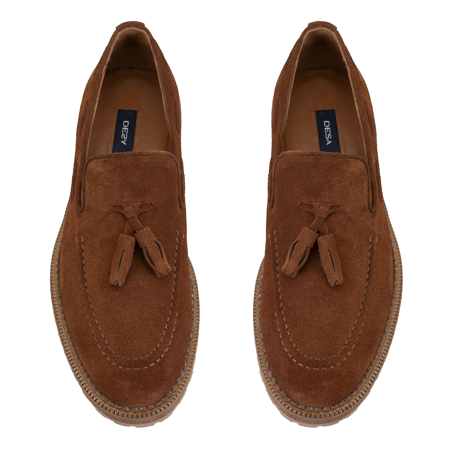 %100 süet deri, deri iç tabanlı, deri astarlı kauçuk tabanlı, erkek püsküllü loafer.