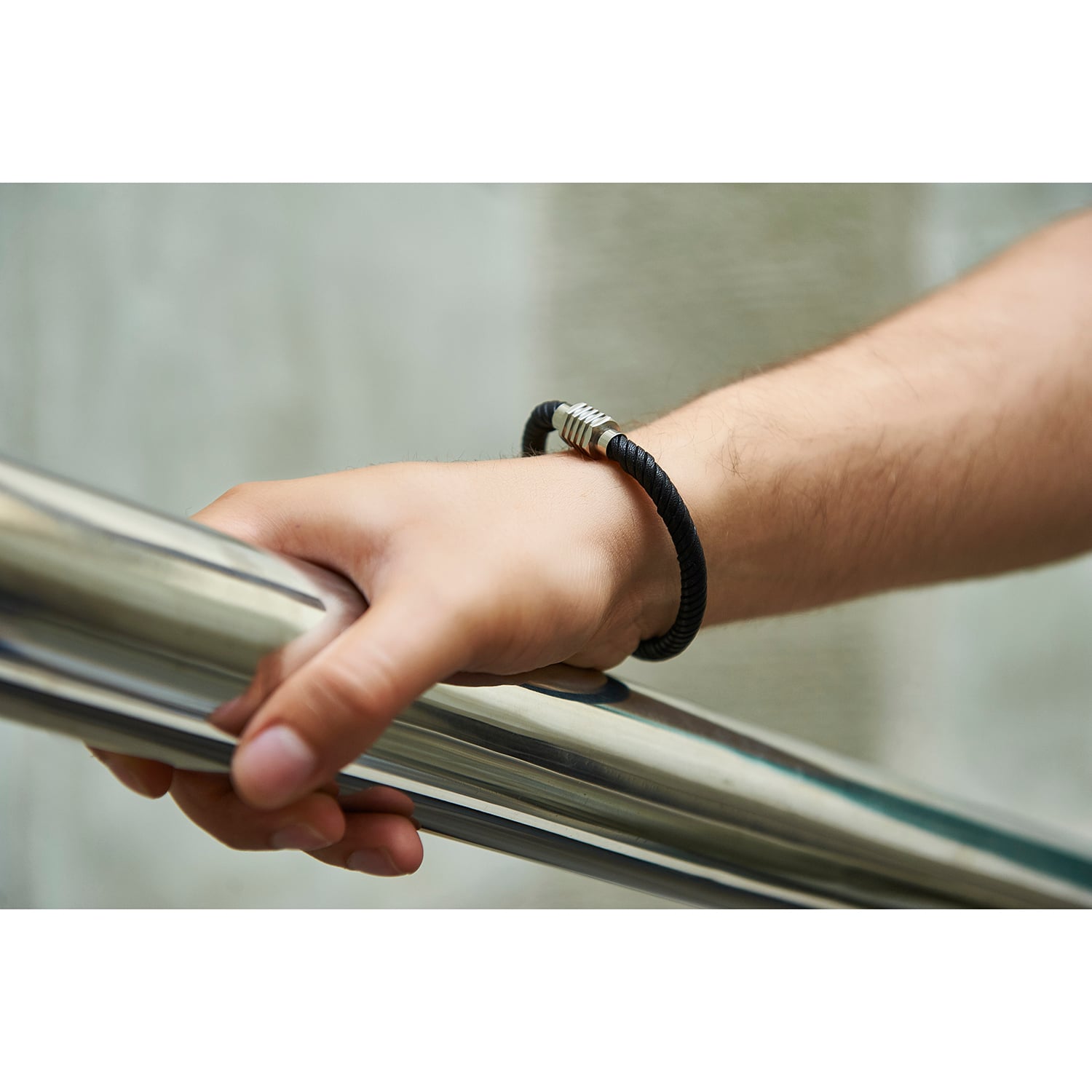 Deri üzeri şekillendirilerek tasarlanan, metal aksesuar kapamalı erkek deri bileklik