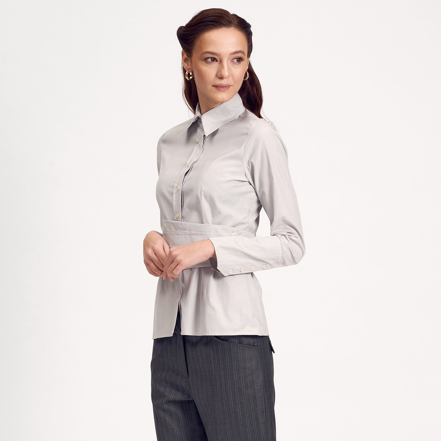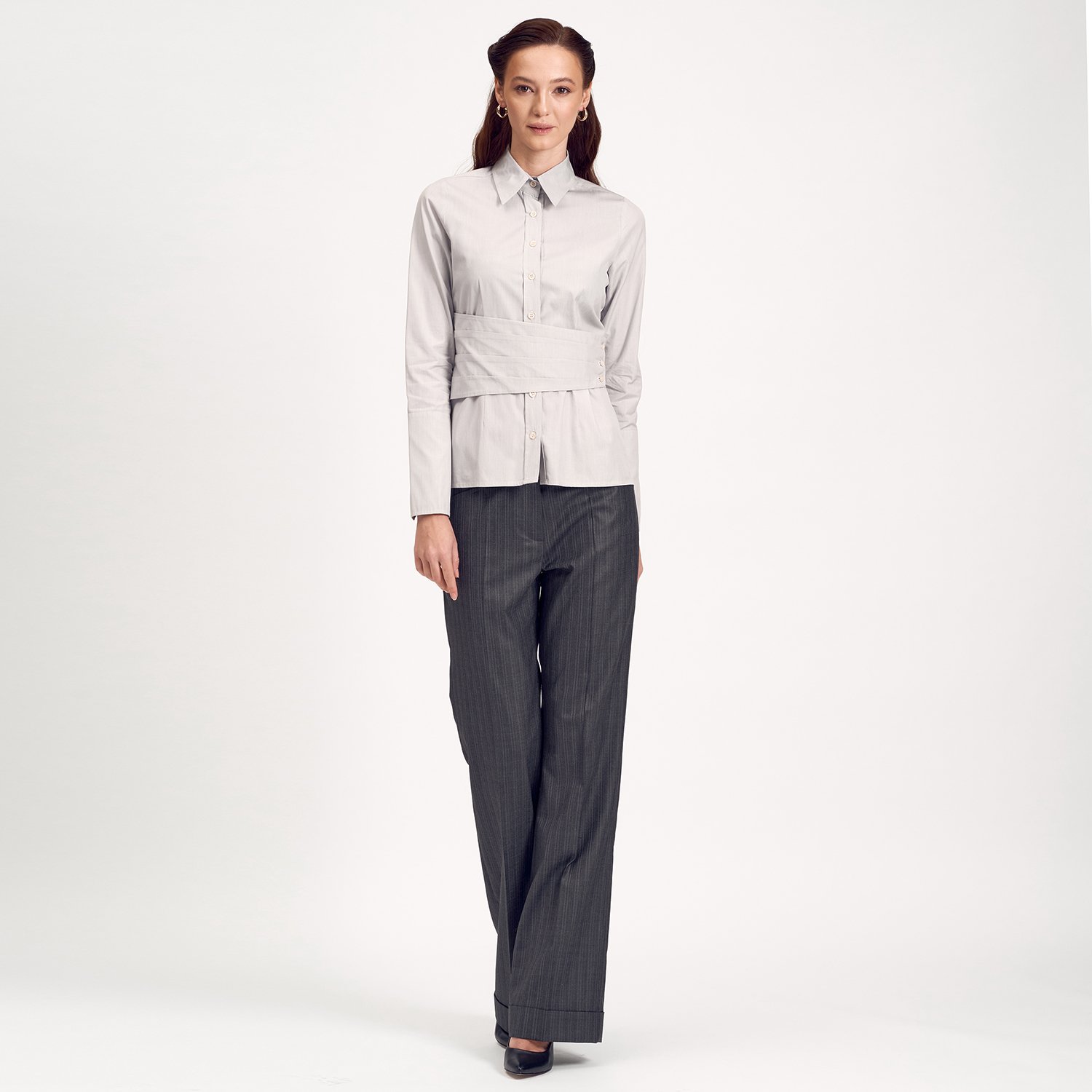 Kendinden ince çizgili, %100 koton kadın gömlek.